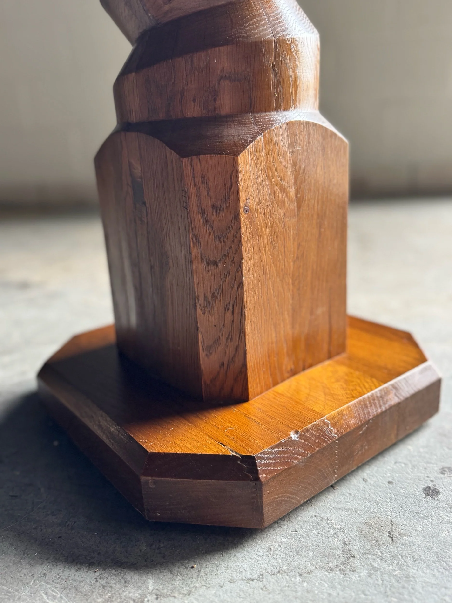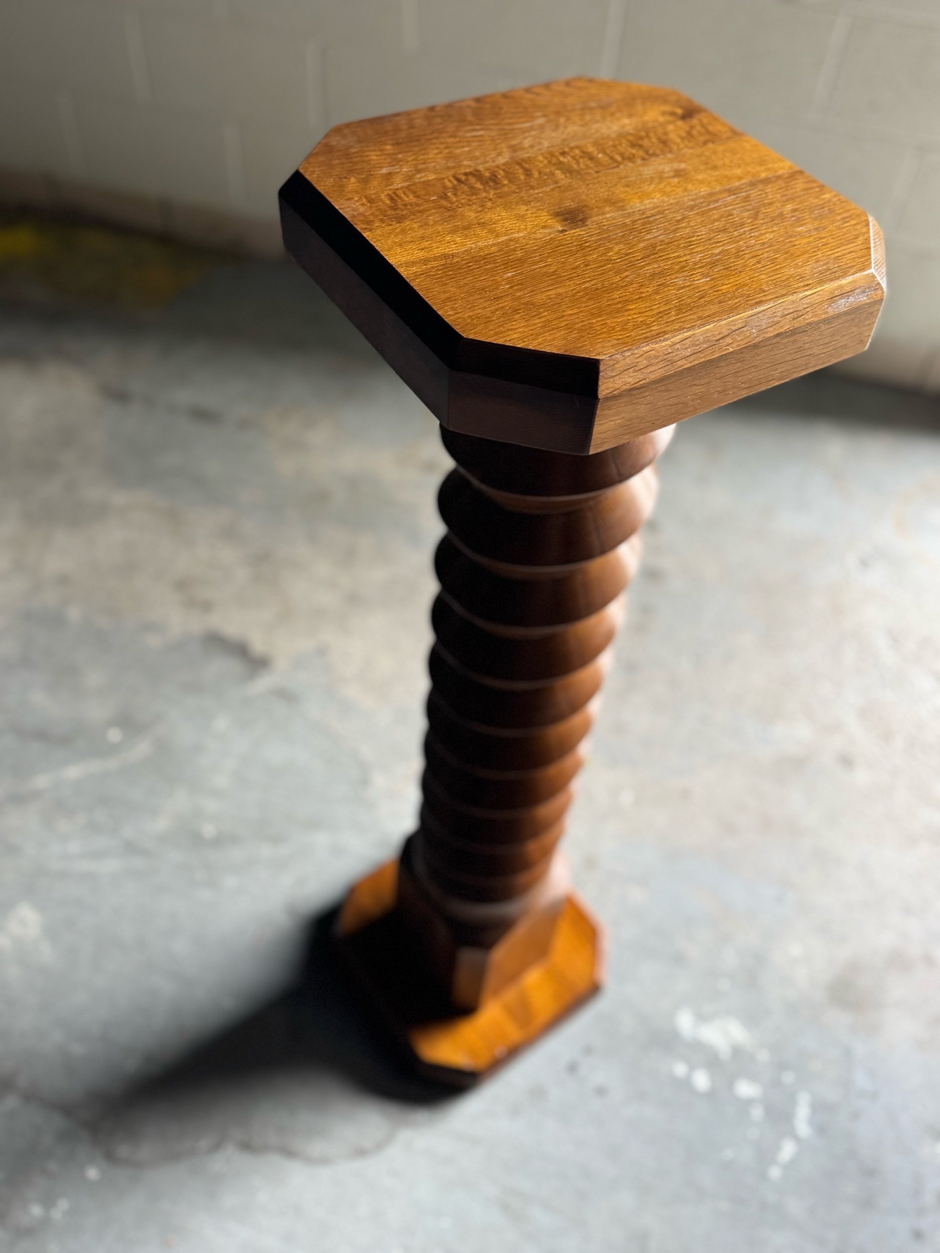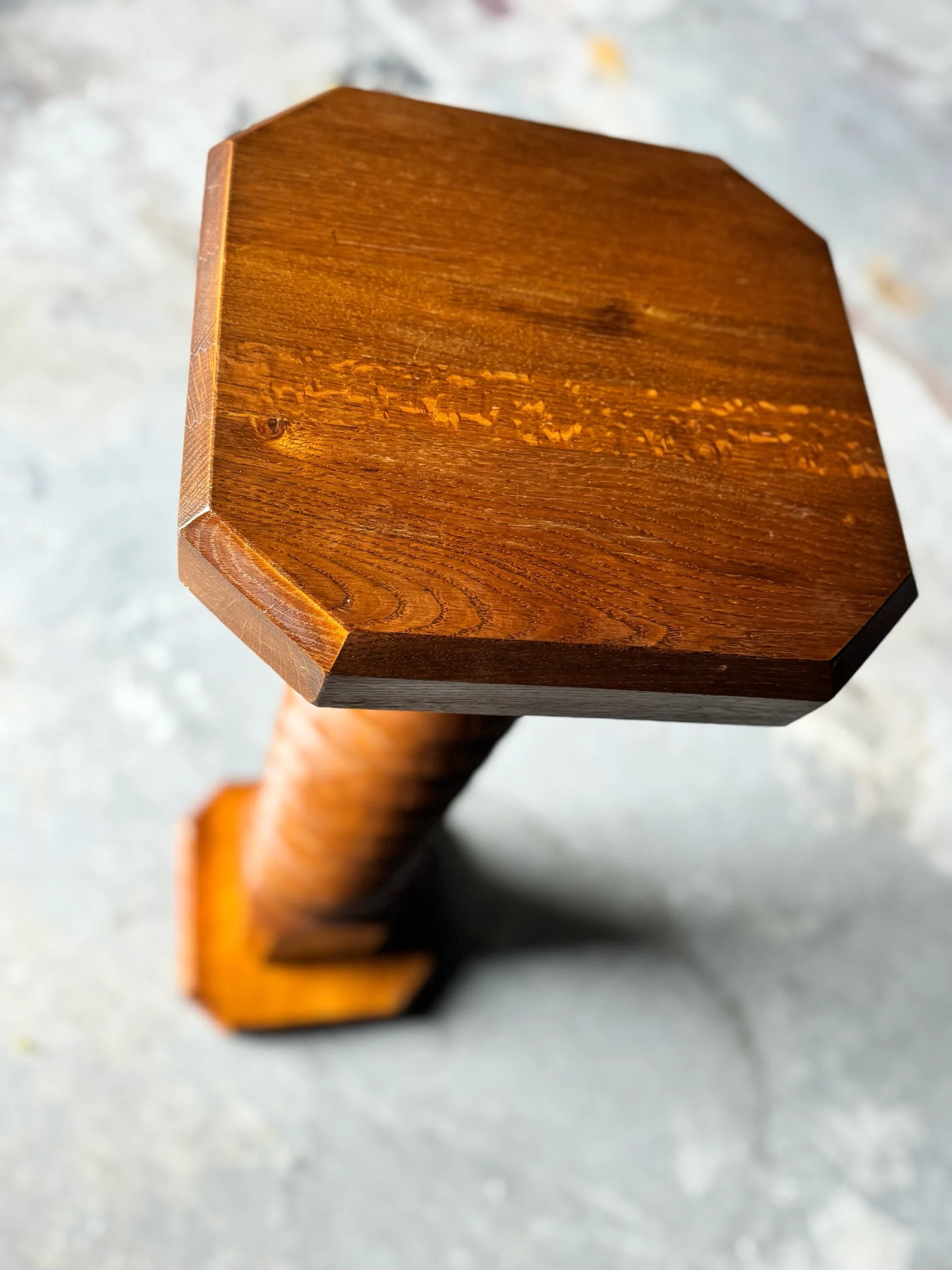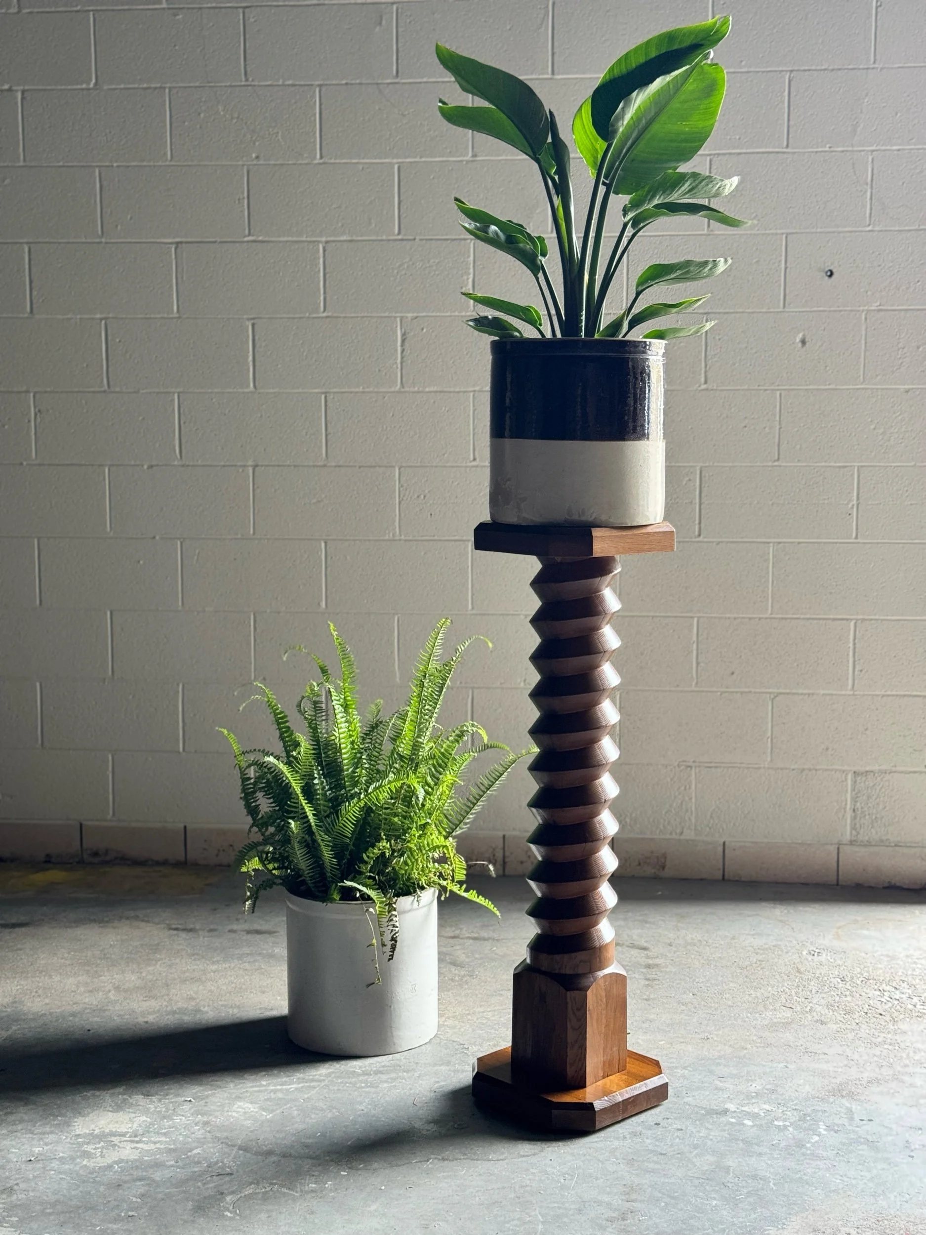 Now repurposed, it serves as a refined yet rustic pedestal—perfect for showcasing a favorite plant, vessel, or decorative object. The rich wood grain, warm tone, and time-earned patina give it a grounded, architectural presence.
