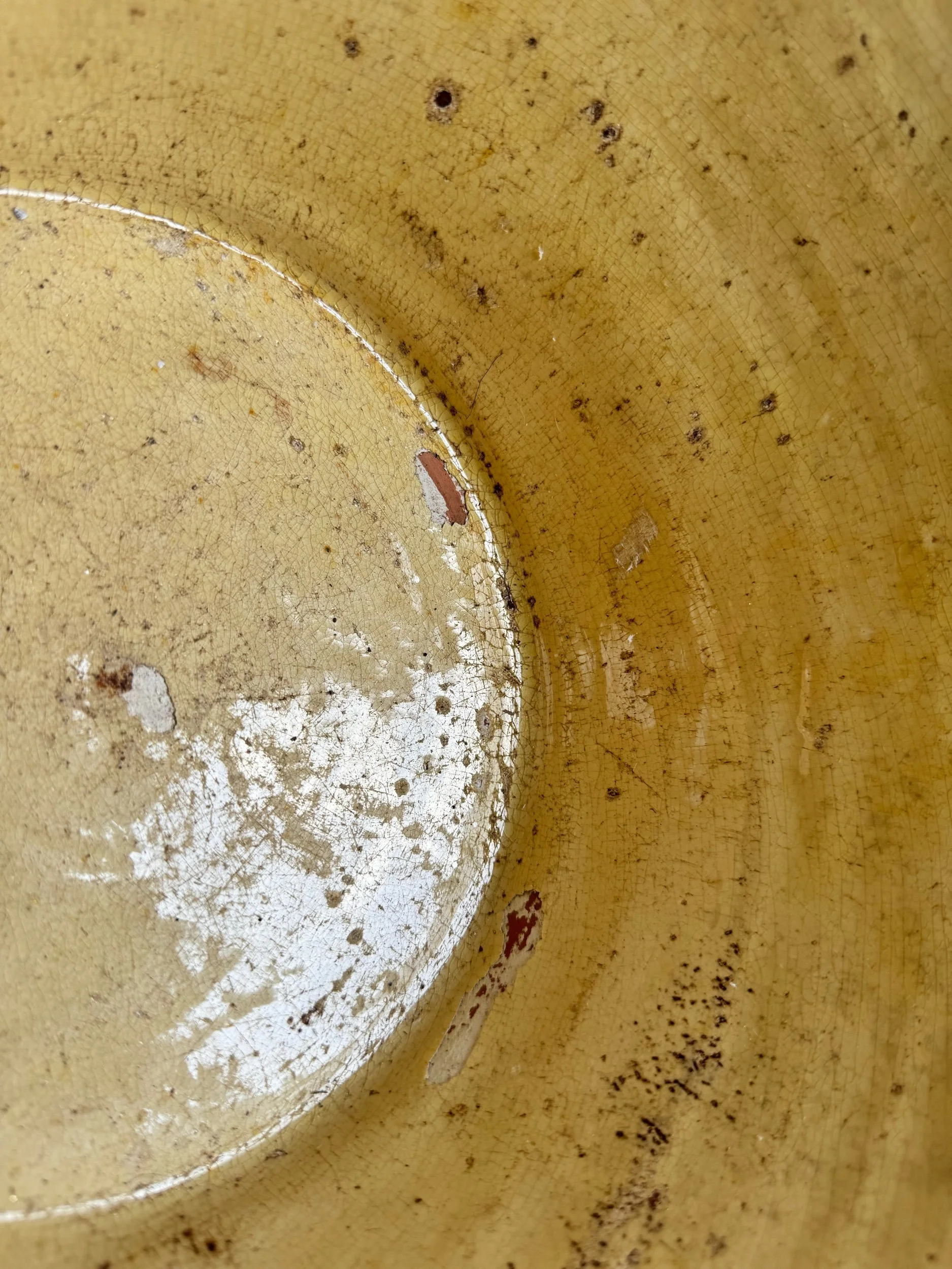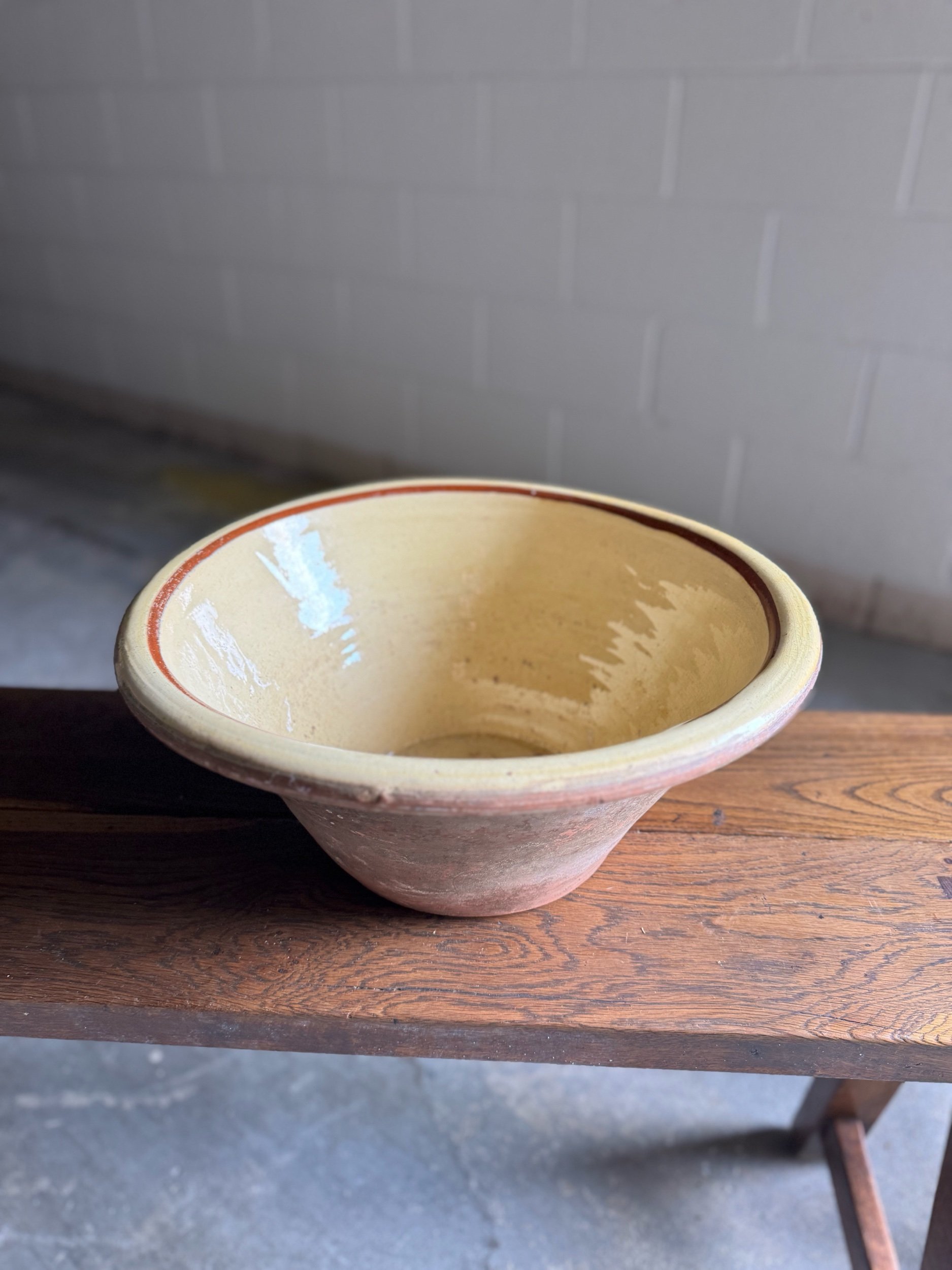 A beautifully timeworn French pancheon, hand-thrown in terracotta and finished with a warm, honey-yellow glazed interior. With its wide, flared rim and substantial form, this piece was once an essential tool in rural French kitchens; used for mixing bread dough, preparing preserves, and everyday cooking tasks.