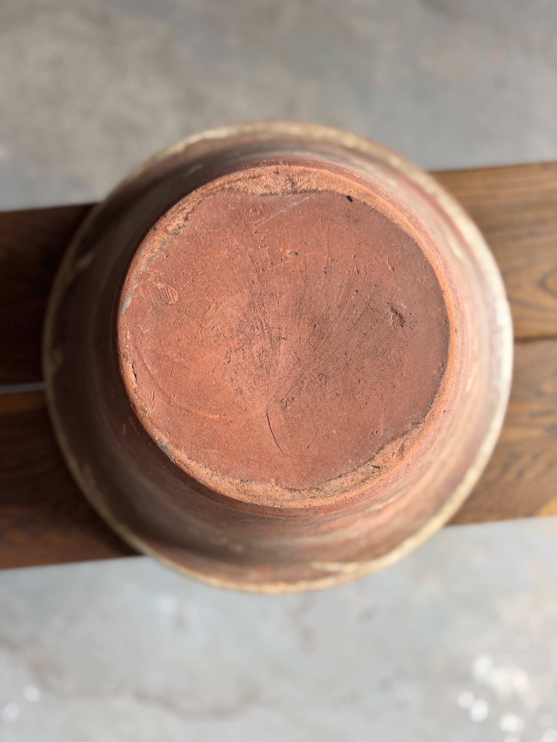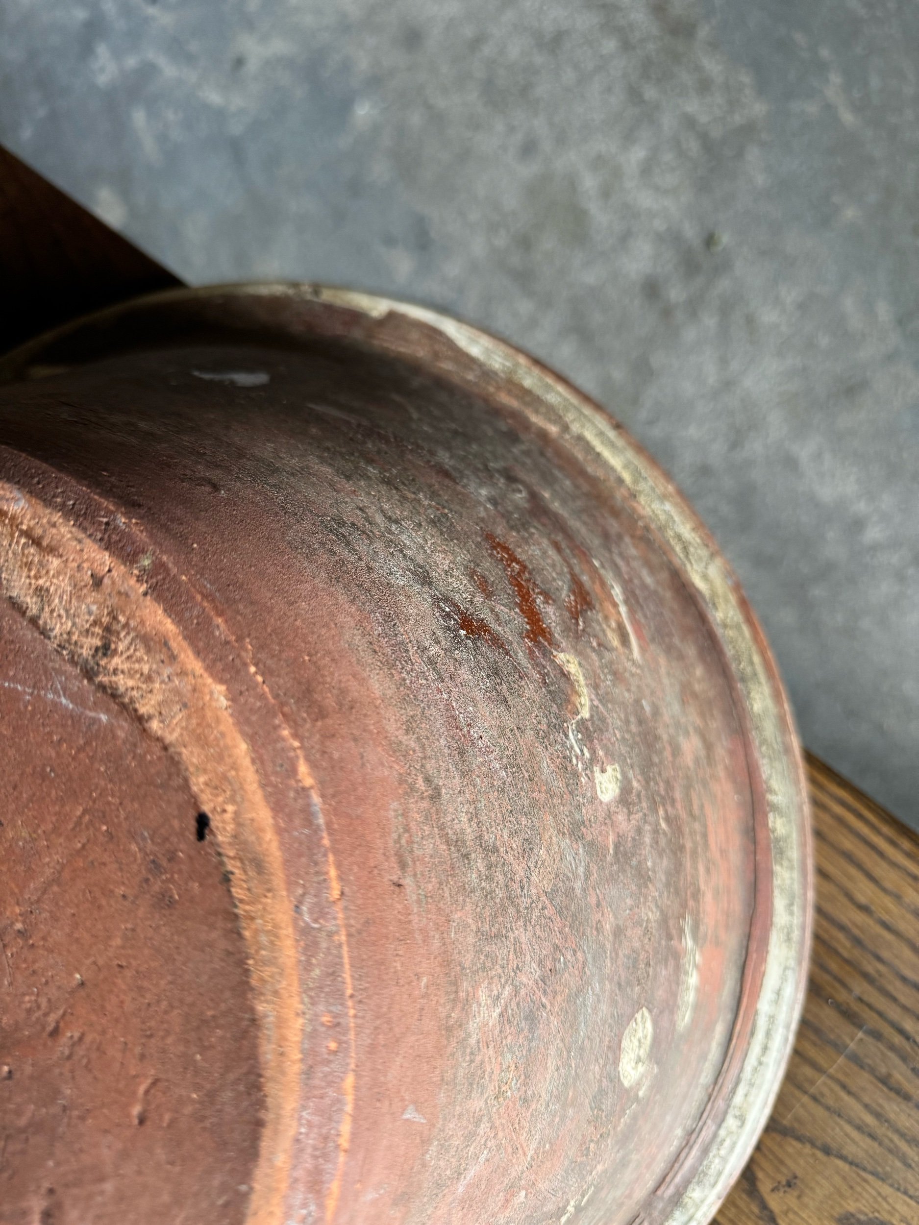 Good antique condition with visible wear consistent with age and use. Interior glaze shows staining, utensil marks, and areas of wear with some exposed terracotta. Crazing present throughout the glaze. Small chips and nicks along the rim, including one more notable chip. Exterior shows heavy surface wear, scuffing, and natural variation to the clay. Structurally sound with no major cracks. A well-loved and character-rich example.