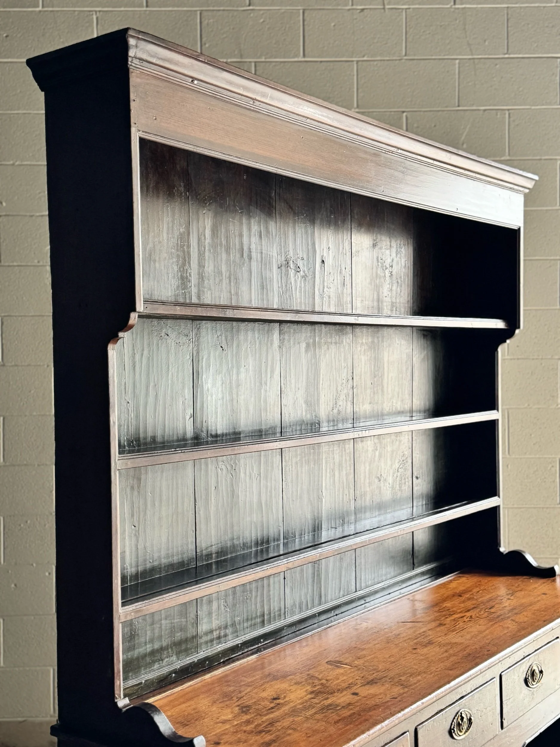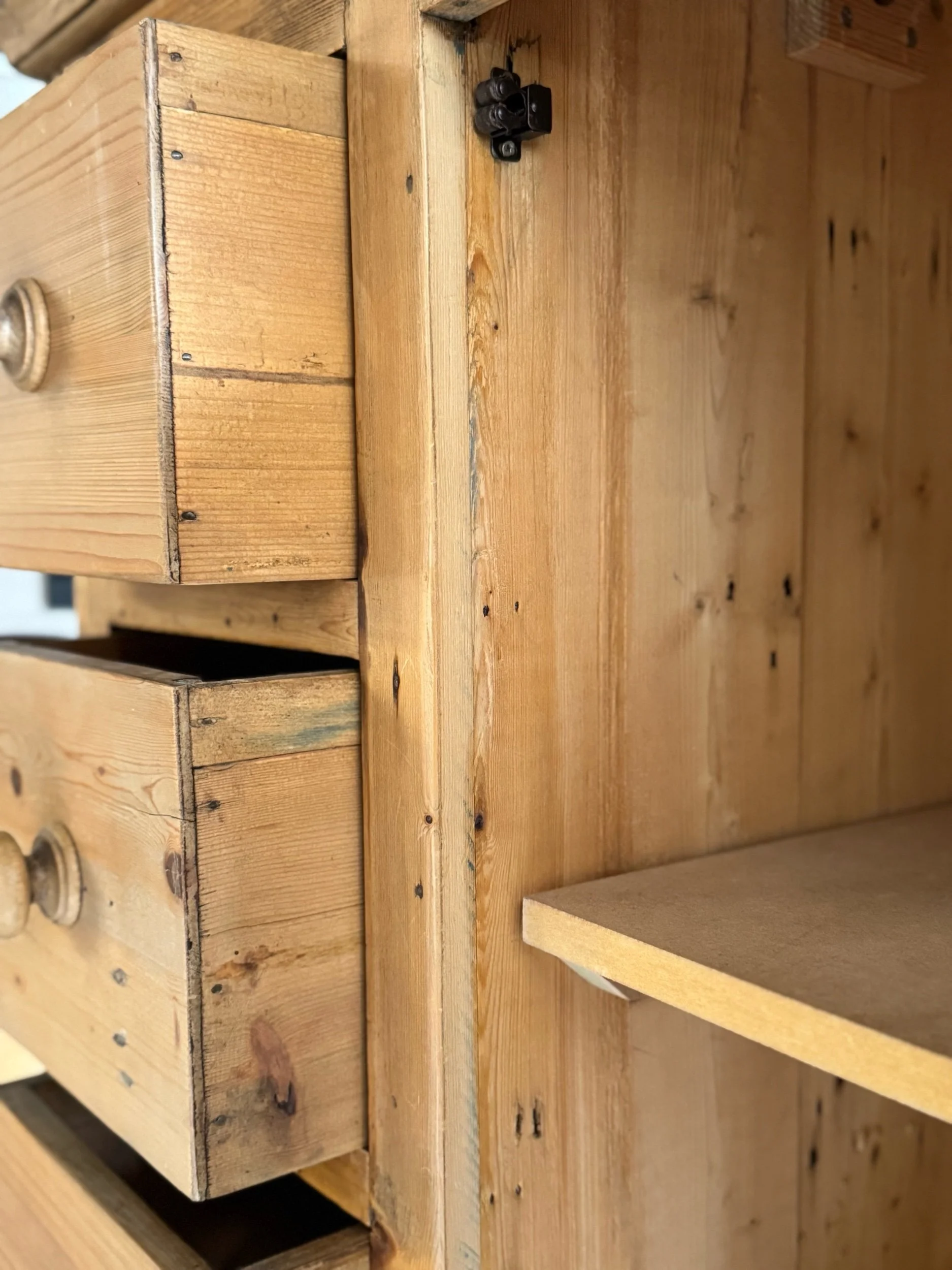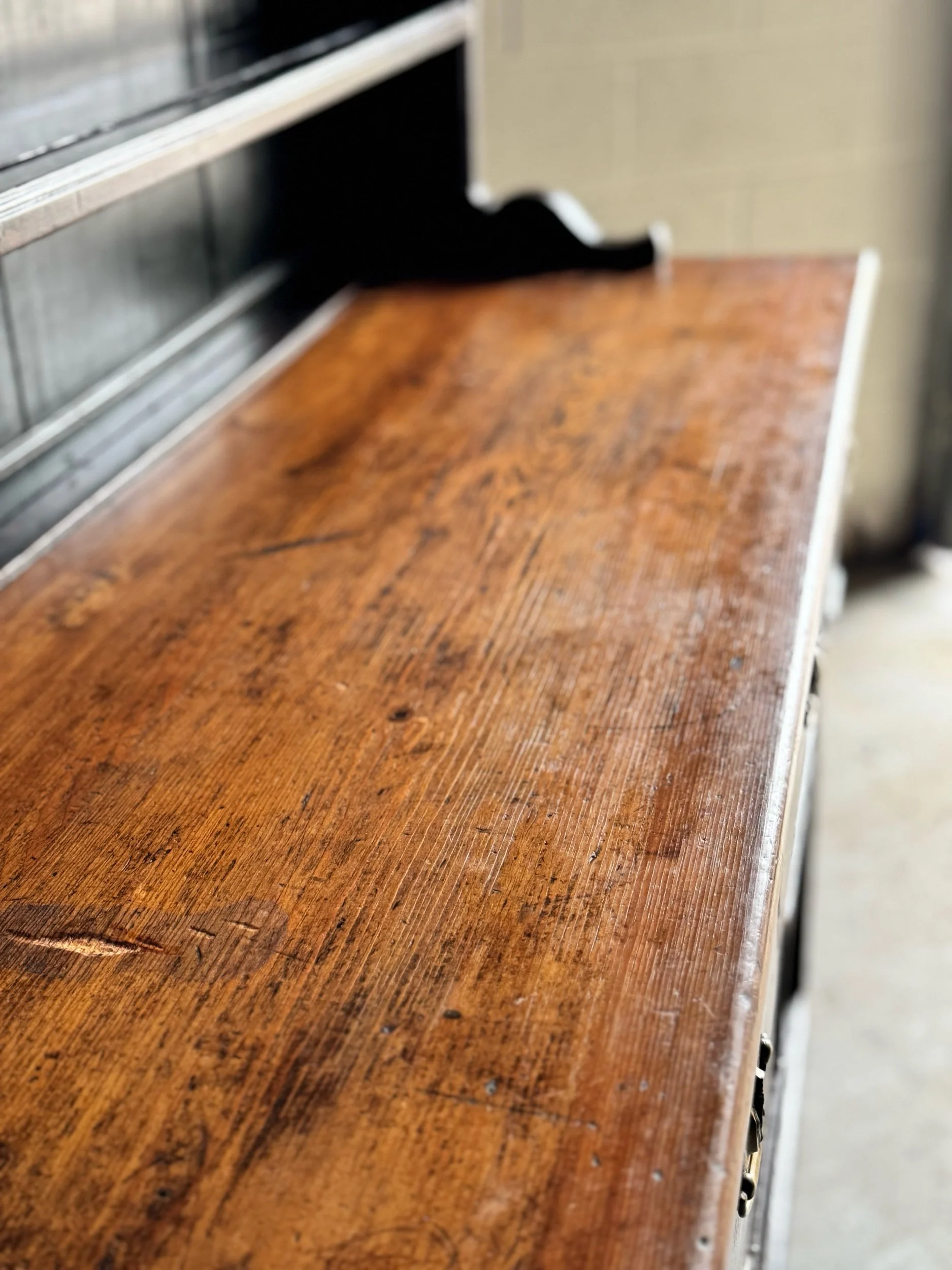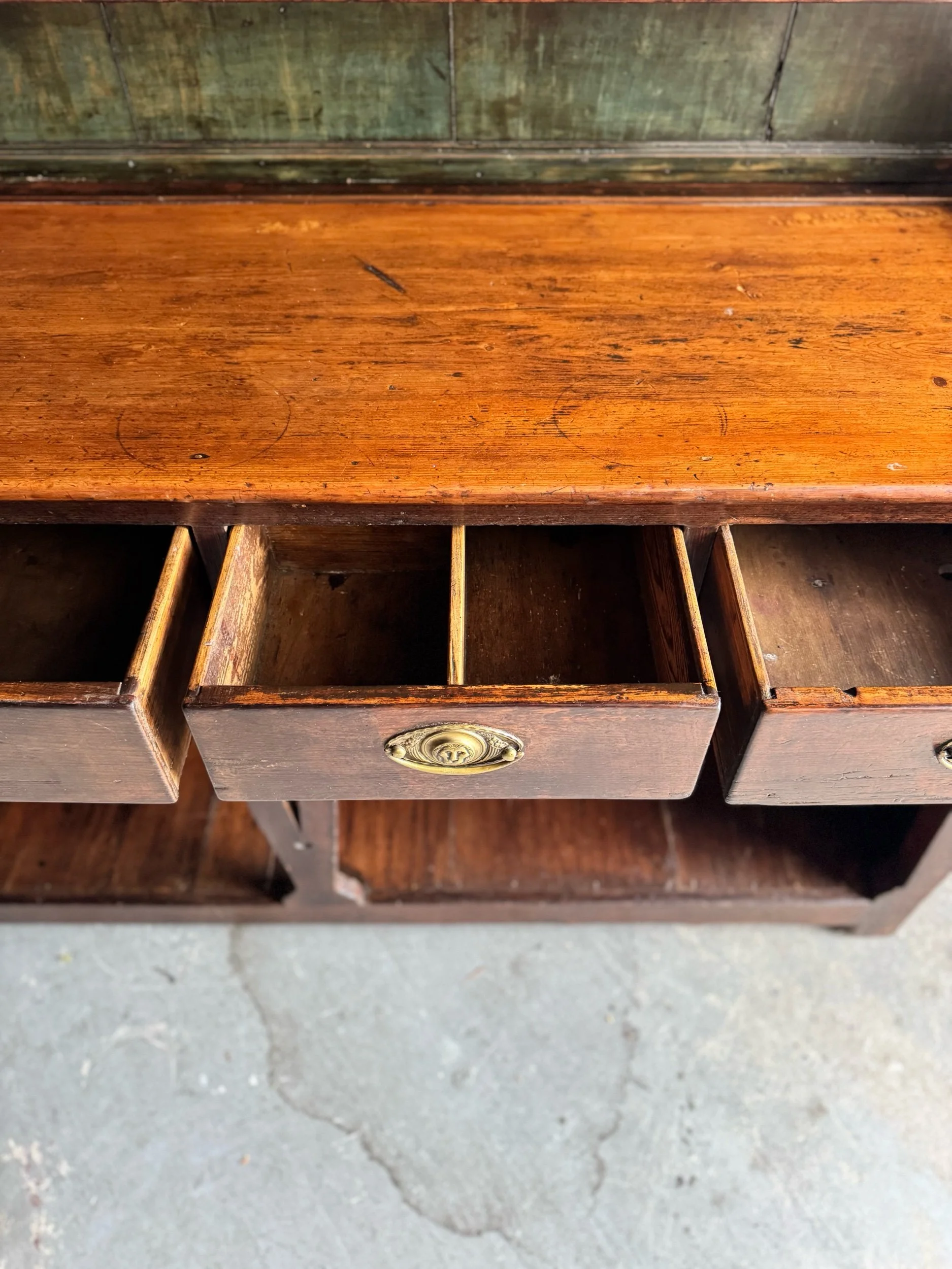 Good antique condition consistent with age and use. Surface wear, scuffs, and patina throughout, particularly to the working surfaces and edges, which add to its character. Interior backboards show expected age-related discoloration. Drawers run well; hardware appears original with a nicely aged finish. Structurally solid and ready for use.