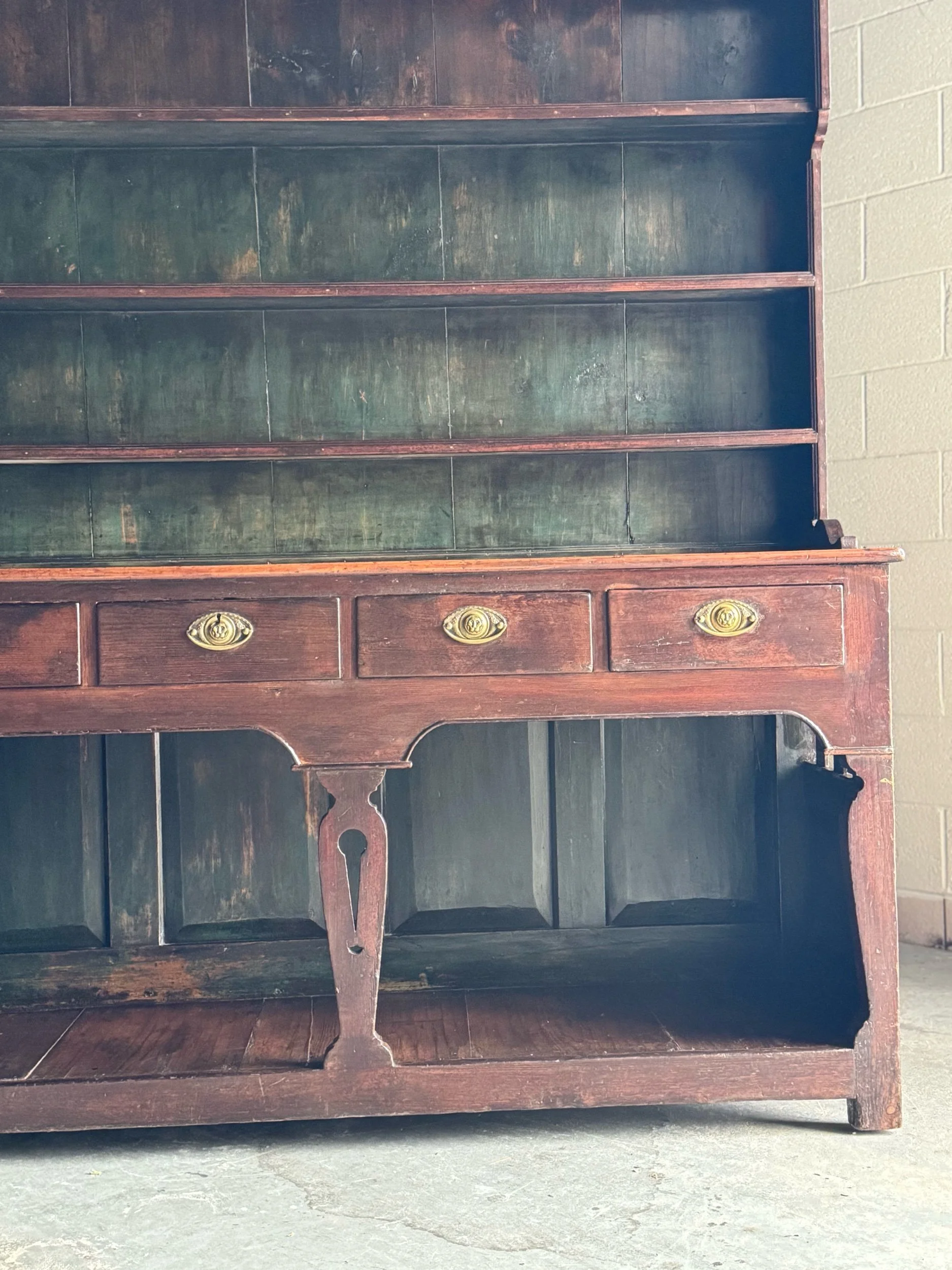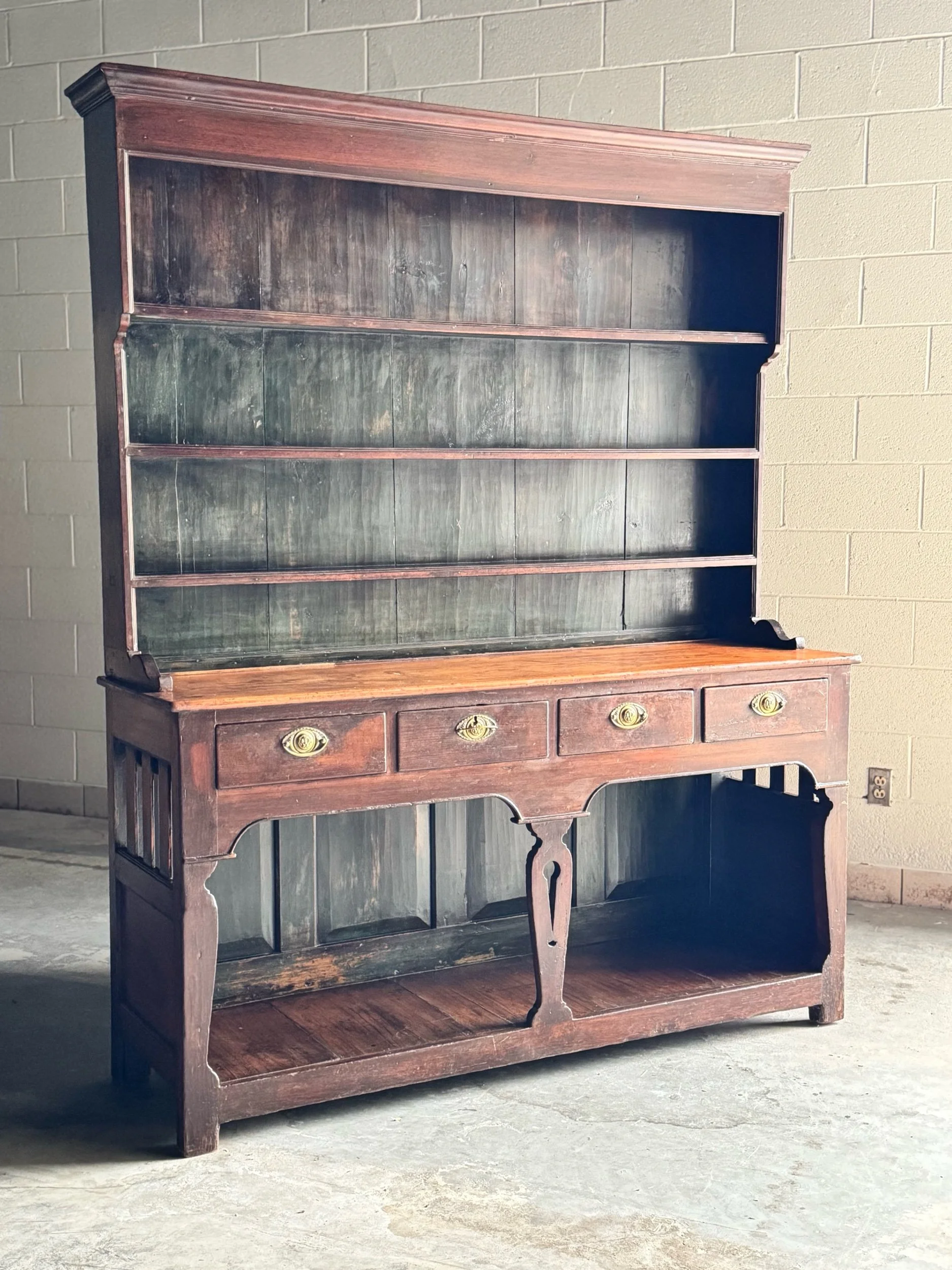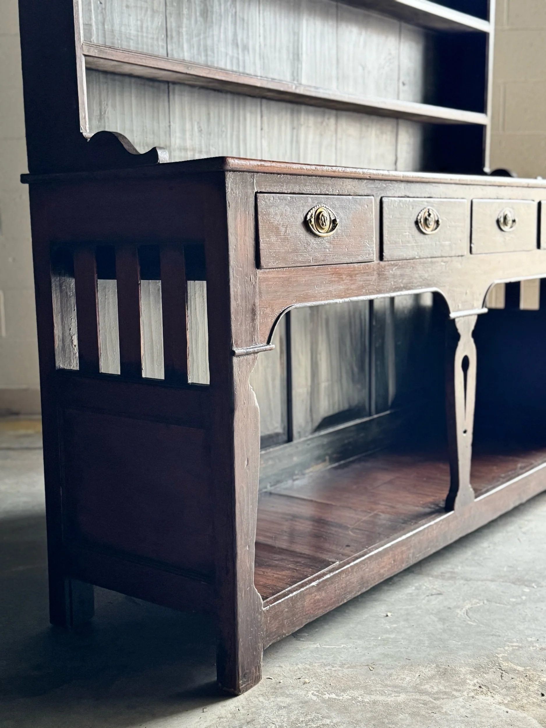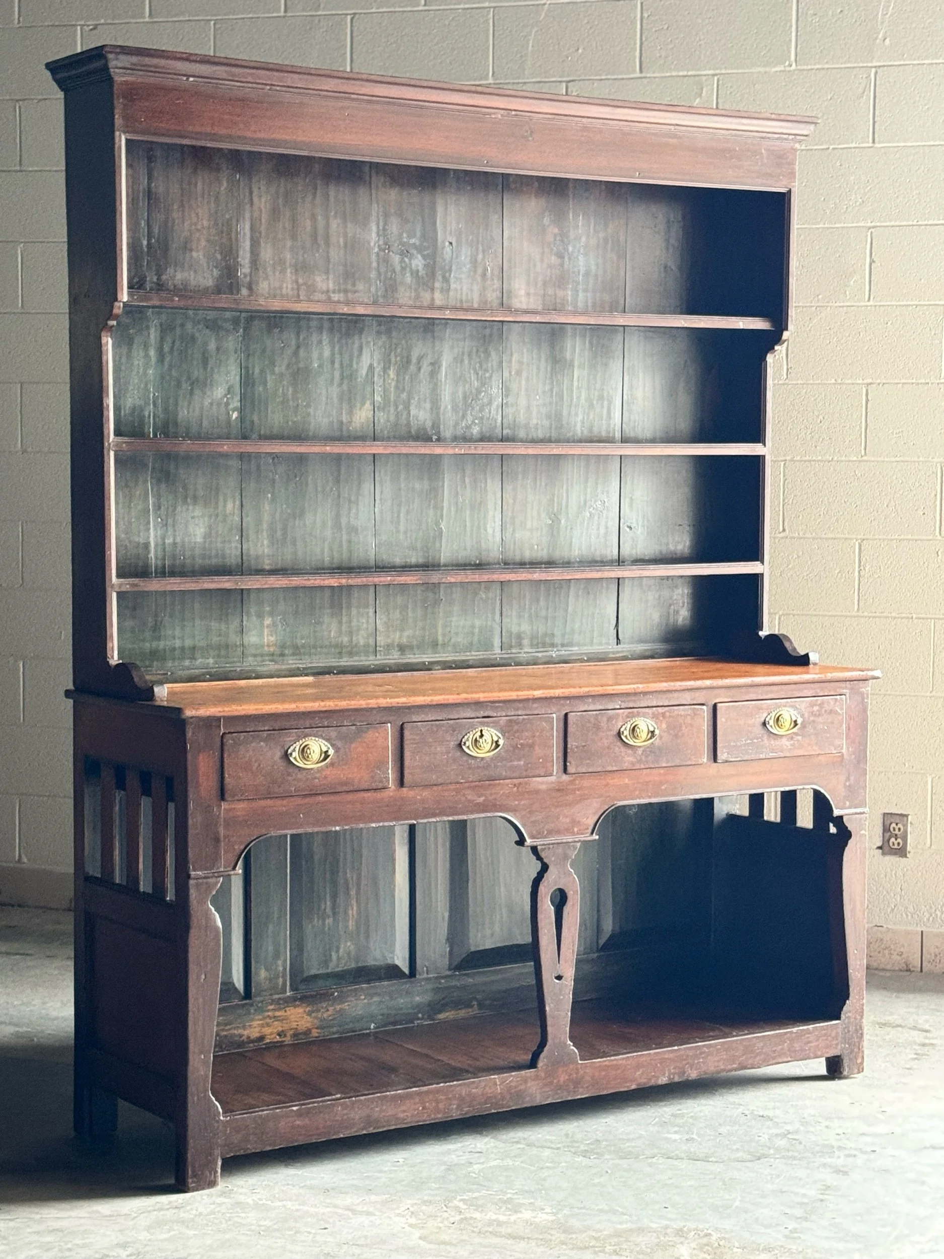 Antique English Arts & Crafts Oak Dresser Base and Plate Rack, Lion Pulls | Circa 1900