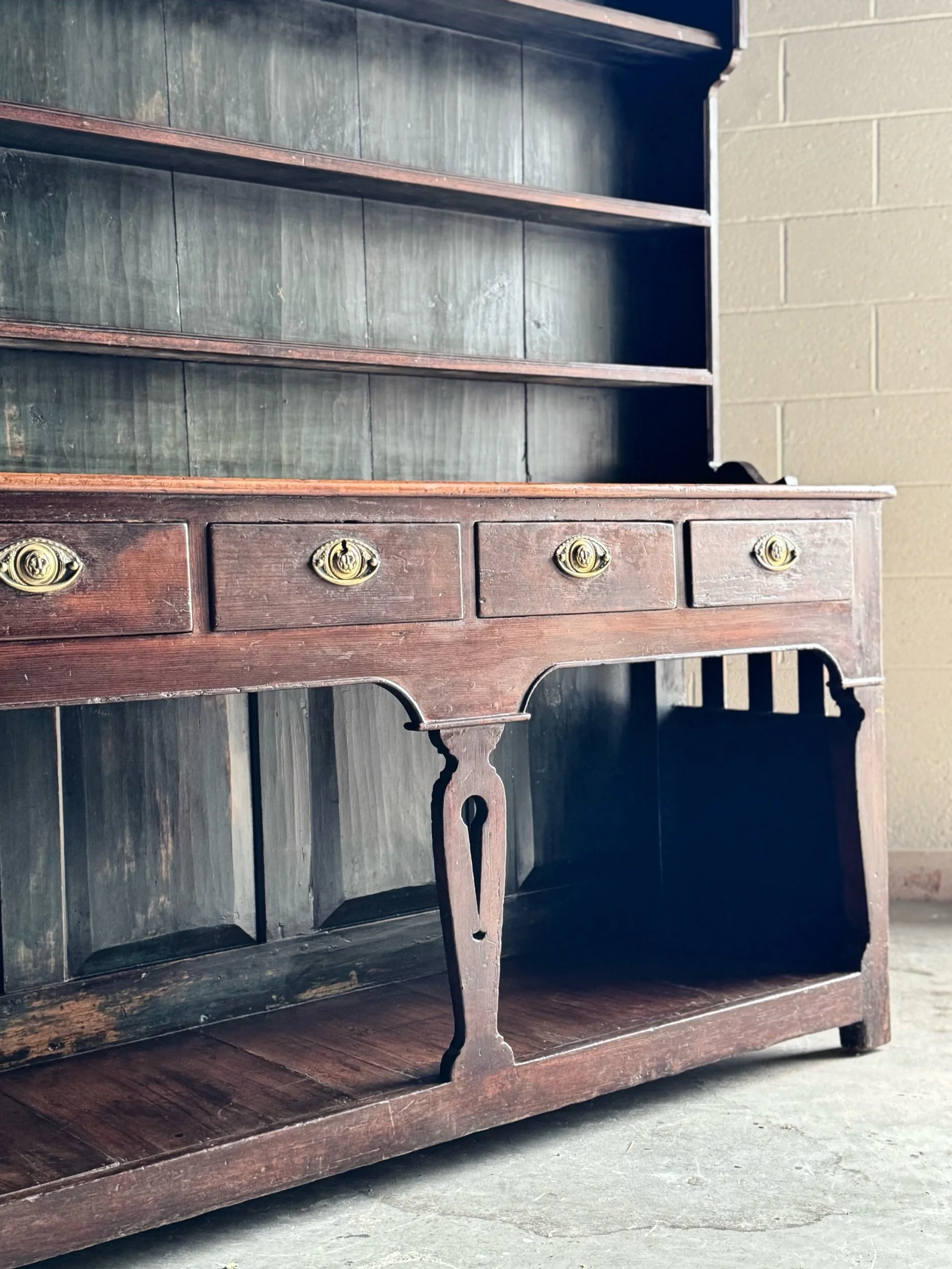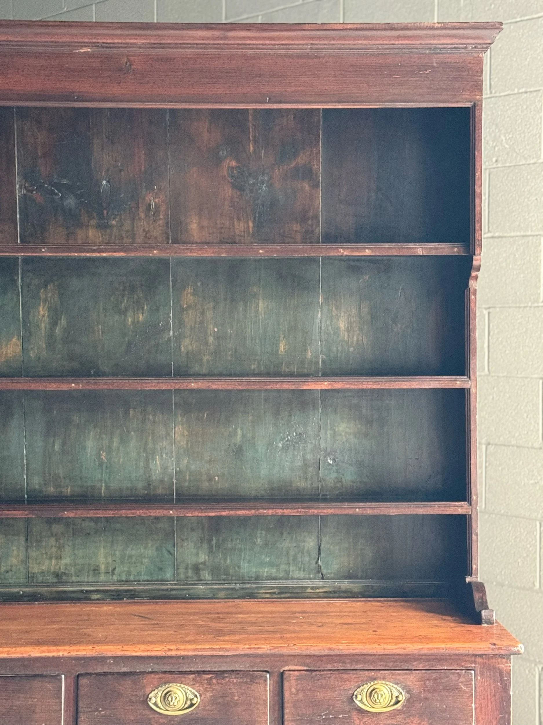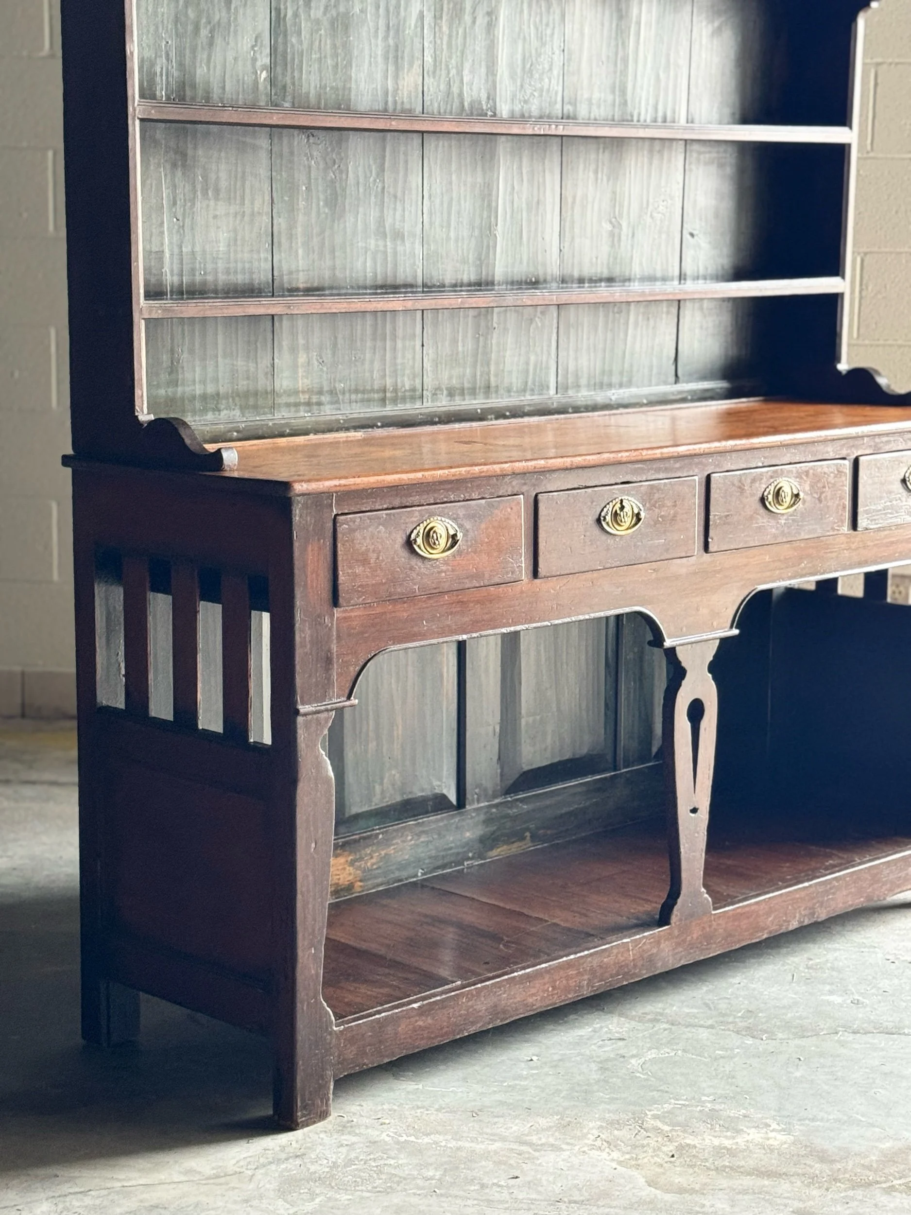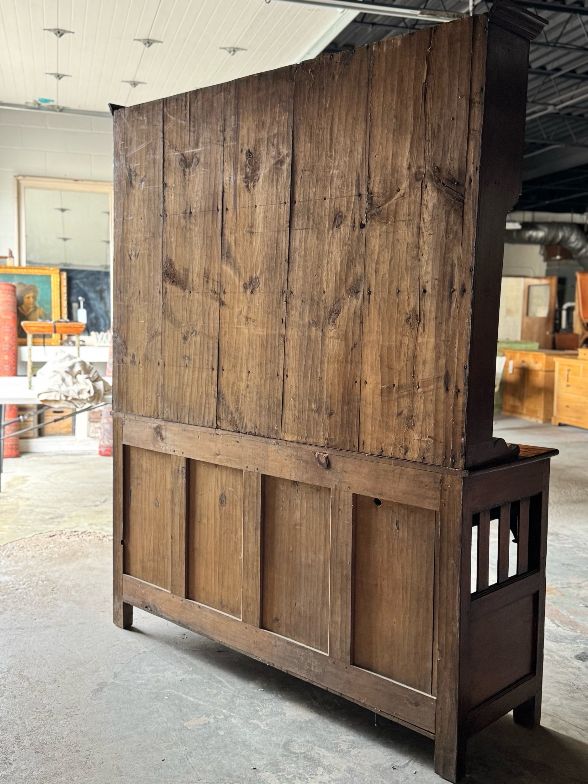 Antique English Arts & Crafts Oak Dresser Base and Plate Rack, Lion Pulls | Circa 1900