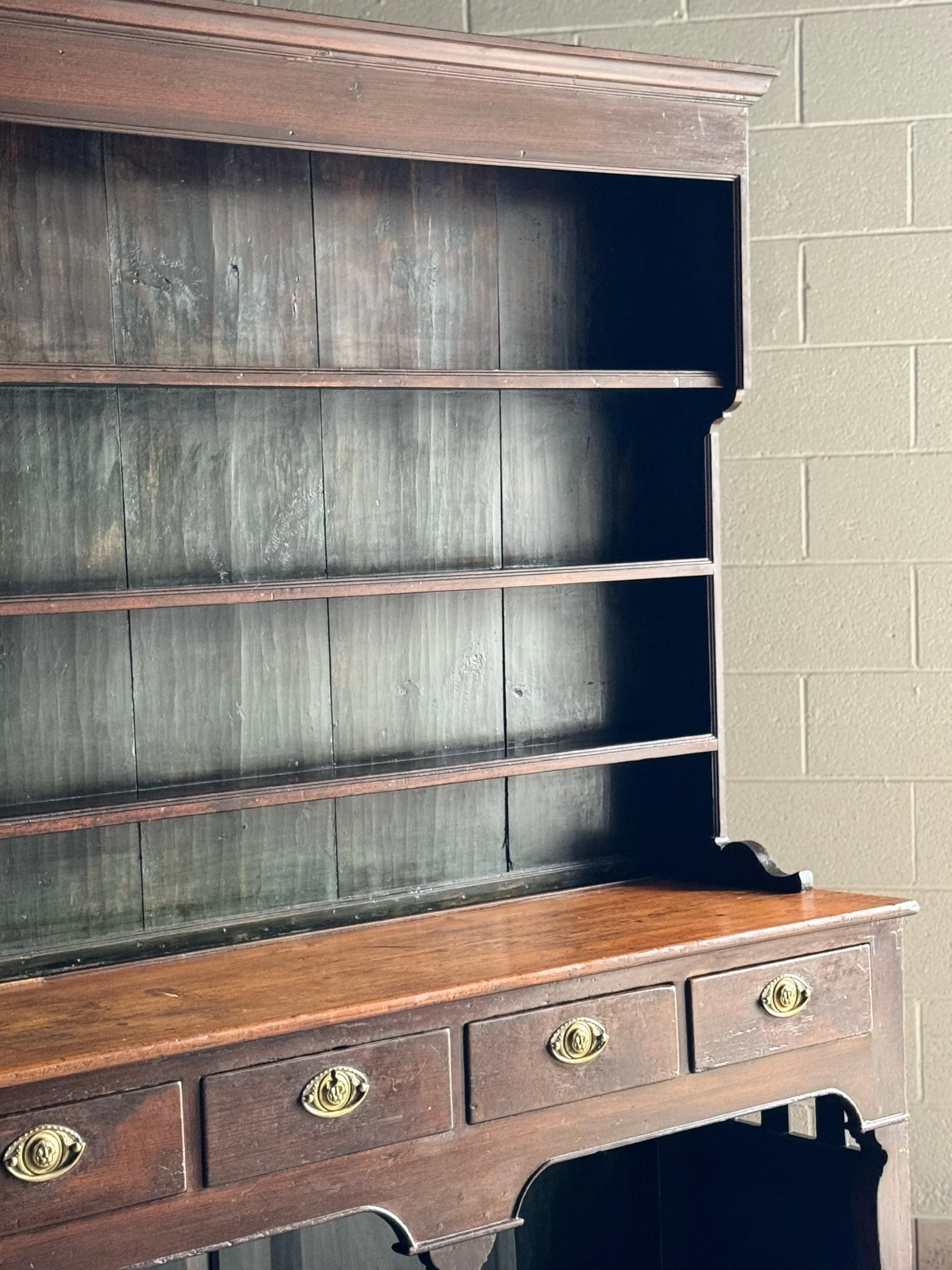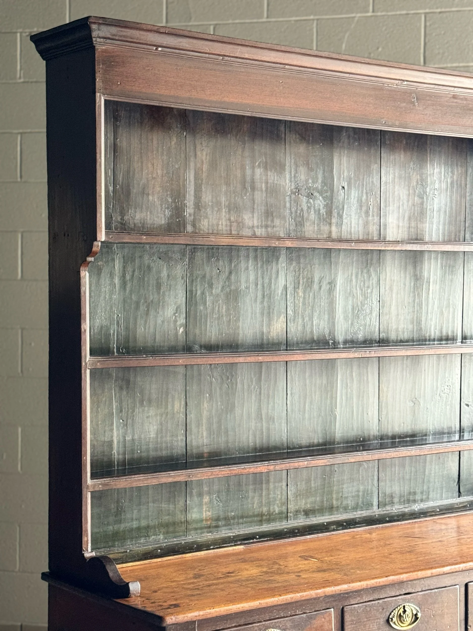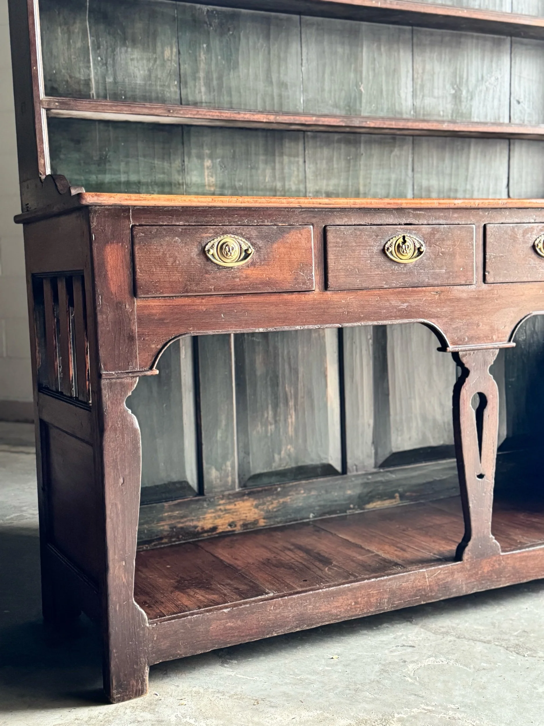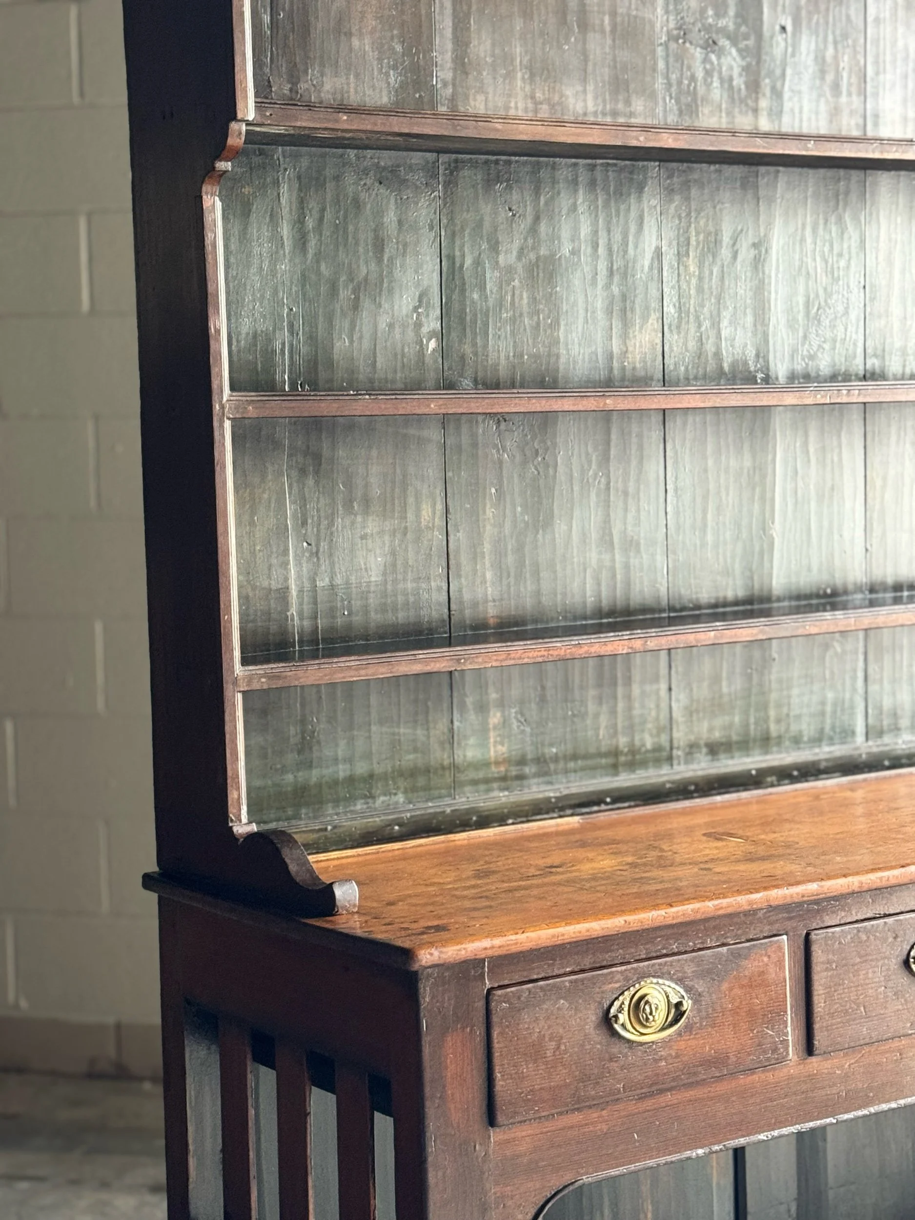 Antique English Arts & Crafts Oak Dresser Base and Plate Rack, Lion Pulls | Circa 1900