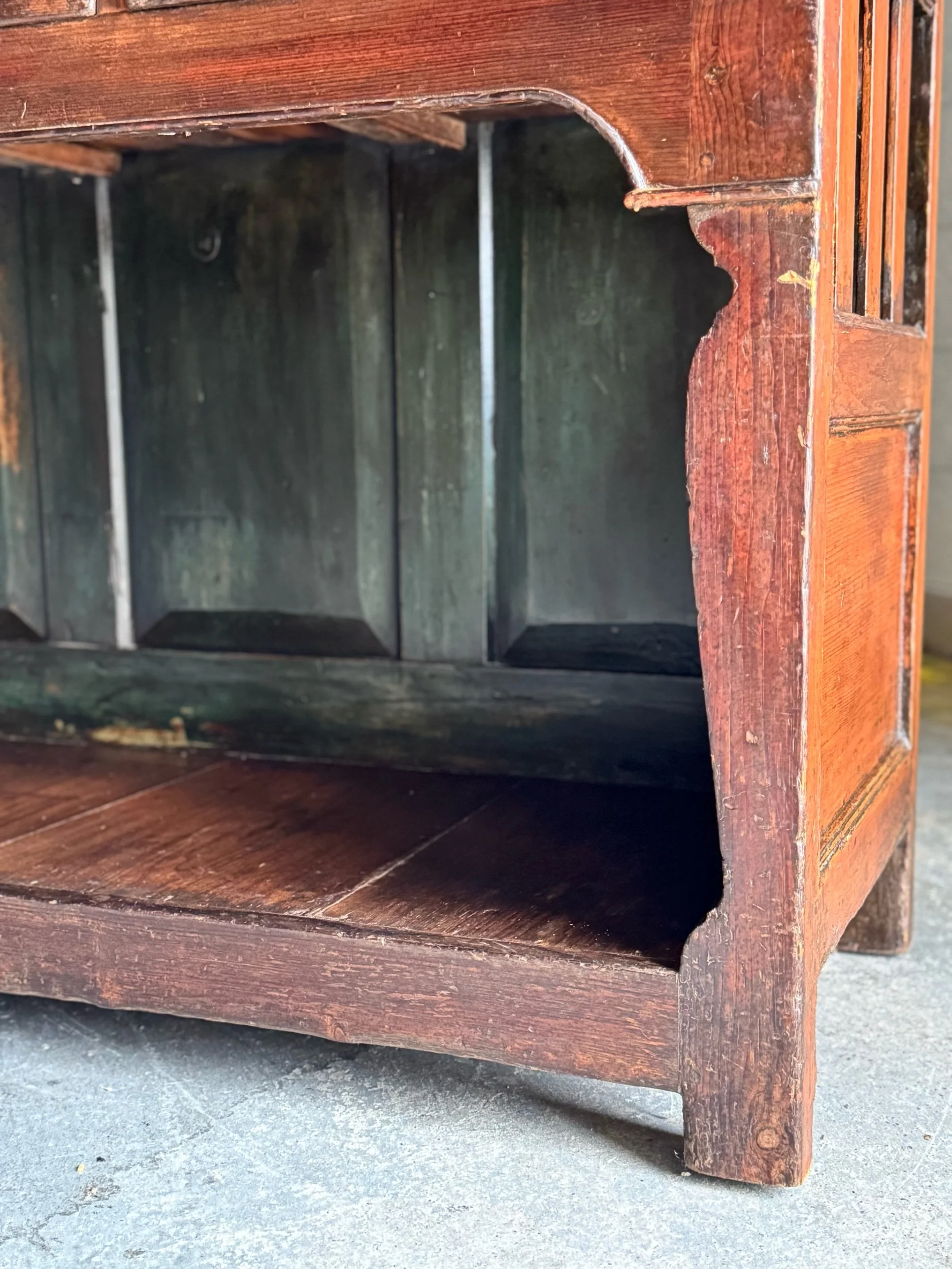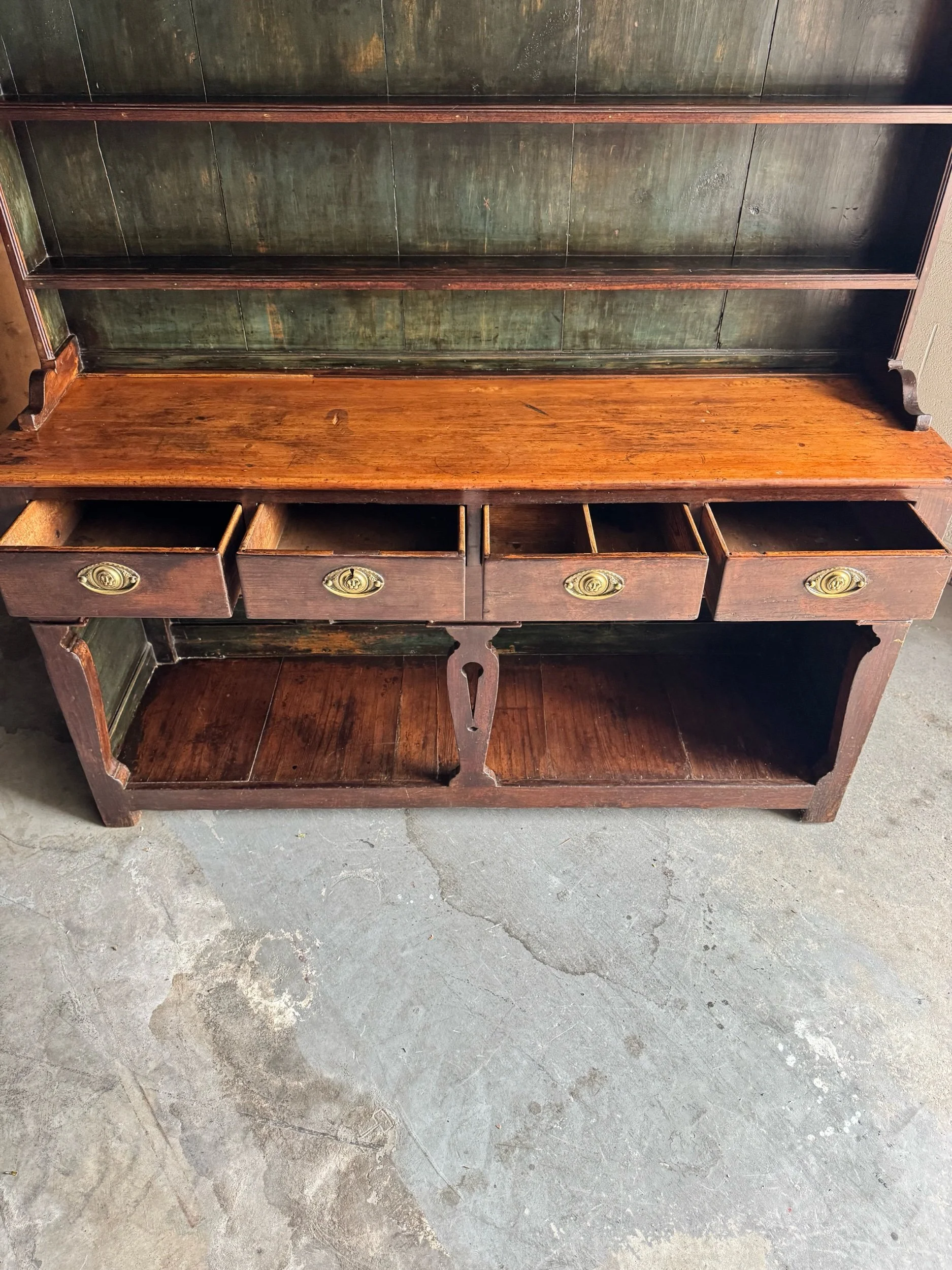 A beautifully honest example of English Arts & Crafts design, this circa 1900 oak dresser base with plate rack showcases the movement’s hallmark simplicity, craftsmanship, and emphasis on natural materials. The warm, time-softened oak is complemented by hand-cut details, an open plate rack with graduated shelves, and a base fitted with four drawers featuring distinctive brass lion-head pulls. The lower open section offers generous storage, while the slatted sides and shaped supports add subtle architectural interest.