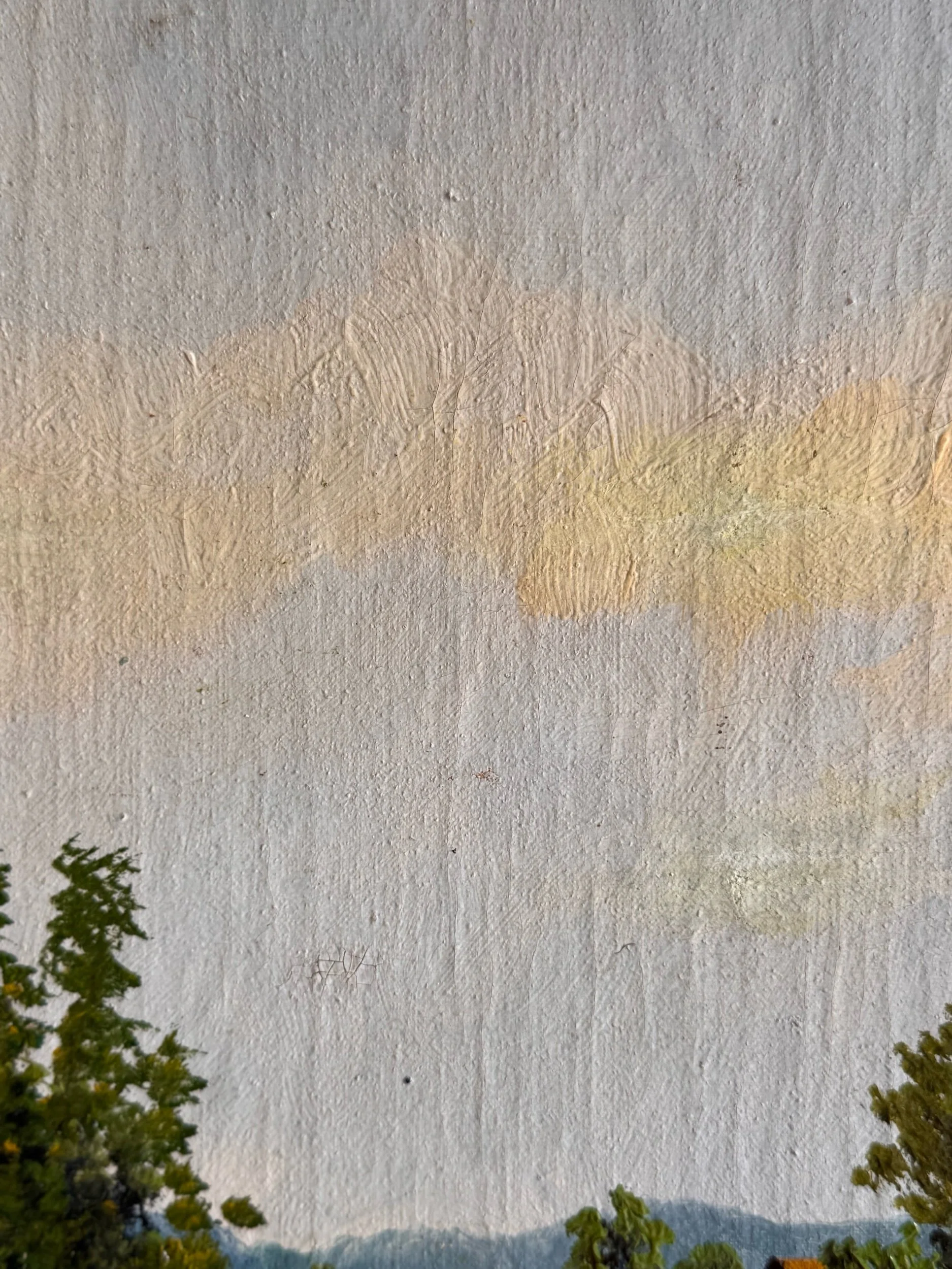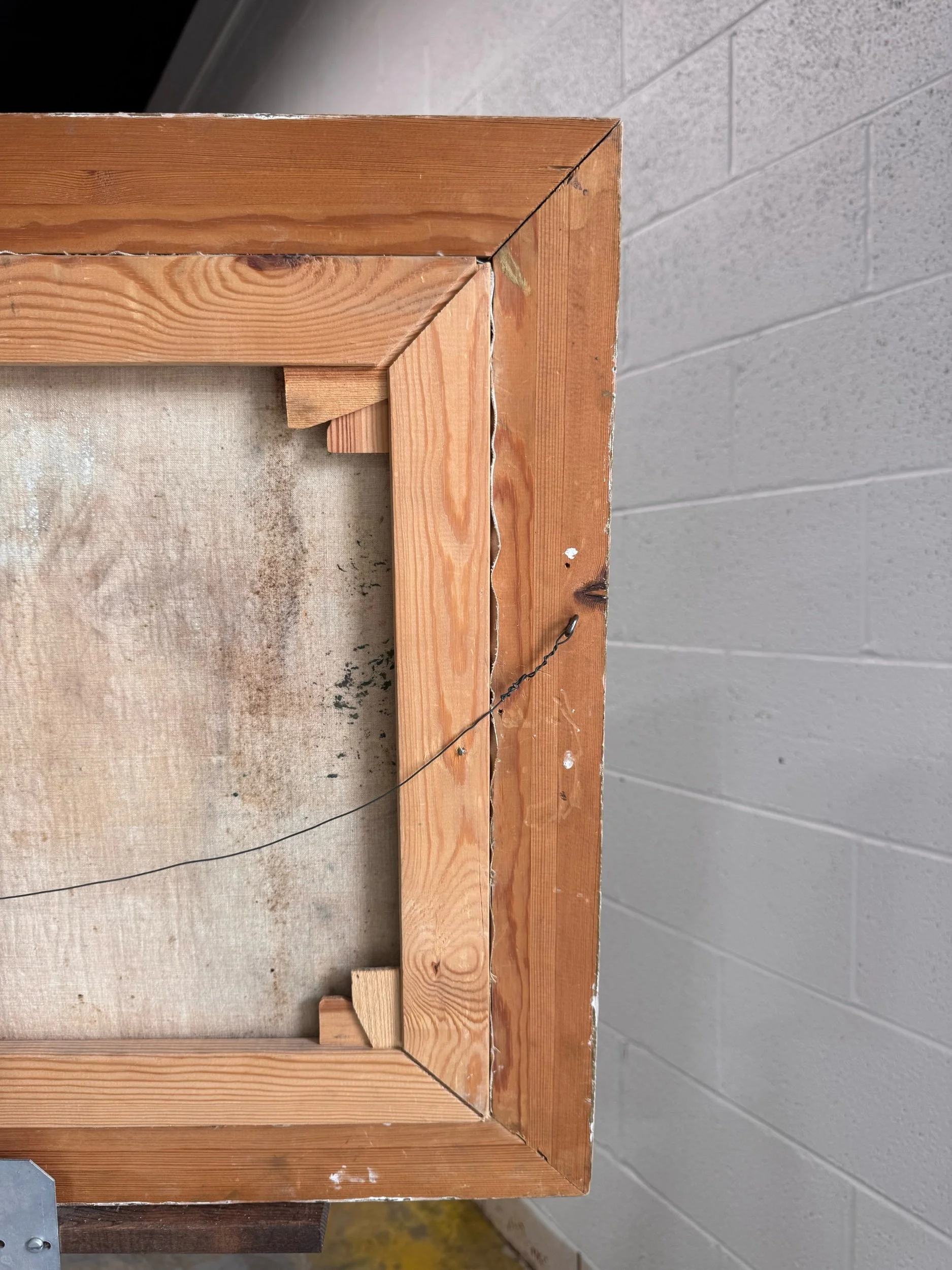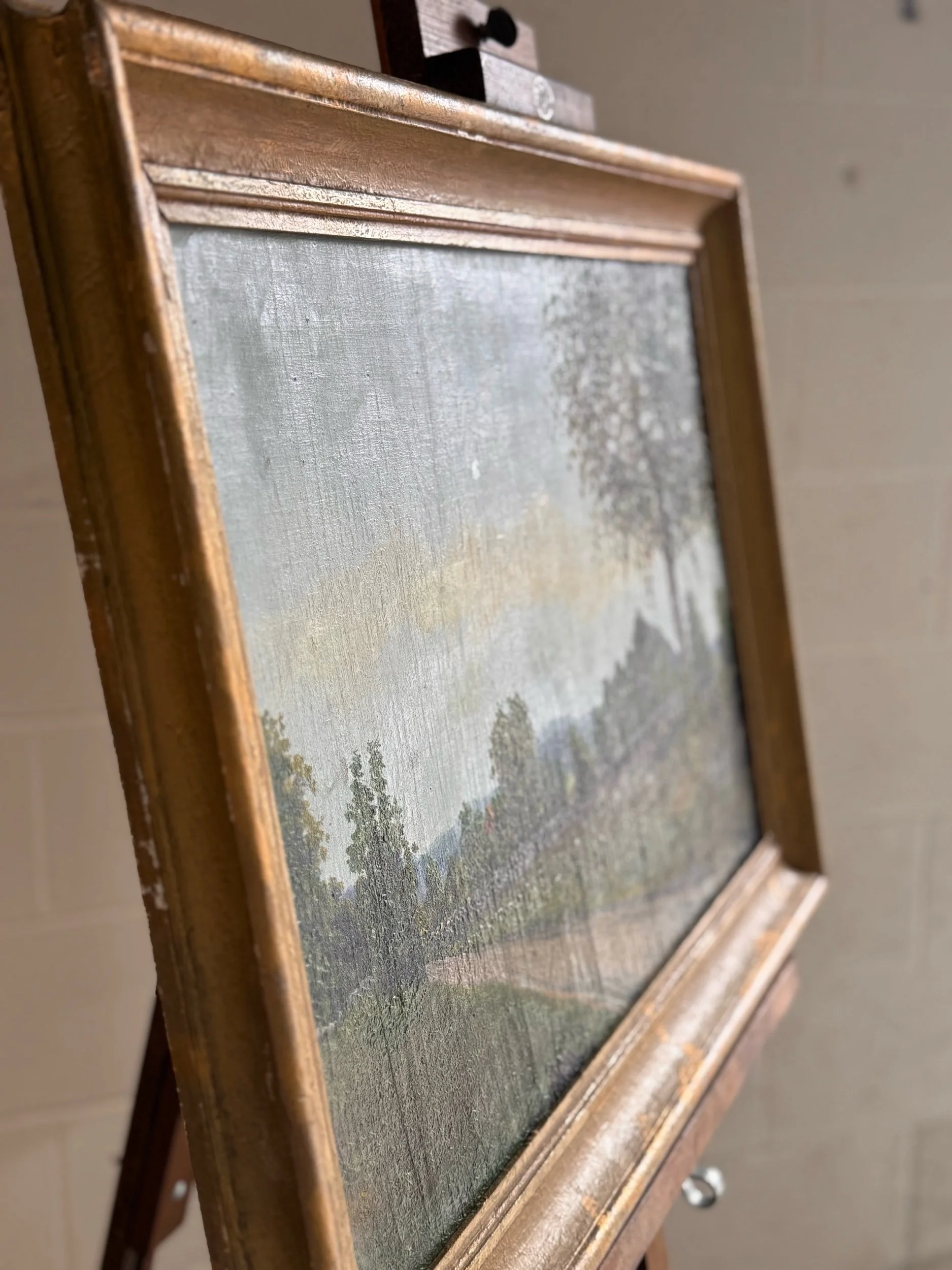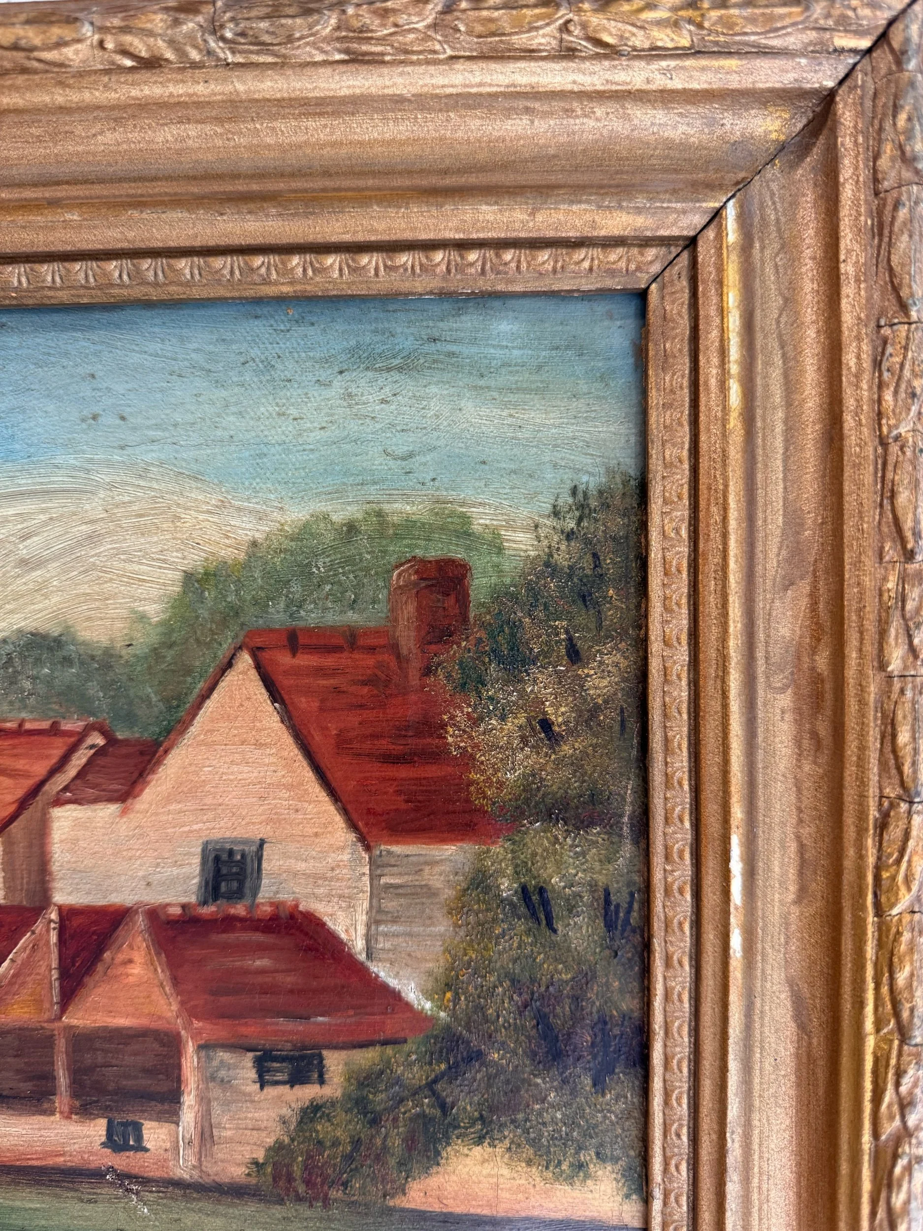 Good antique condition overall. Light surface wear consistent with age, including minor scuffs and small areas of paint loss. Visible craquelure and some surface dirt/discoloration. Frame shows age-appropriate wear with minor chips and rubbing to the gilt finish. Structurally sound and displays well.