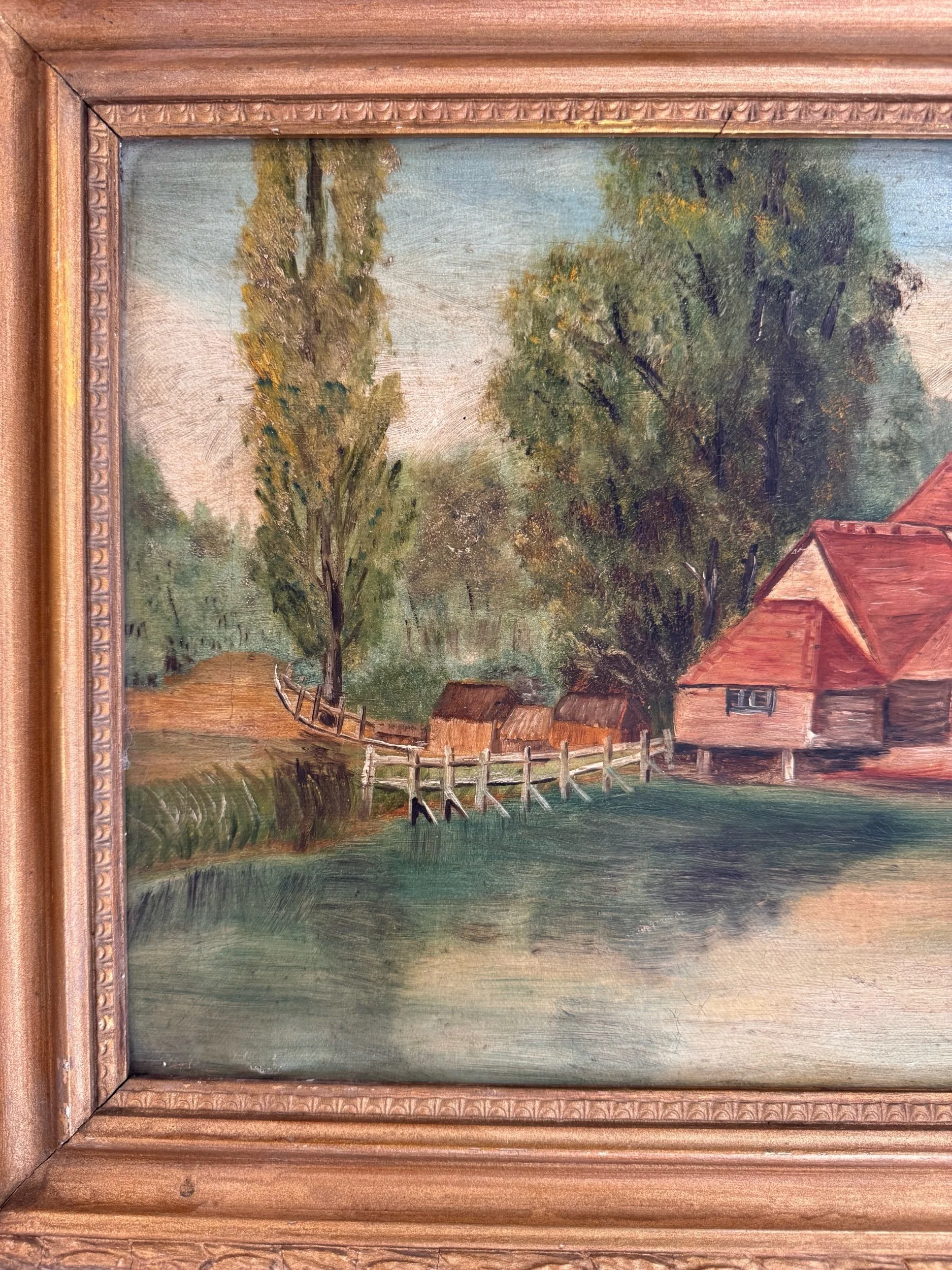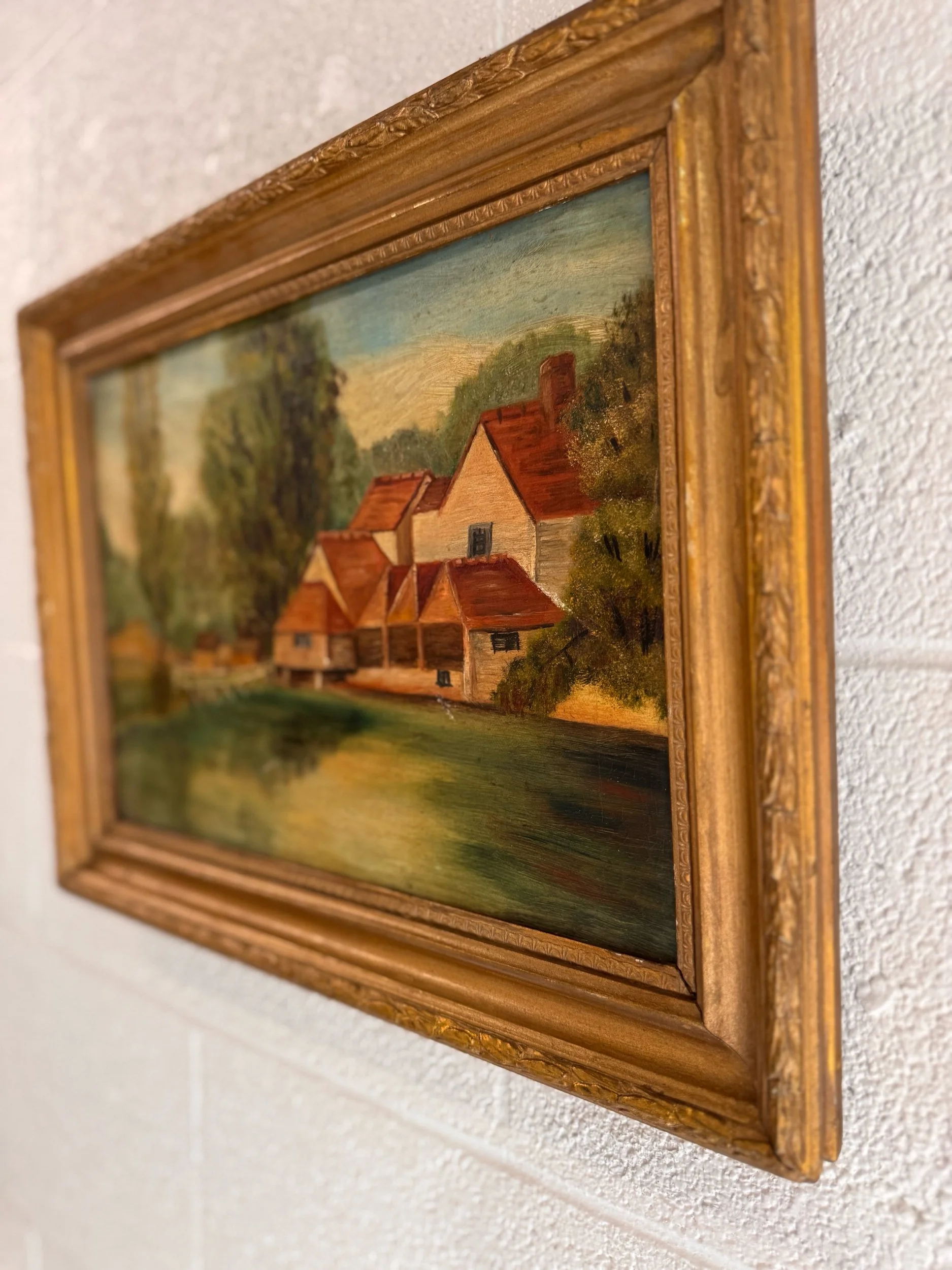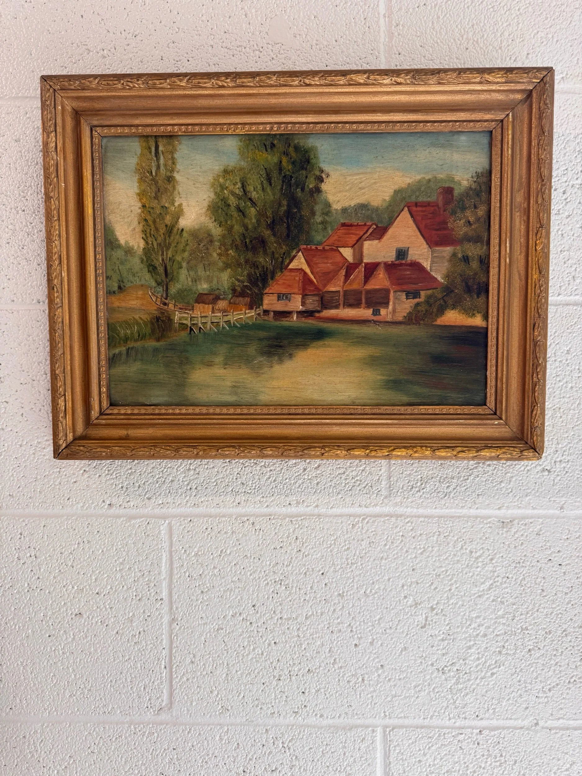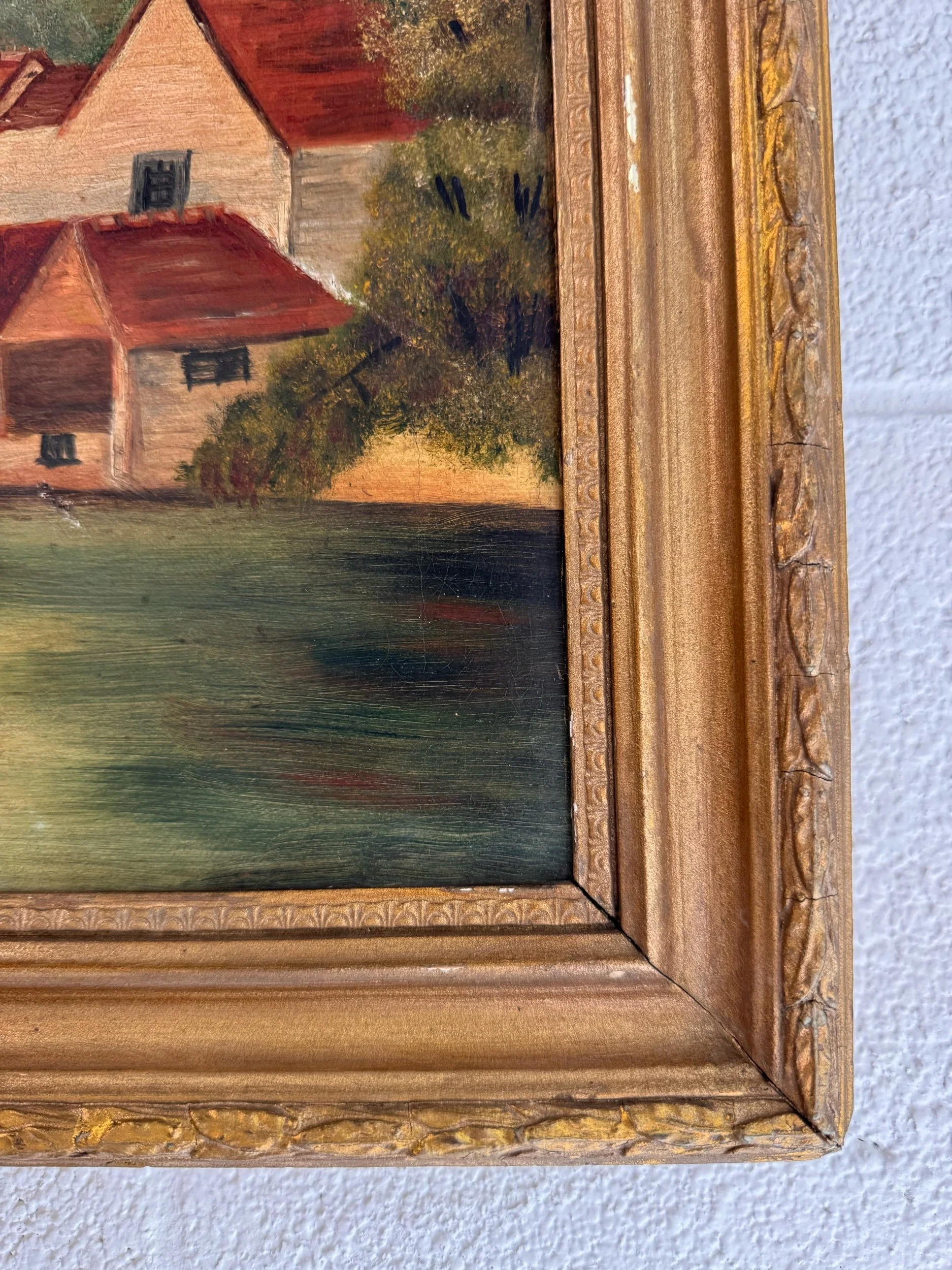 A charming turn-of-the-century oil on canvas depicting a peaceful countryside setting, with red-roofed buildings nestled along the water’s edge and a rustic footbridge leading into the scene. Soft, muted tones and gentle brushwork give this piece a calm, pastoral feel. The piece is a classic European decorative landscape from the early 20th century.