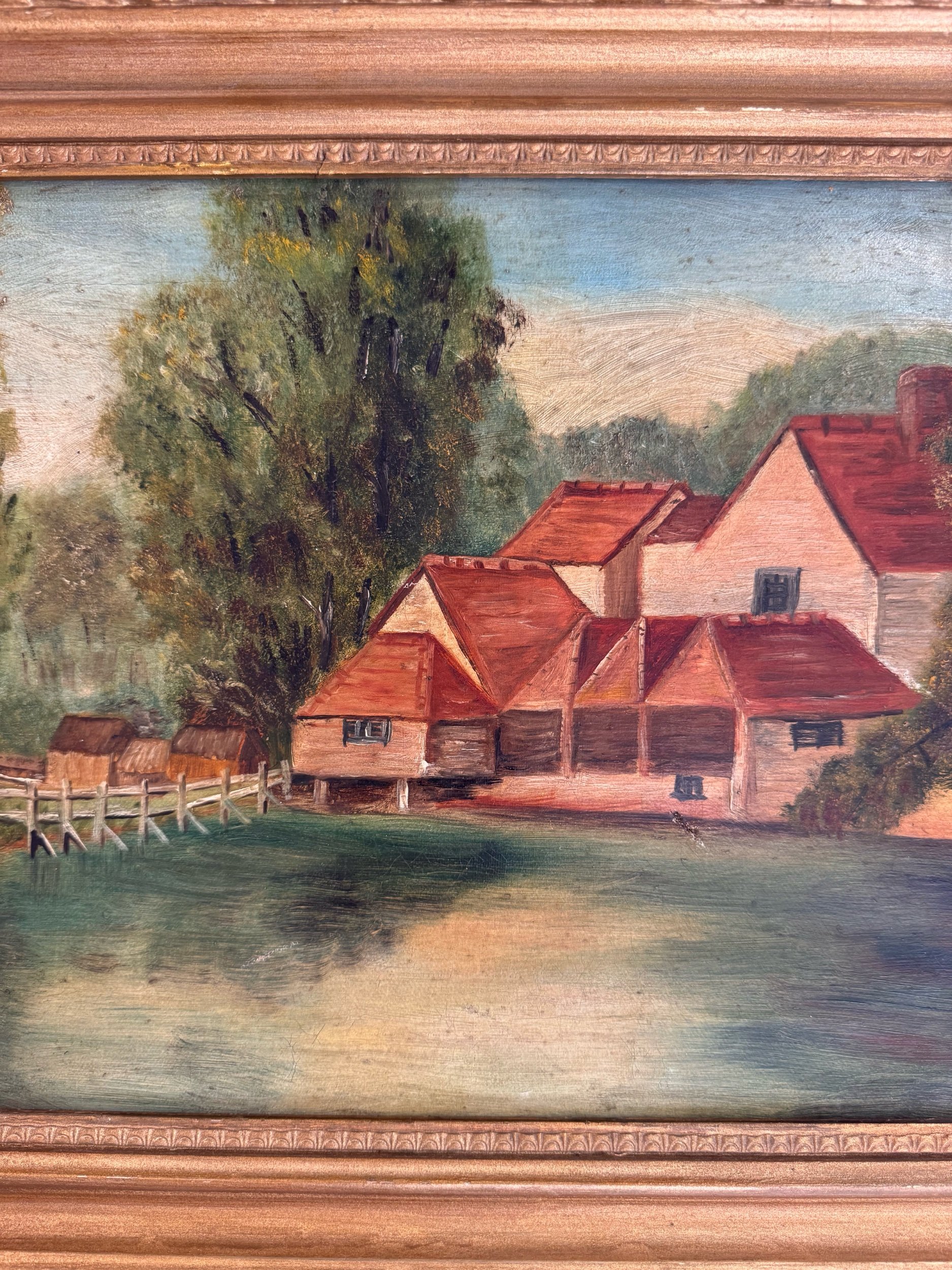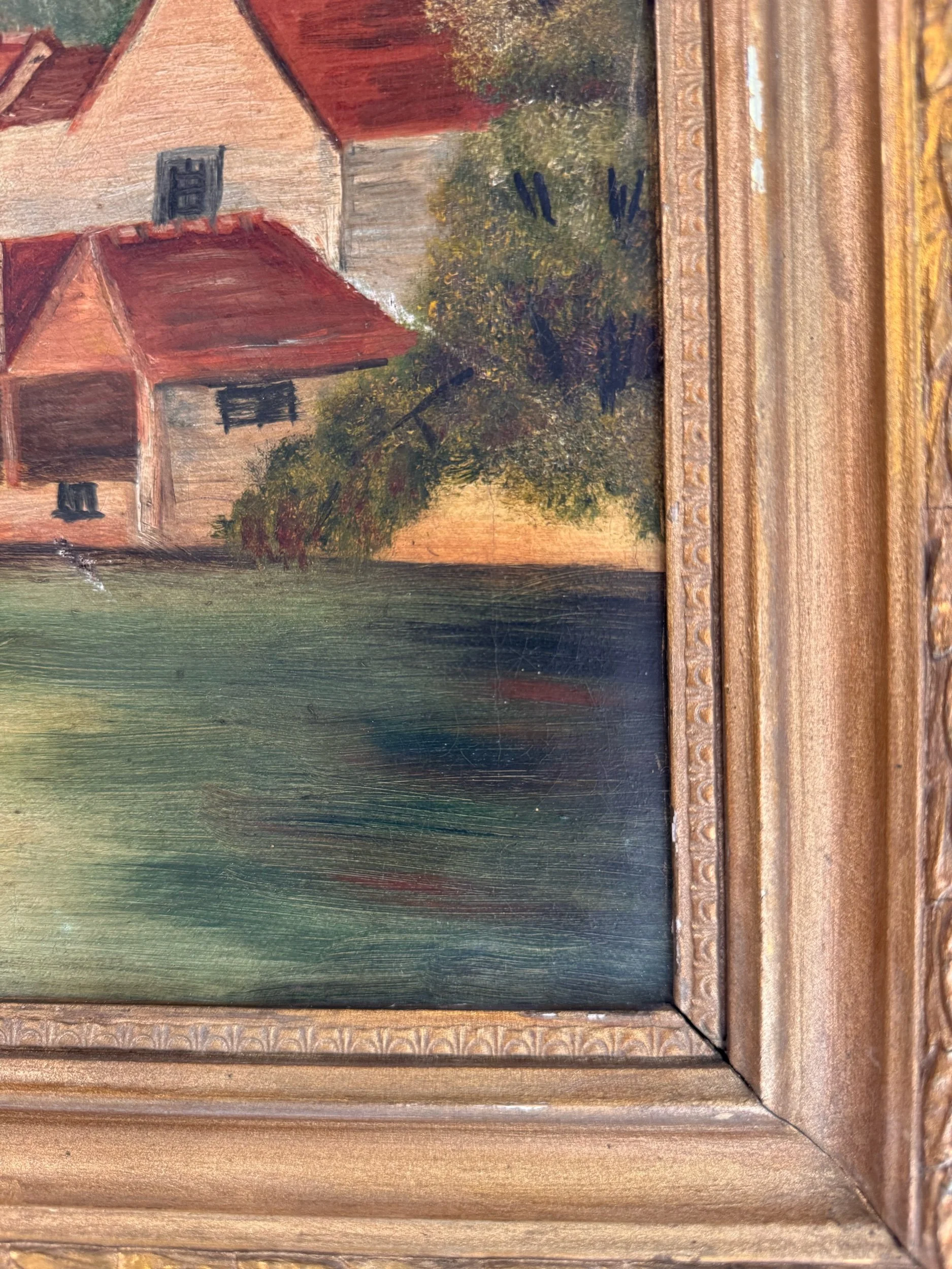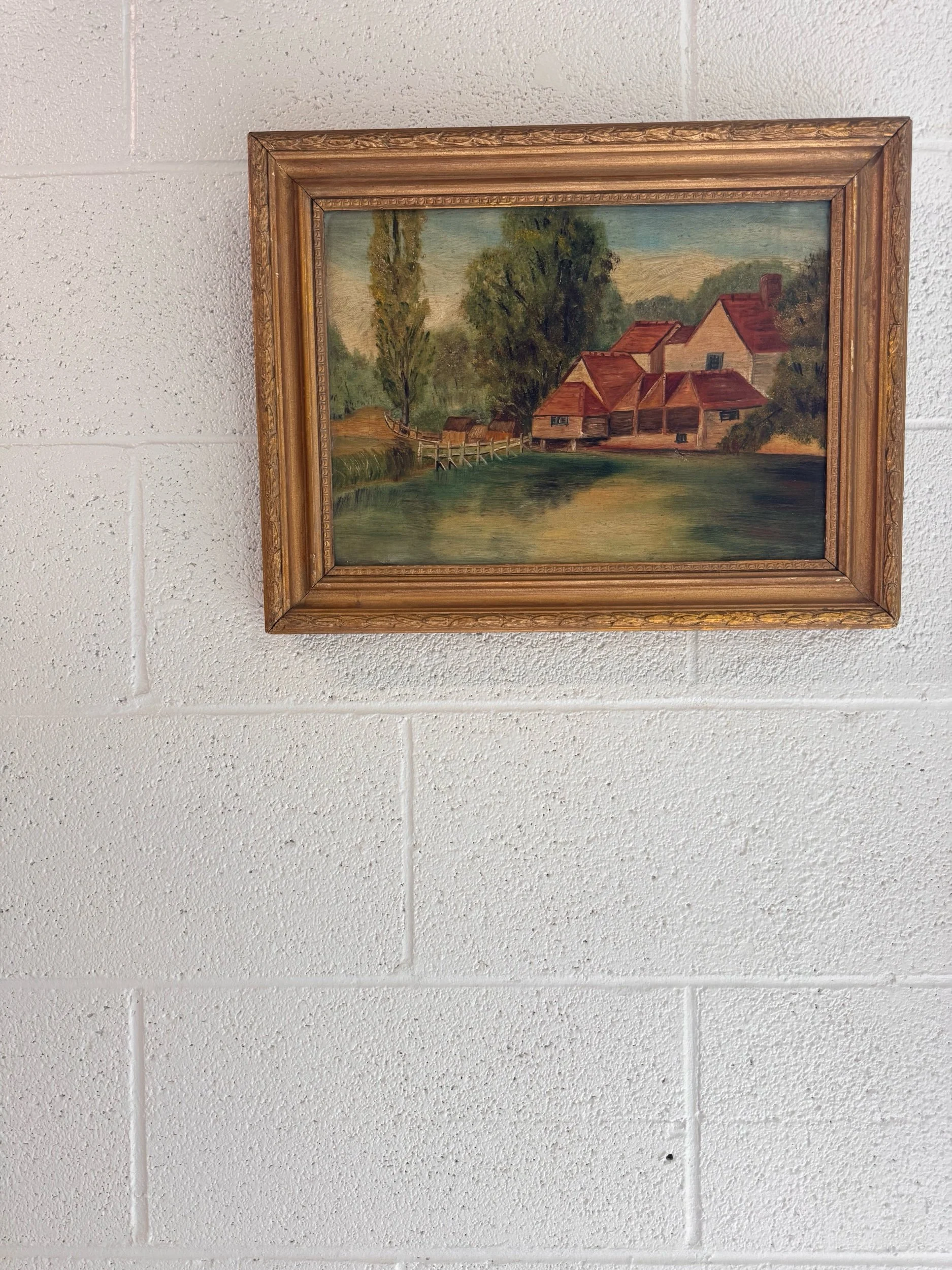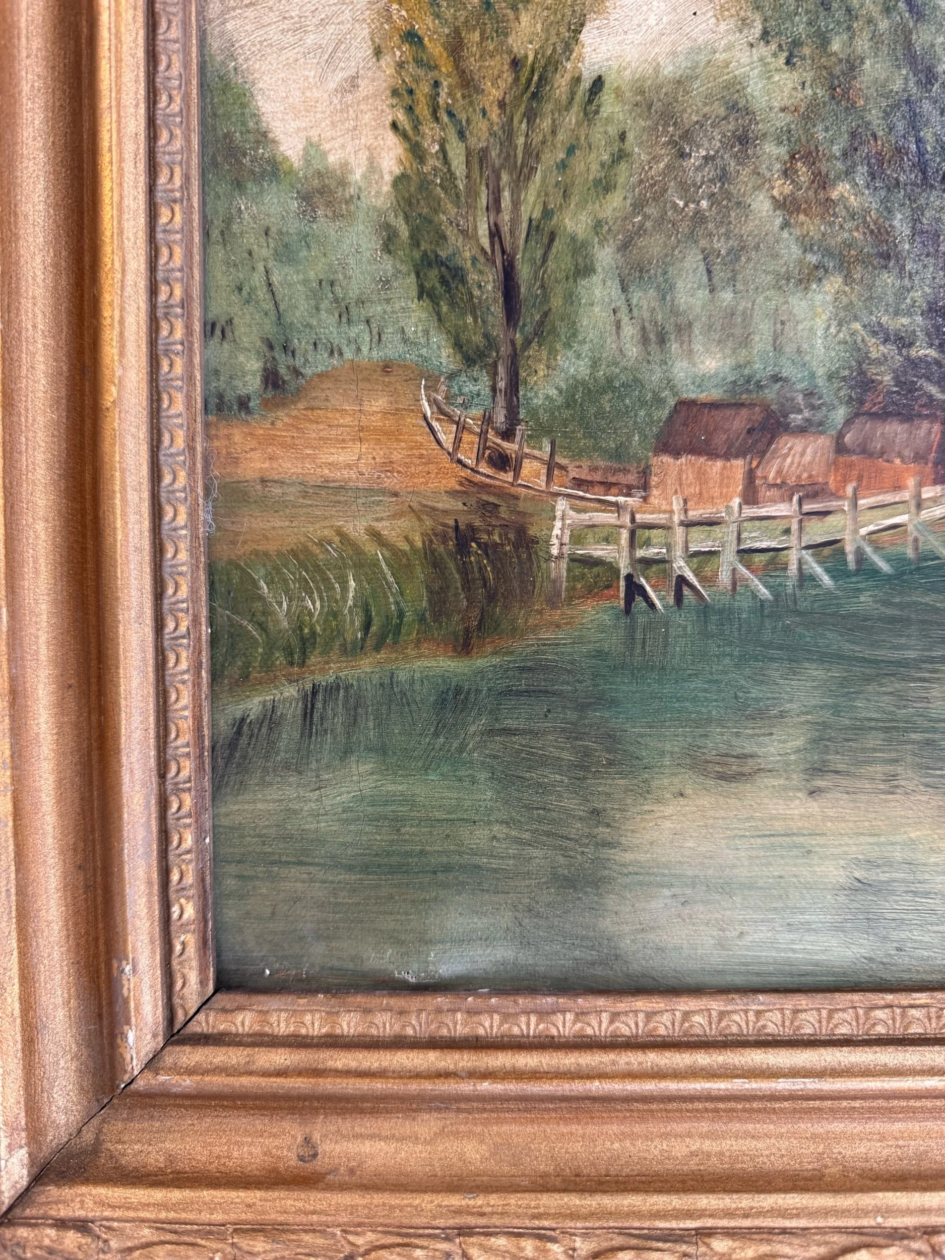 A charming turn-of-the-century oil on canvas depicting a peaceful countryside setting, with red-roofed buildings nestled along the water’s edge and a rustic footbridge leading into the scene. Soft, muted tones and gentle brushwork give this piece a calm, pastoral feel. The piece is a classic European decorative landscape from the early 20th century.