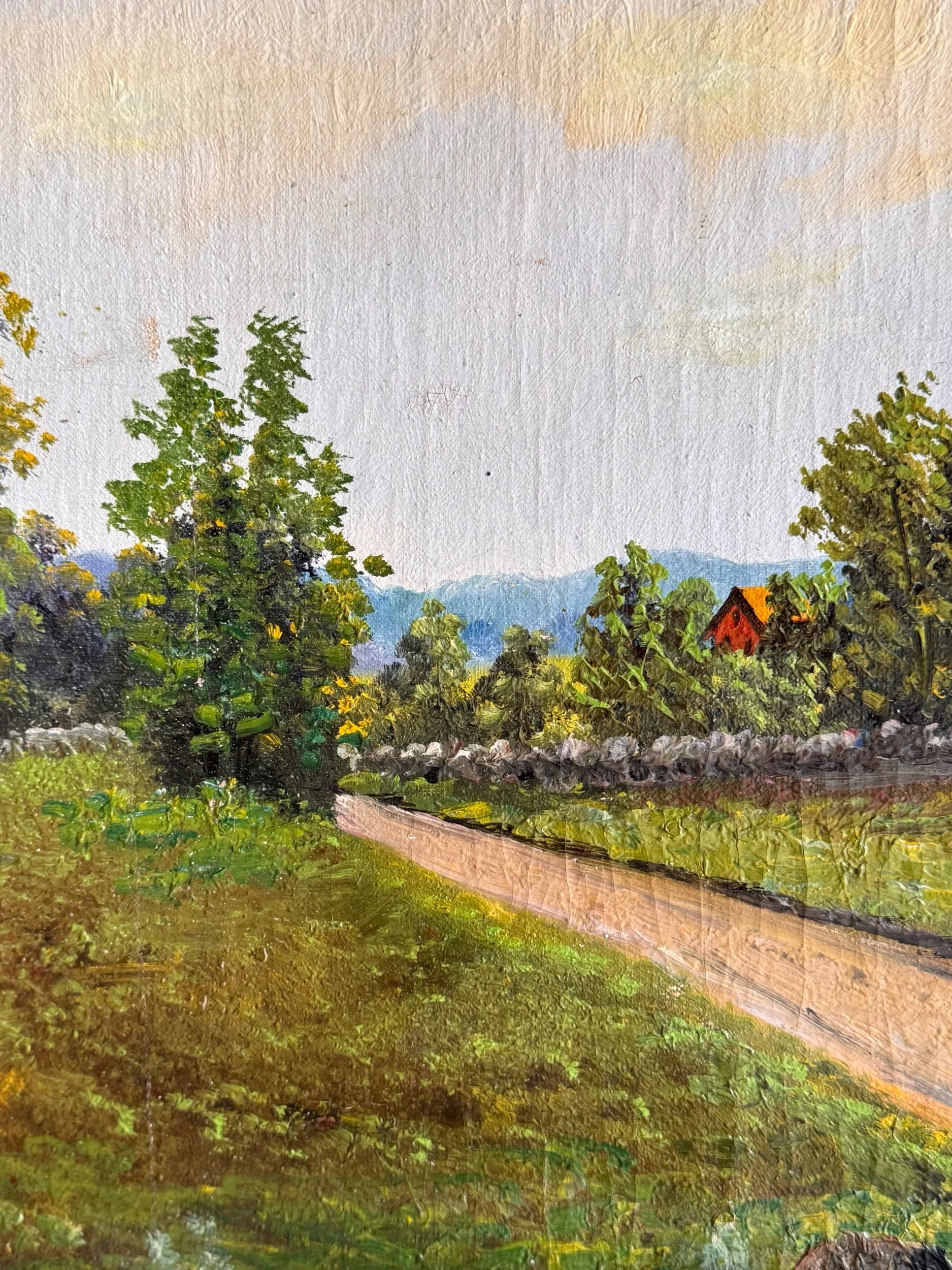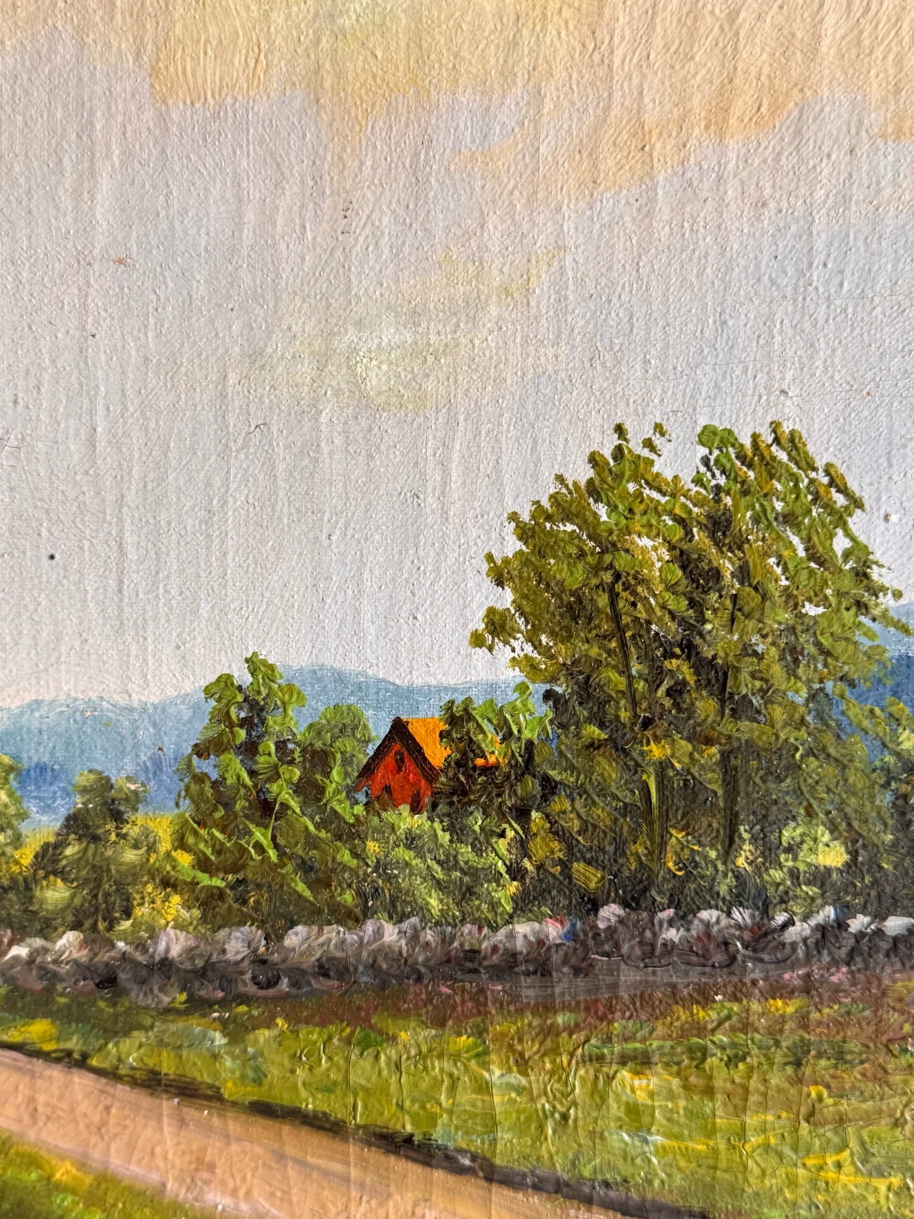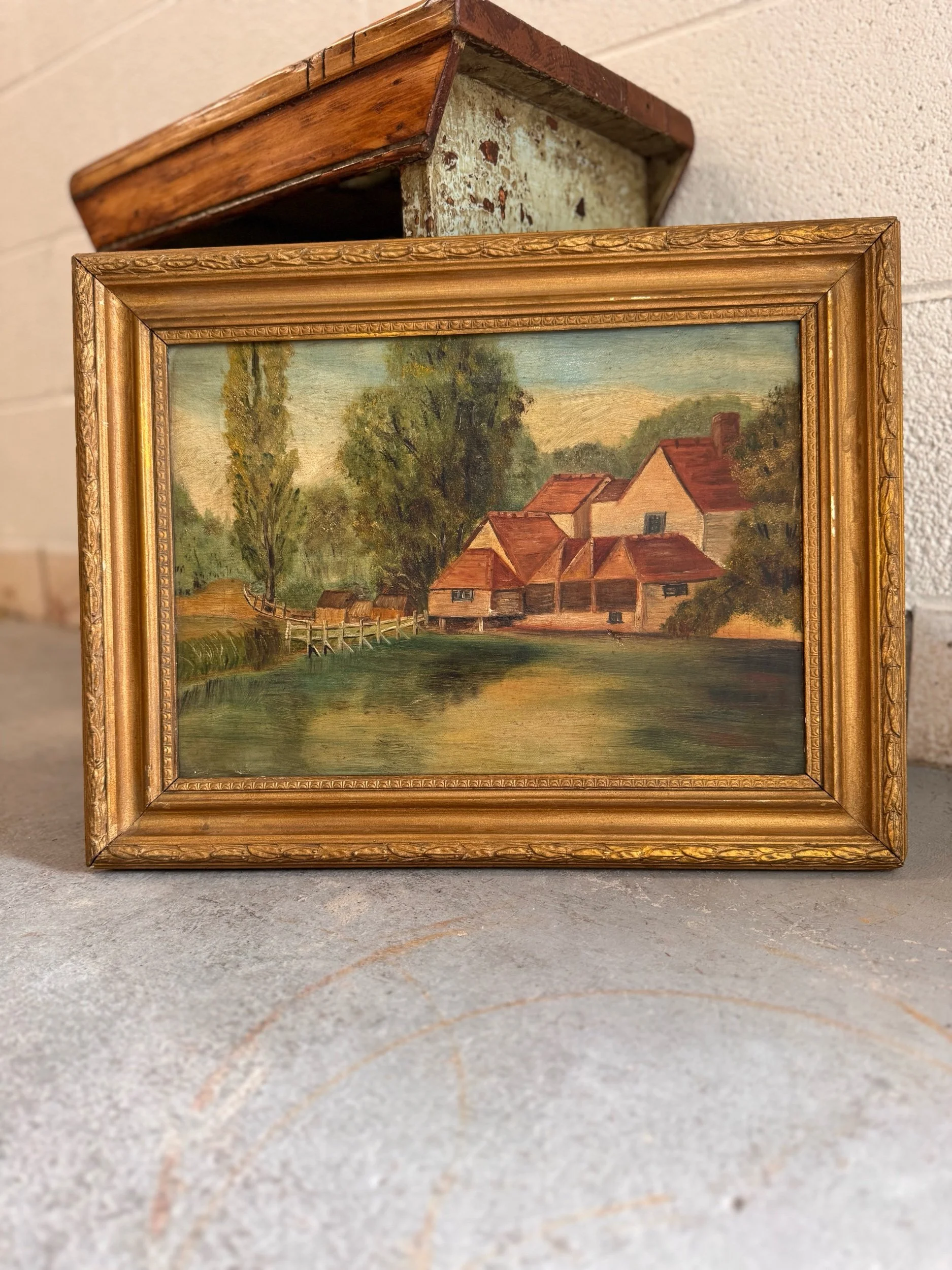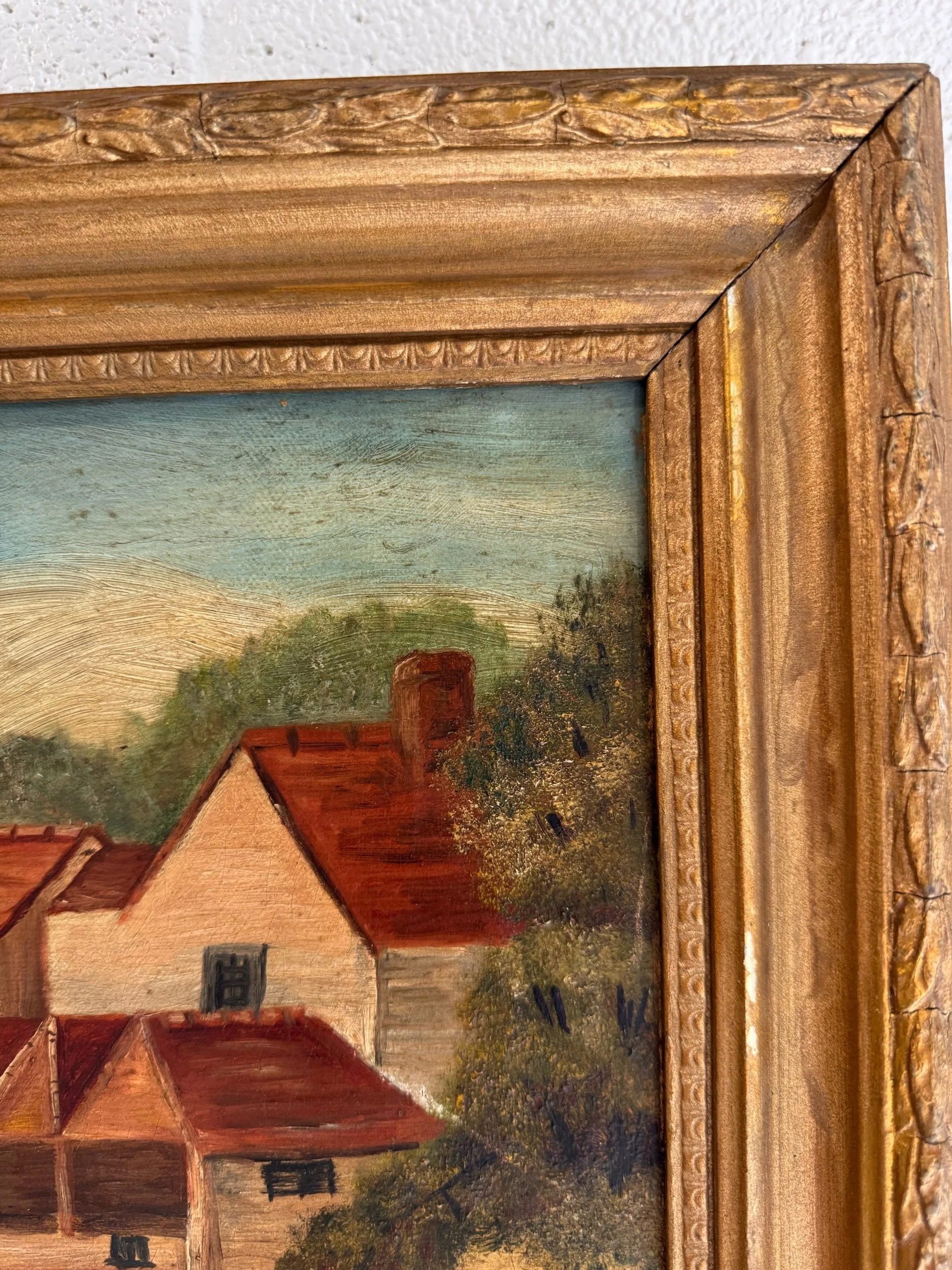 A charming turn-of-the-century oil on canvas depicting a peaceful countryside setting, with red-roofed buildings nestled along the water’s edge and a rustic footbridge leading into the scene. Soft, muted tones and gentle brushwork give this piece a calm, pastoral feel. The piece is a classic European decorative landscape from the early 20th century.