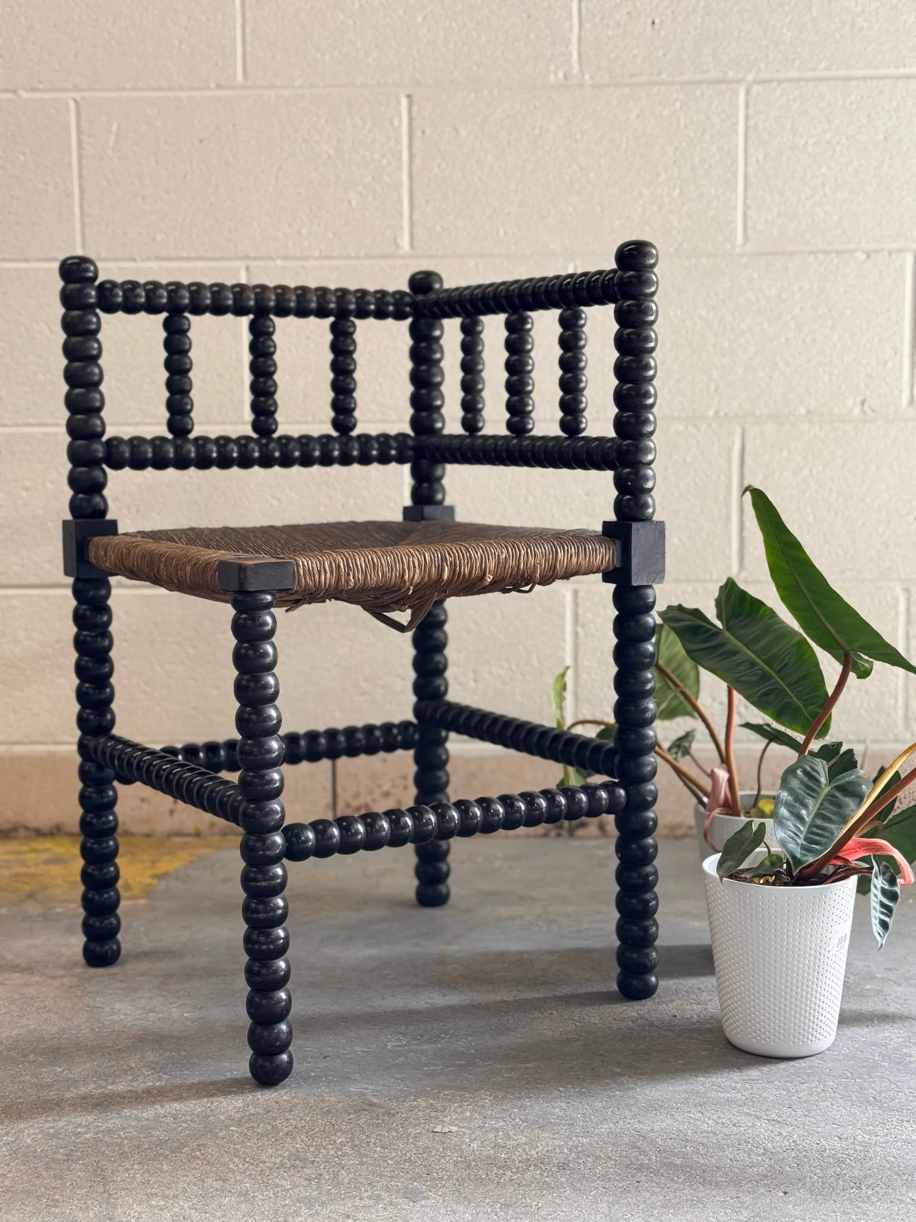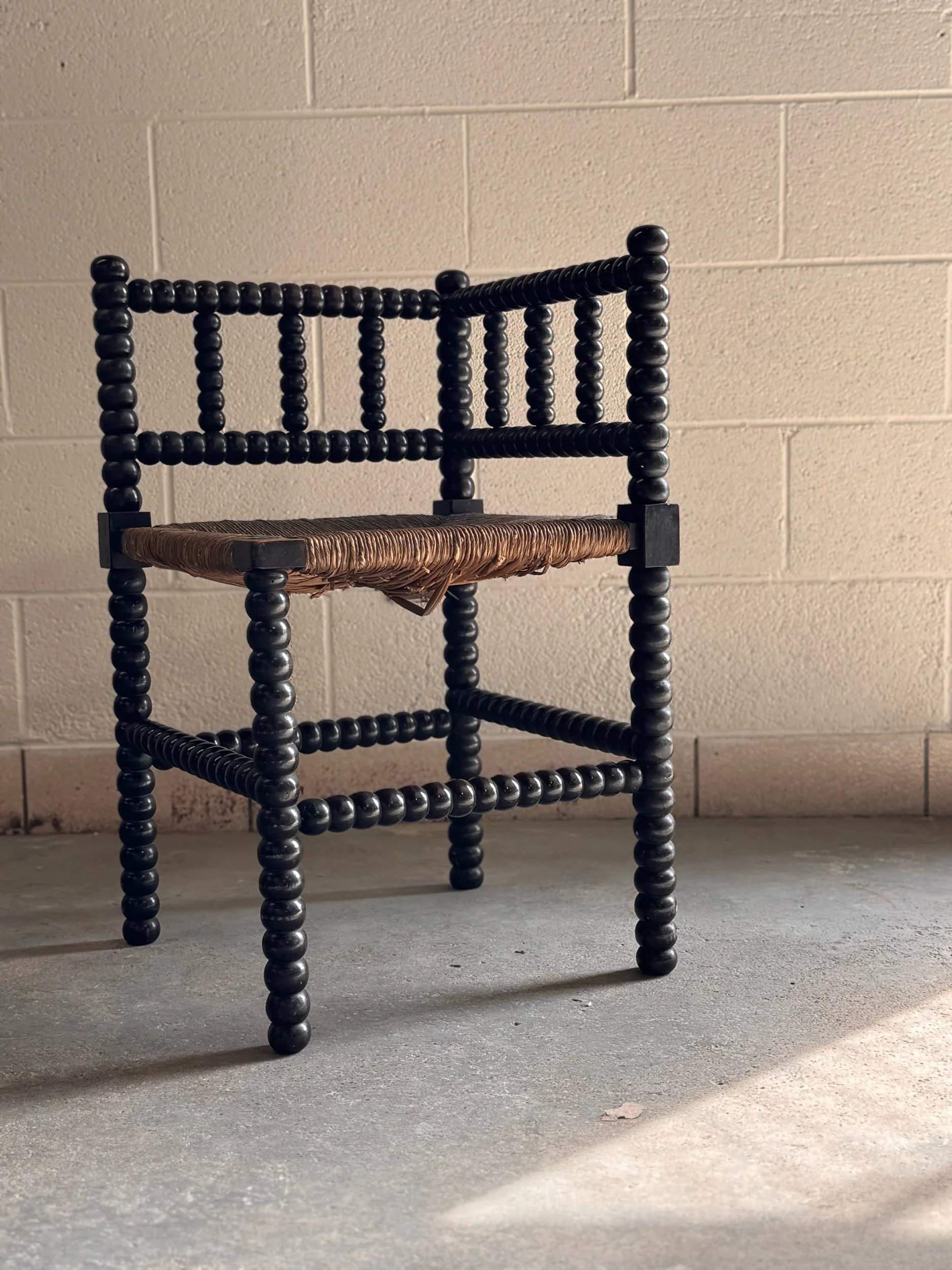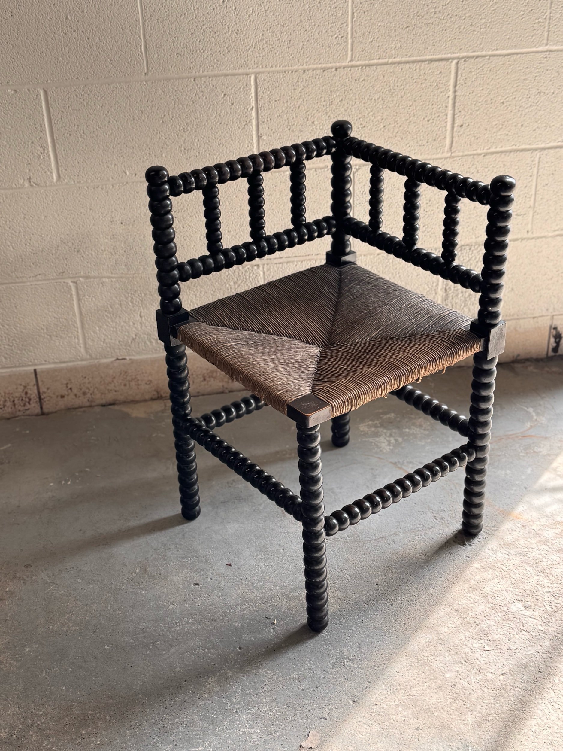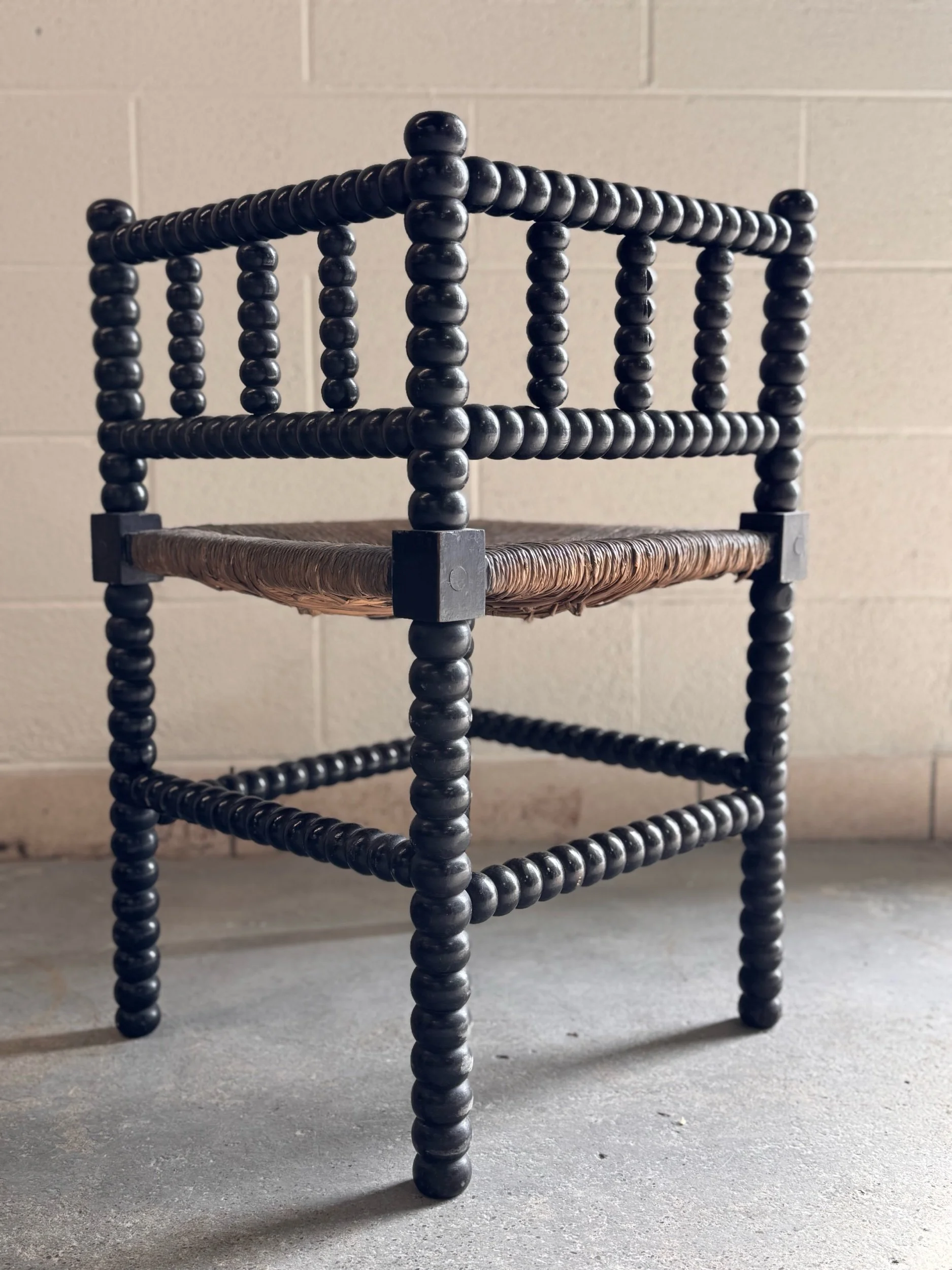 A beautifully sculptural English bobbin corner chair, dating to the early 20th century. Turned by hand in the traditional bobbin (spool) style, this form has roots in 17th-century England and saw a revival during the Arts & Crafts movement, celebrated for its honest craftsmanship and rhythmic detail. The ebonized finish gives it a striking, graphic presence, while the hand-woven rush seat adds warmth and texture. Designed to tuck neatly into a corner, it’s as functional as it is visually compelling. England, circa 1920.
