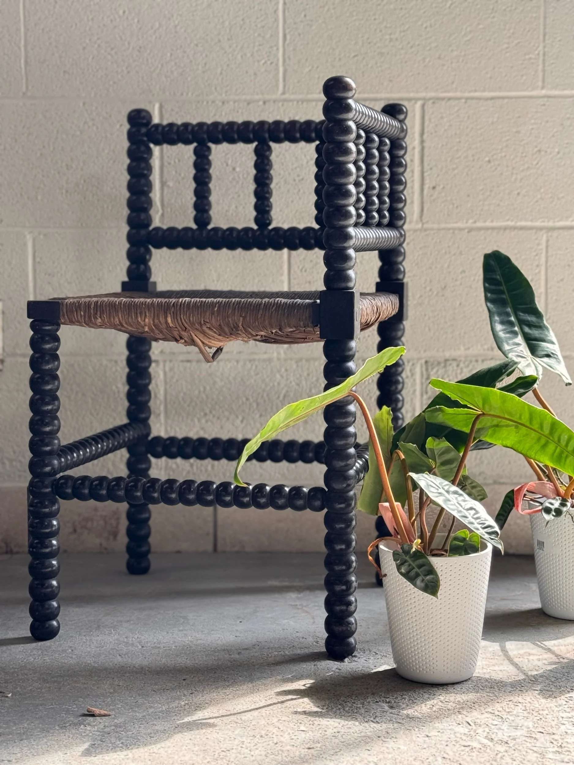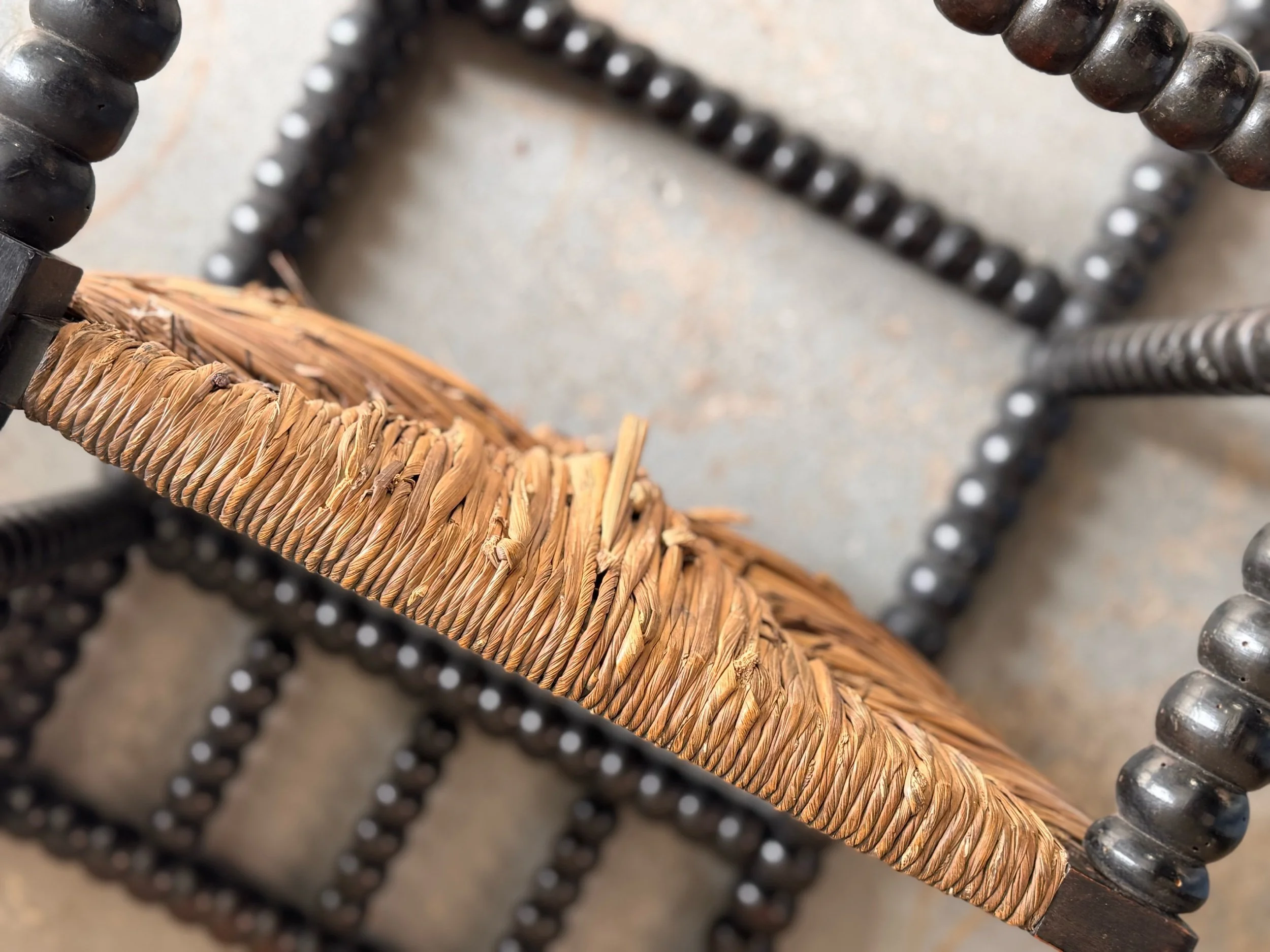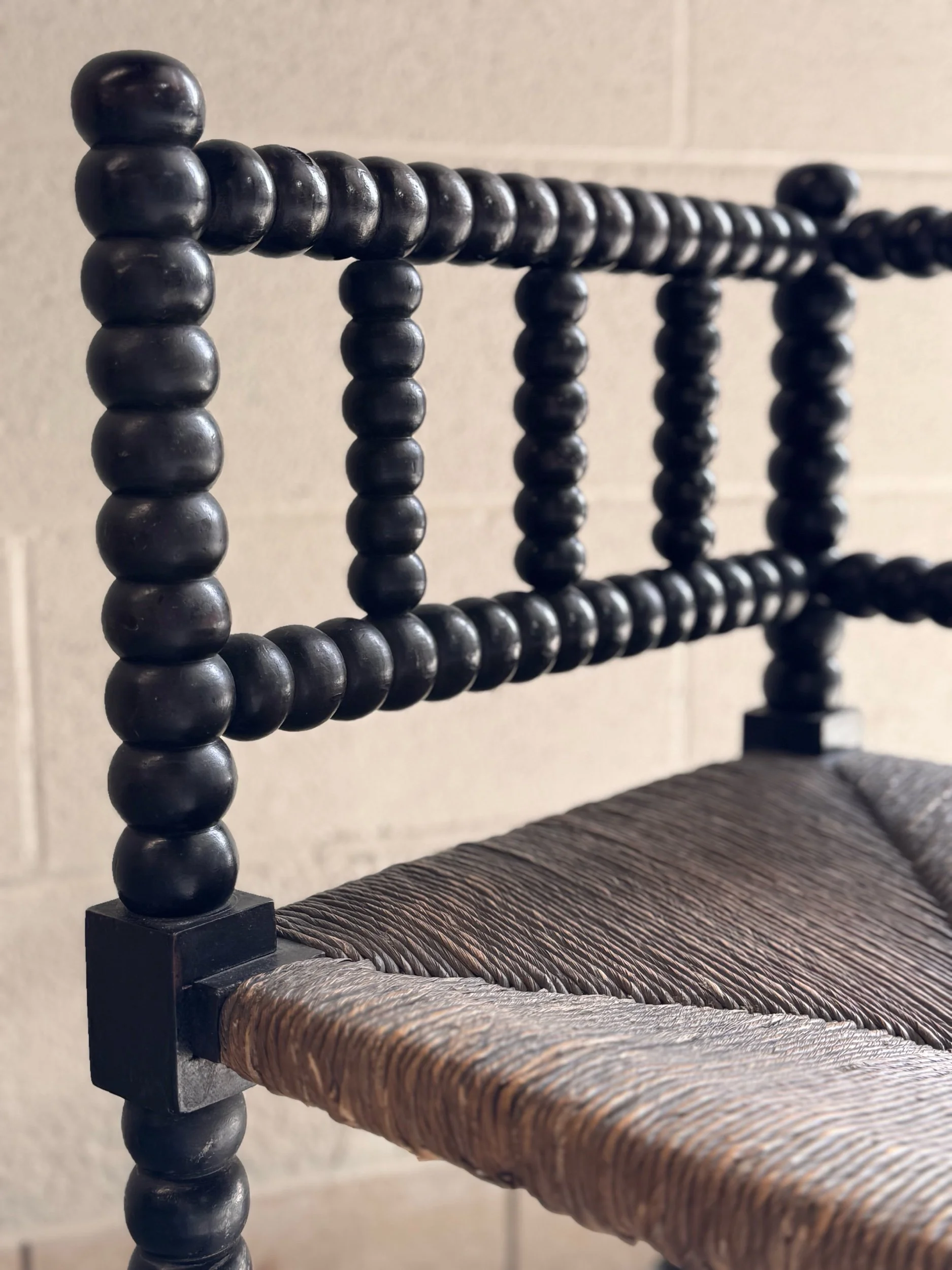 A beautifully sculptural English bobbin corner chair, dating to the early 20th century. Turned by hand in the traditional bobbin (spool) style, this form has roots in 17th-century England and saw a revival during the Arts & Crafts movement, celebrated for its honest craftsmanship and rhythmic detail. The ebonized finish gives it a striking, graphic presence, while the hand-woven rush seat adds warmth and texture. Designed to tuck neatly into a corner, it’s as functional as it is visually compelling. England, circa 1920.