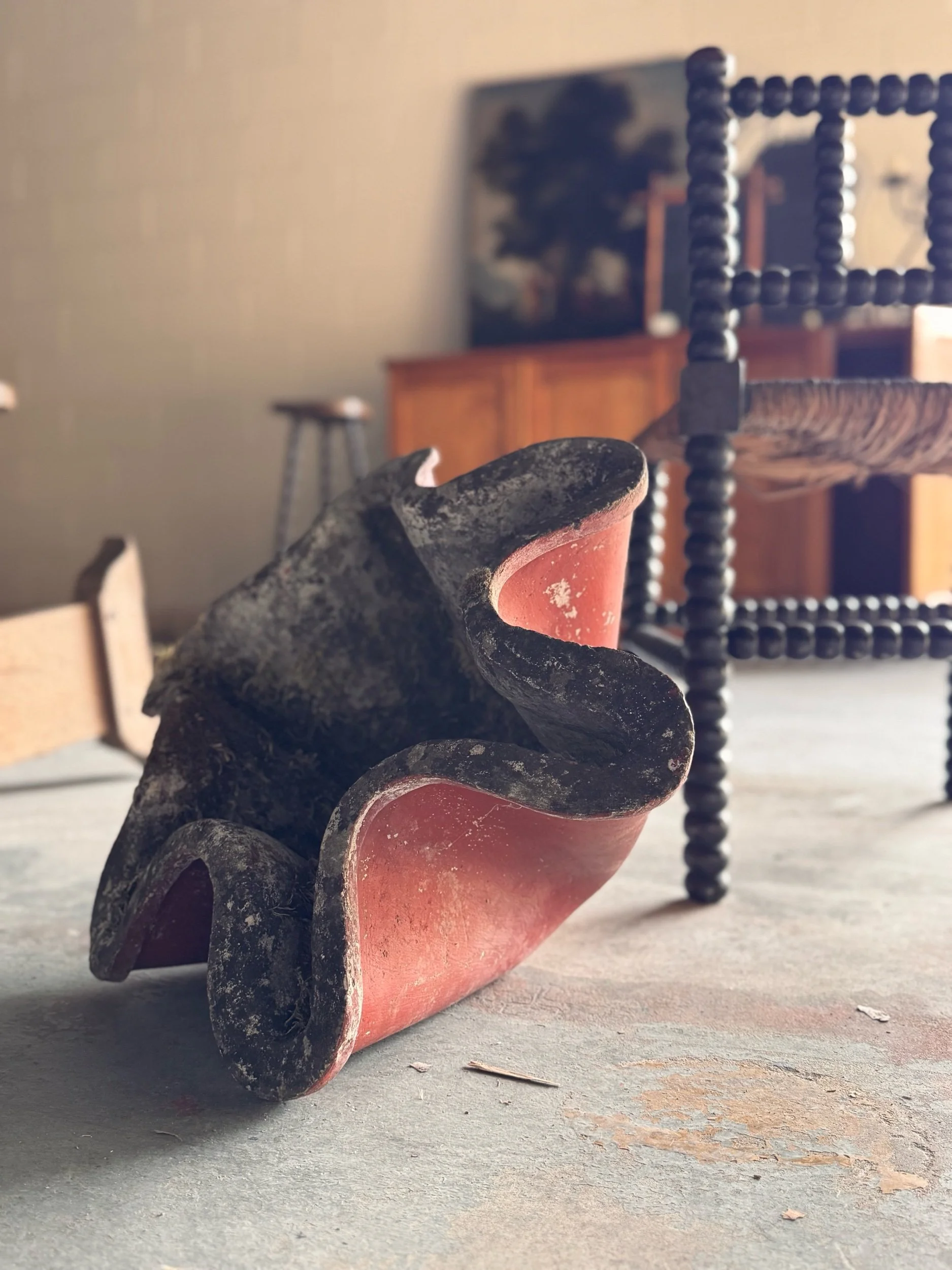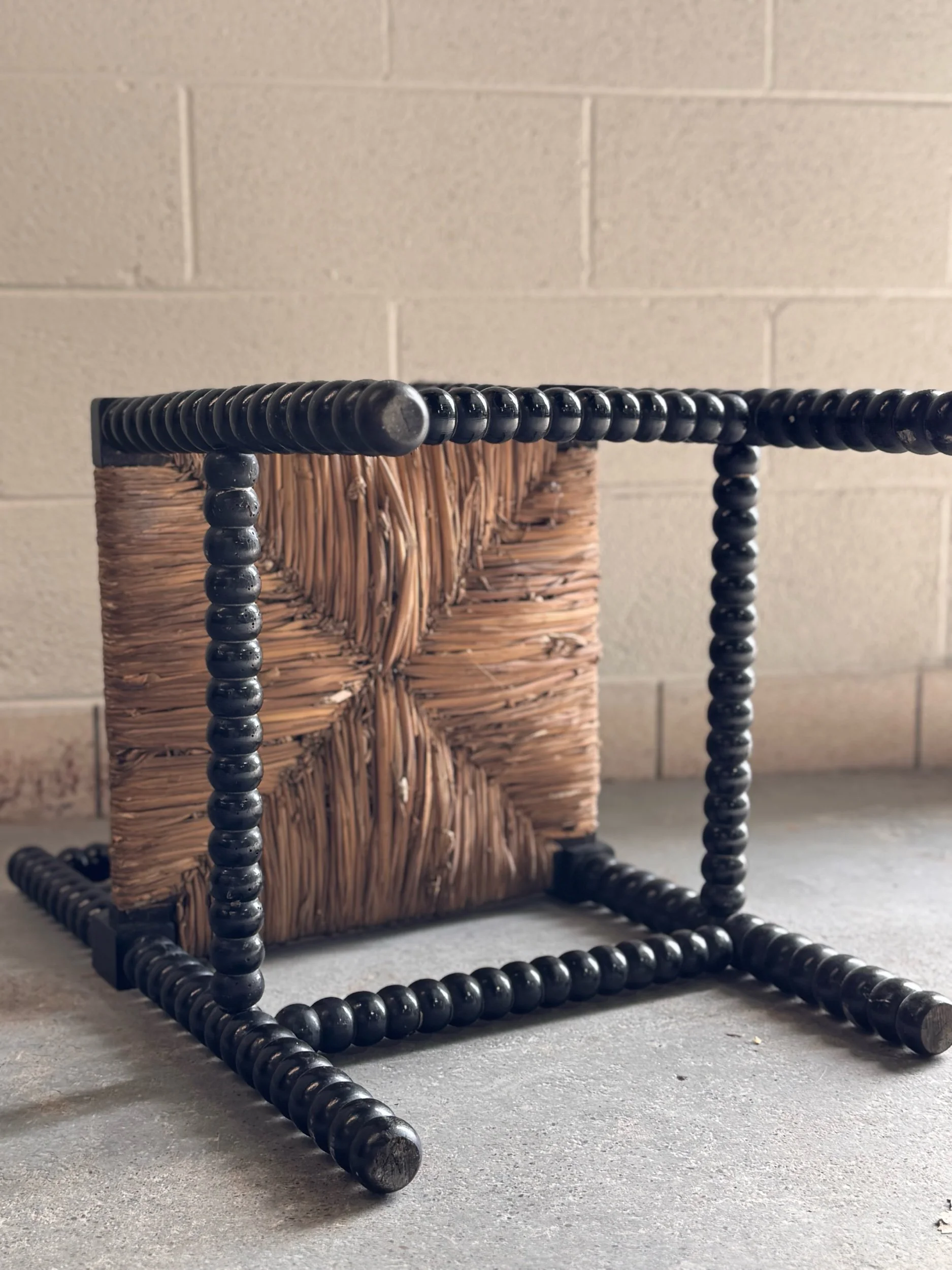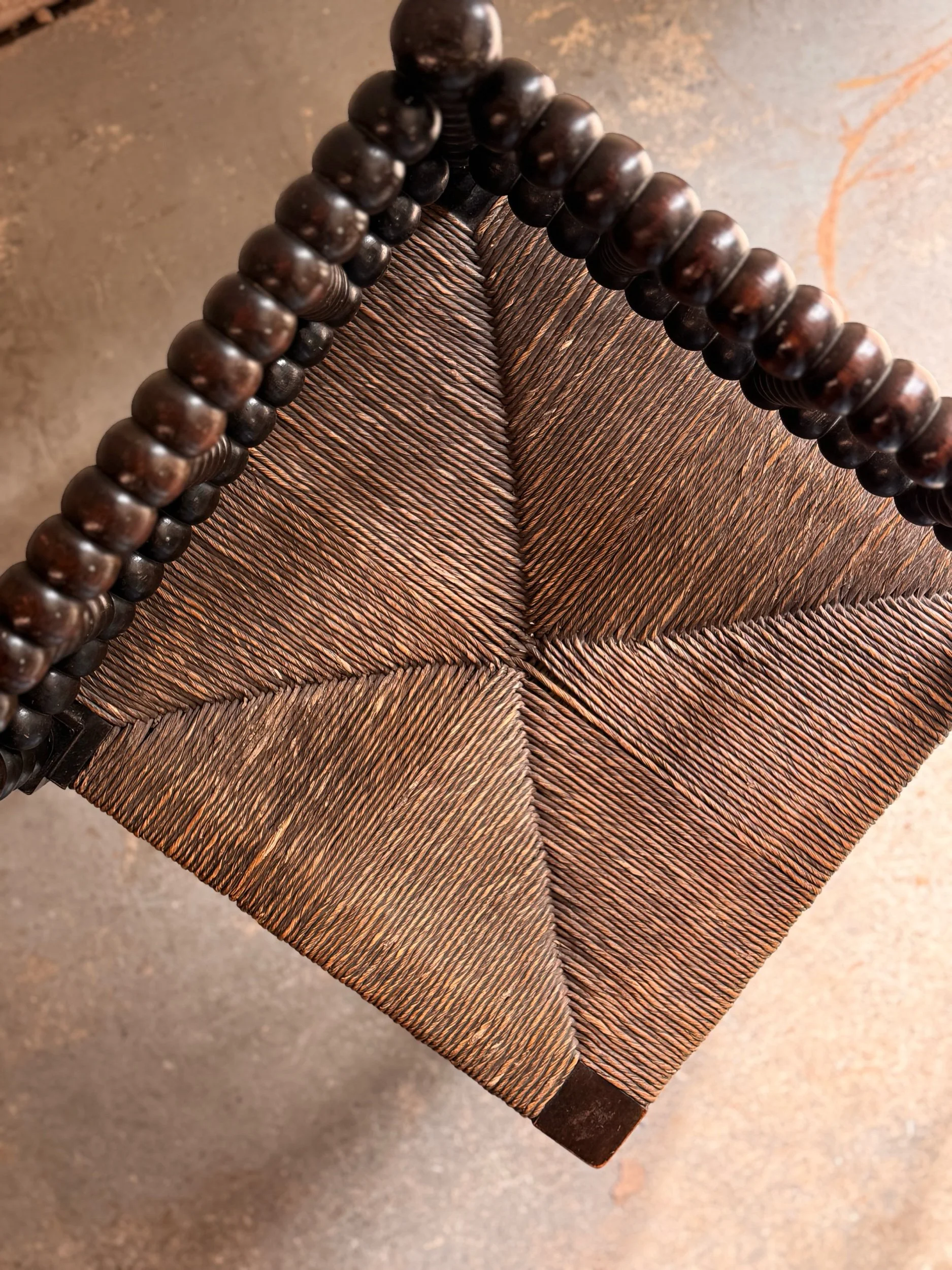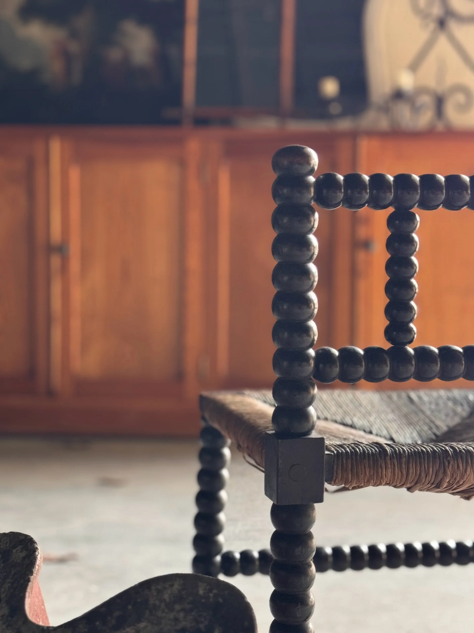 A beautifully sculptural English bobbin corner chair, dating to the early 20th century. Turned by hand in the traditional bobbin (spool) style, this form has roots in 17th-century England and saw a revival during the Arts & Crafts movement, celebrated for its honest craftsmanship and rhythmic detail. The ebonized finish gives it a striking, graphic presence, while the hand-woven rush seat adds warmth and texture. Designed to tuck neatly into a corner, it’s as functional as it is visually compelling. England, circa 1920.