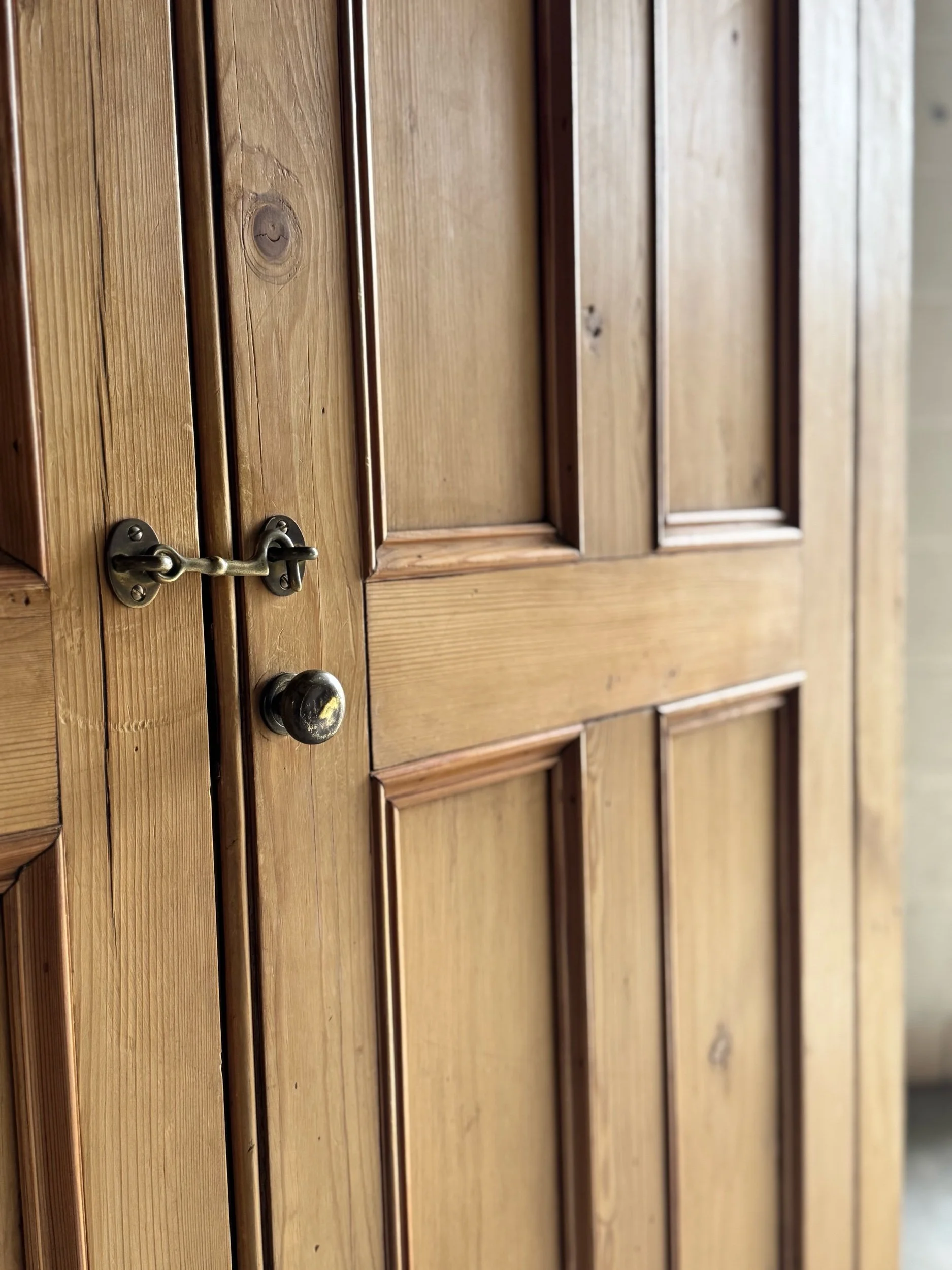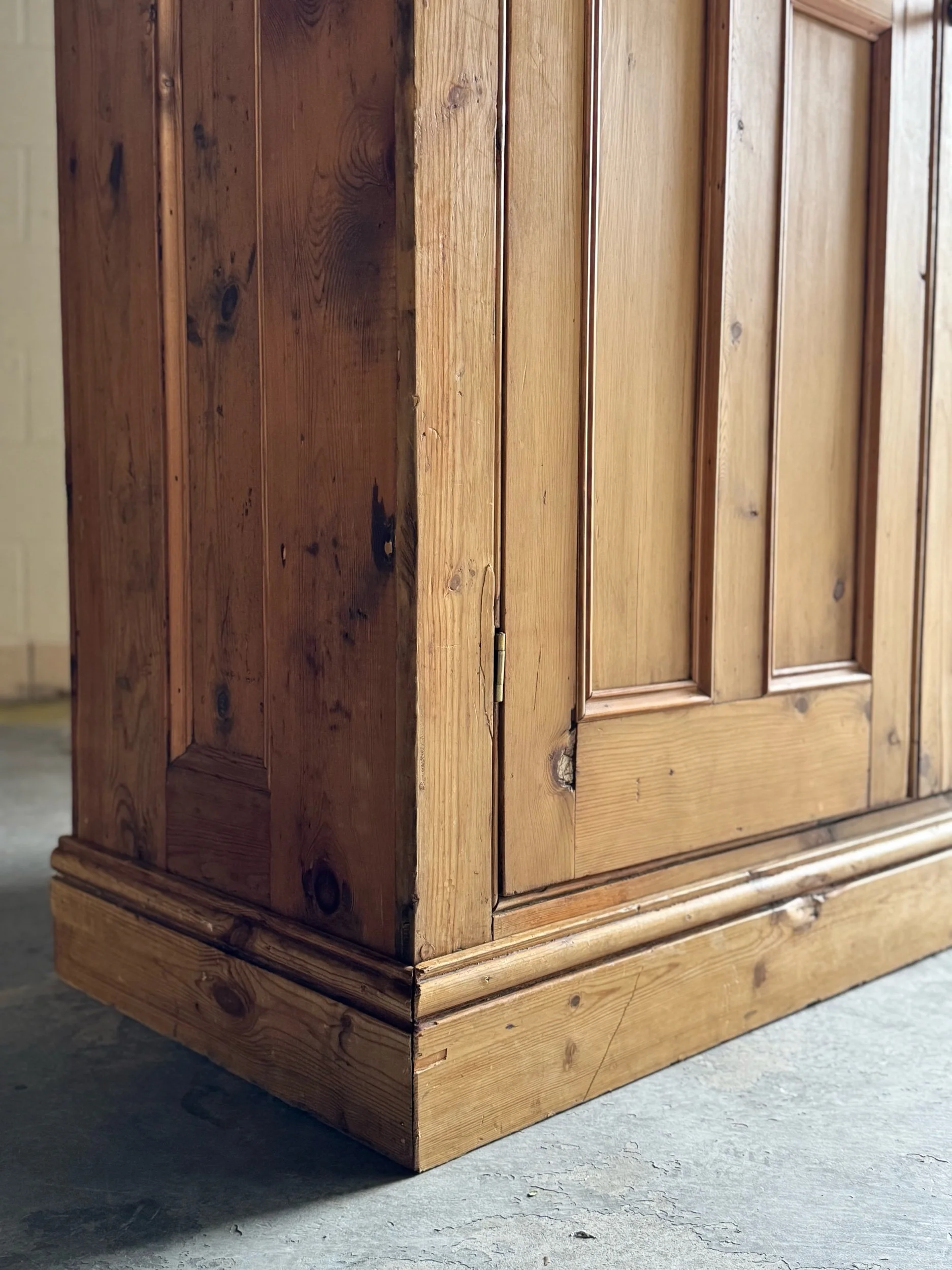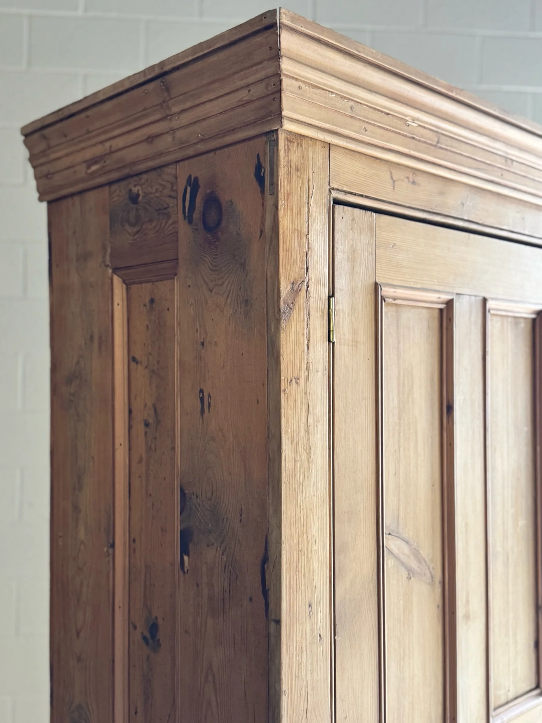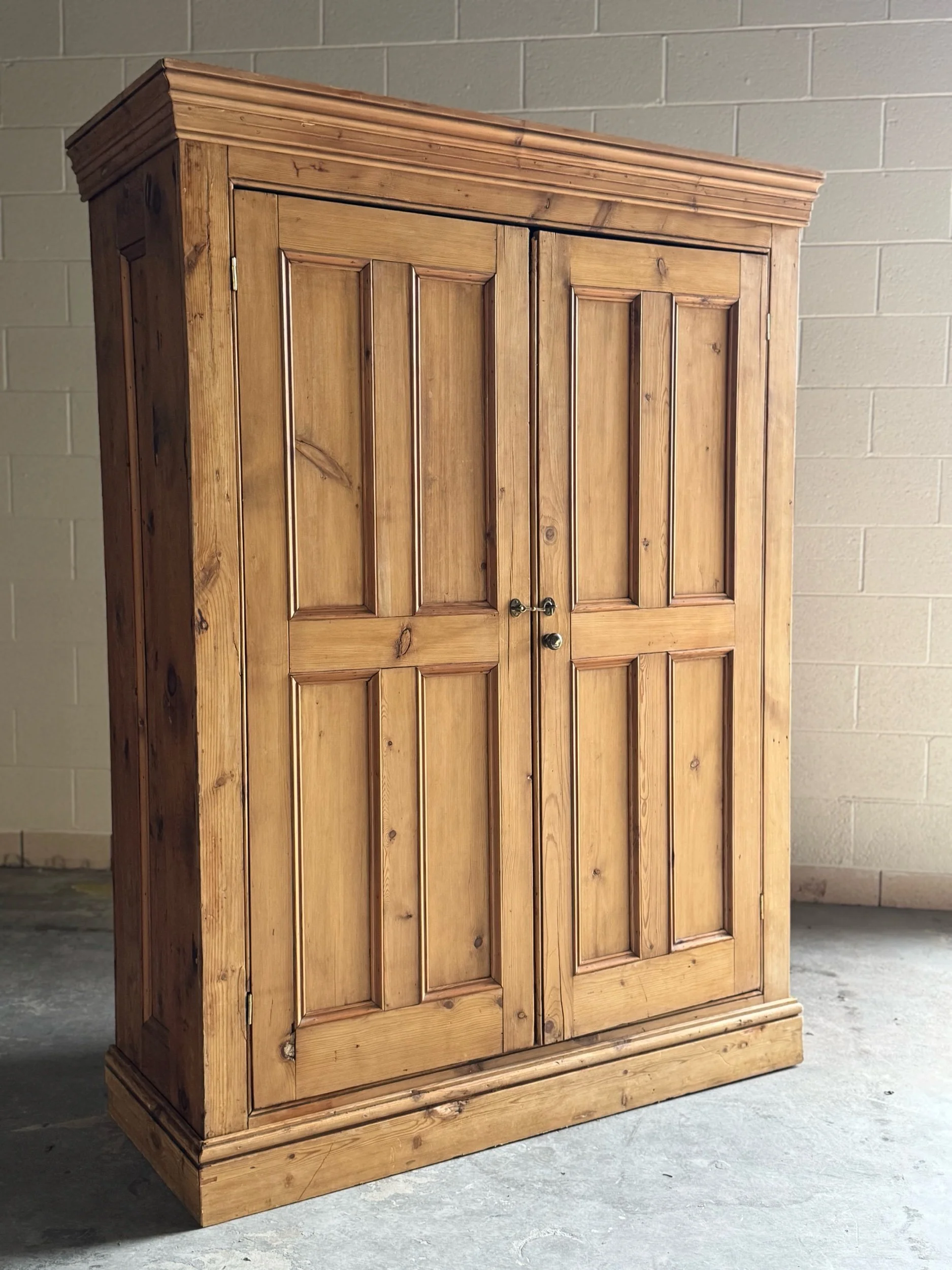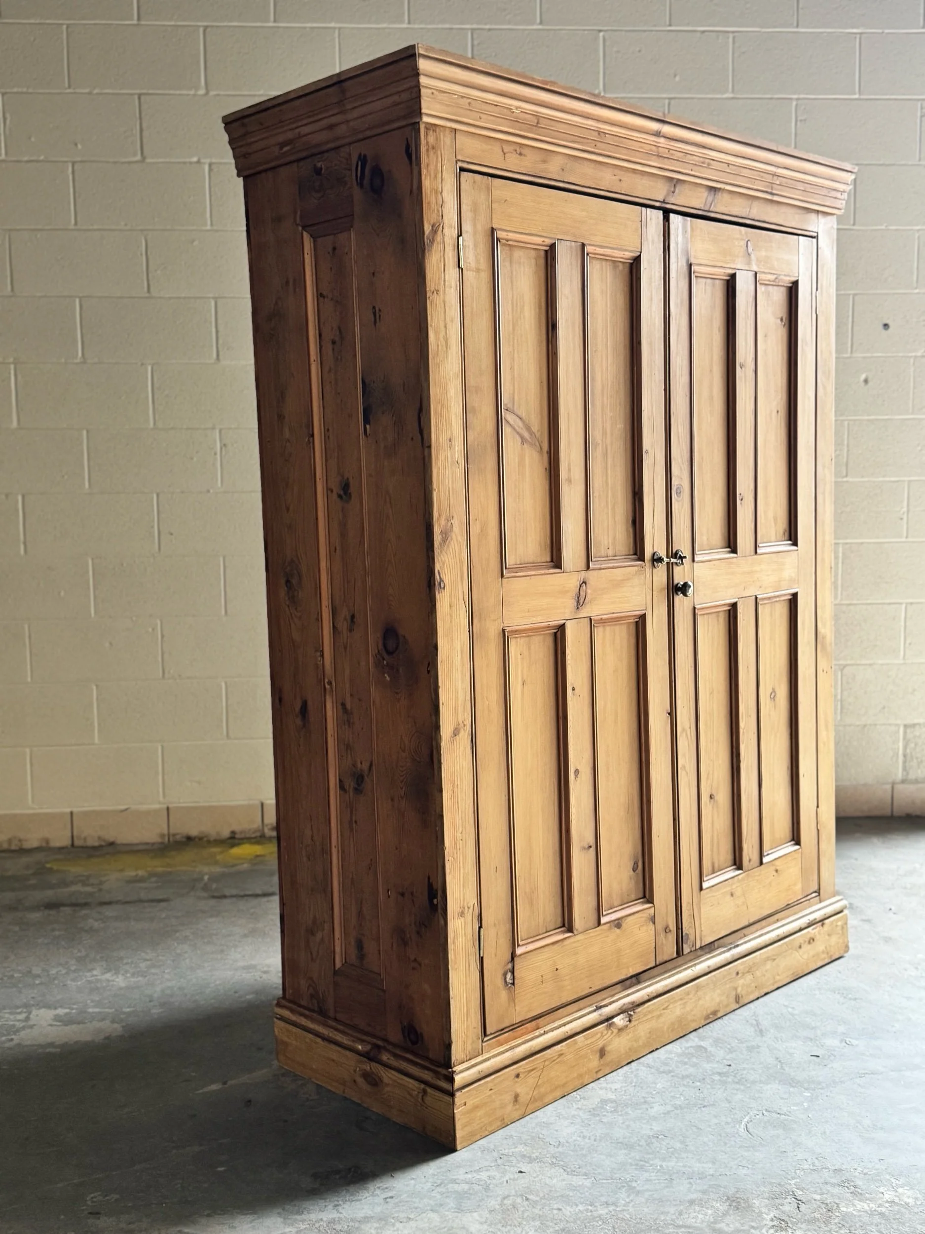 A beautifully simple and increasingly sought-after example of late 19th-century English pine. This wardrobe embodies everything collectors love about the material—warm honey tones, visible knots, and a patina that only develops after well over a century of use. English pine has surged in demand for its versatility and authenticity, equally at home in traditional interiors or paired with more modern spaces.