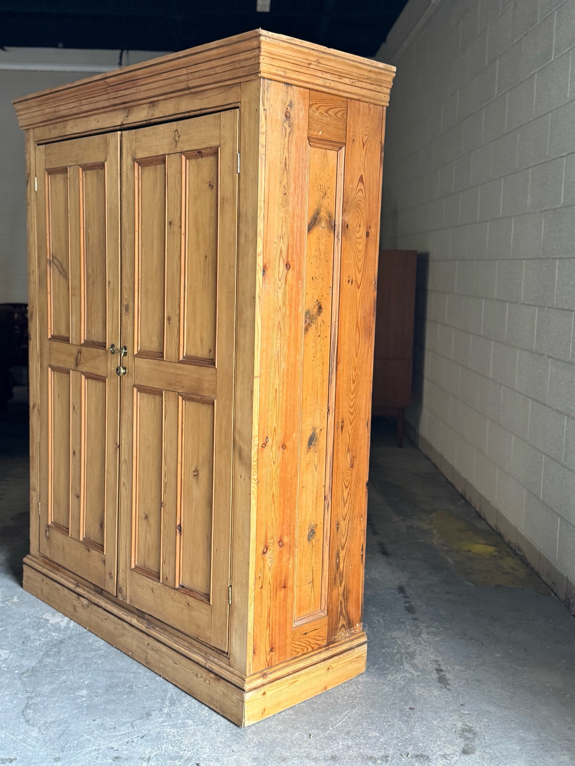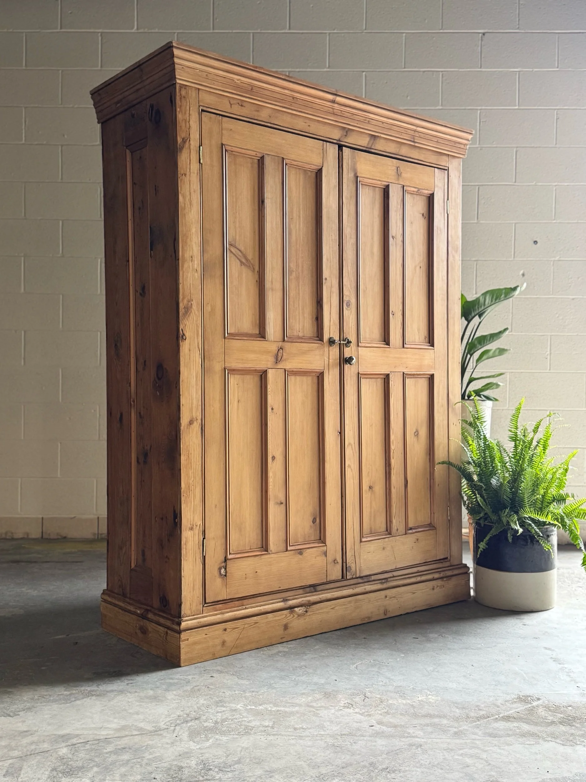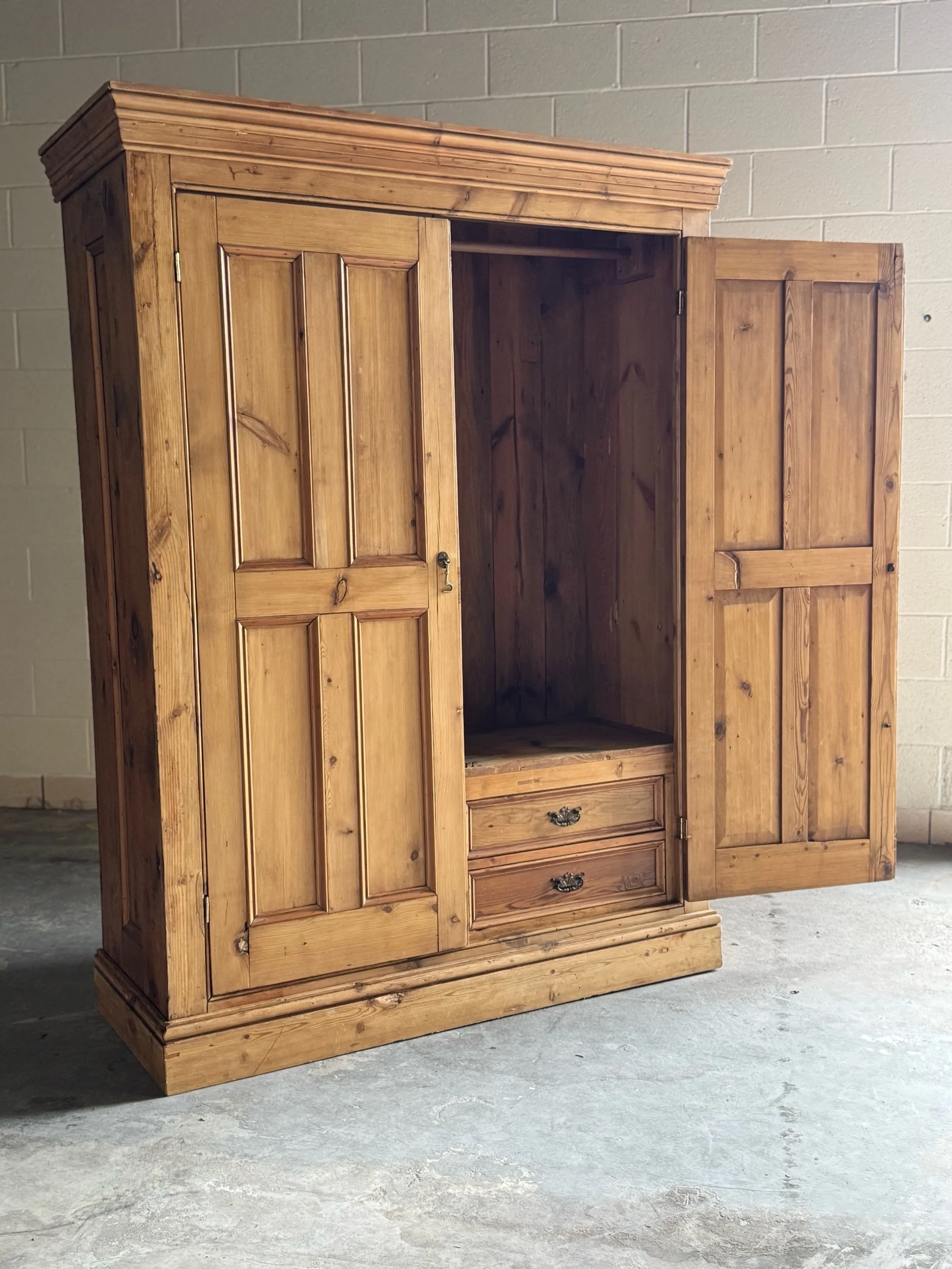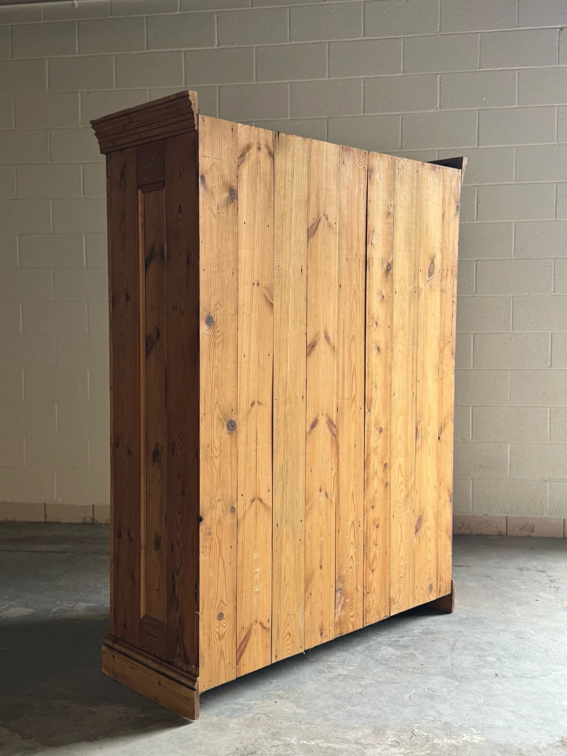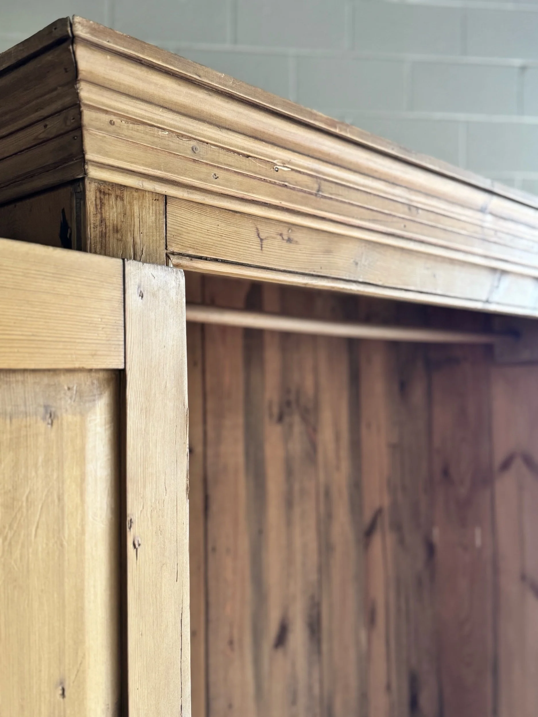 A beautifully simple and increasingly sought-after example of late 19th-century English pine. This wardrobe embodies everything collectors love about the material—warm honey tones, visible knots, and a patina that only develops after well over a century of use. English pine has surged in demand for its versatility and authenticity, equally at home in traditional interiors or paired with more modern spaces.