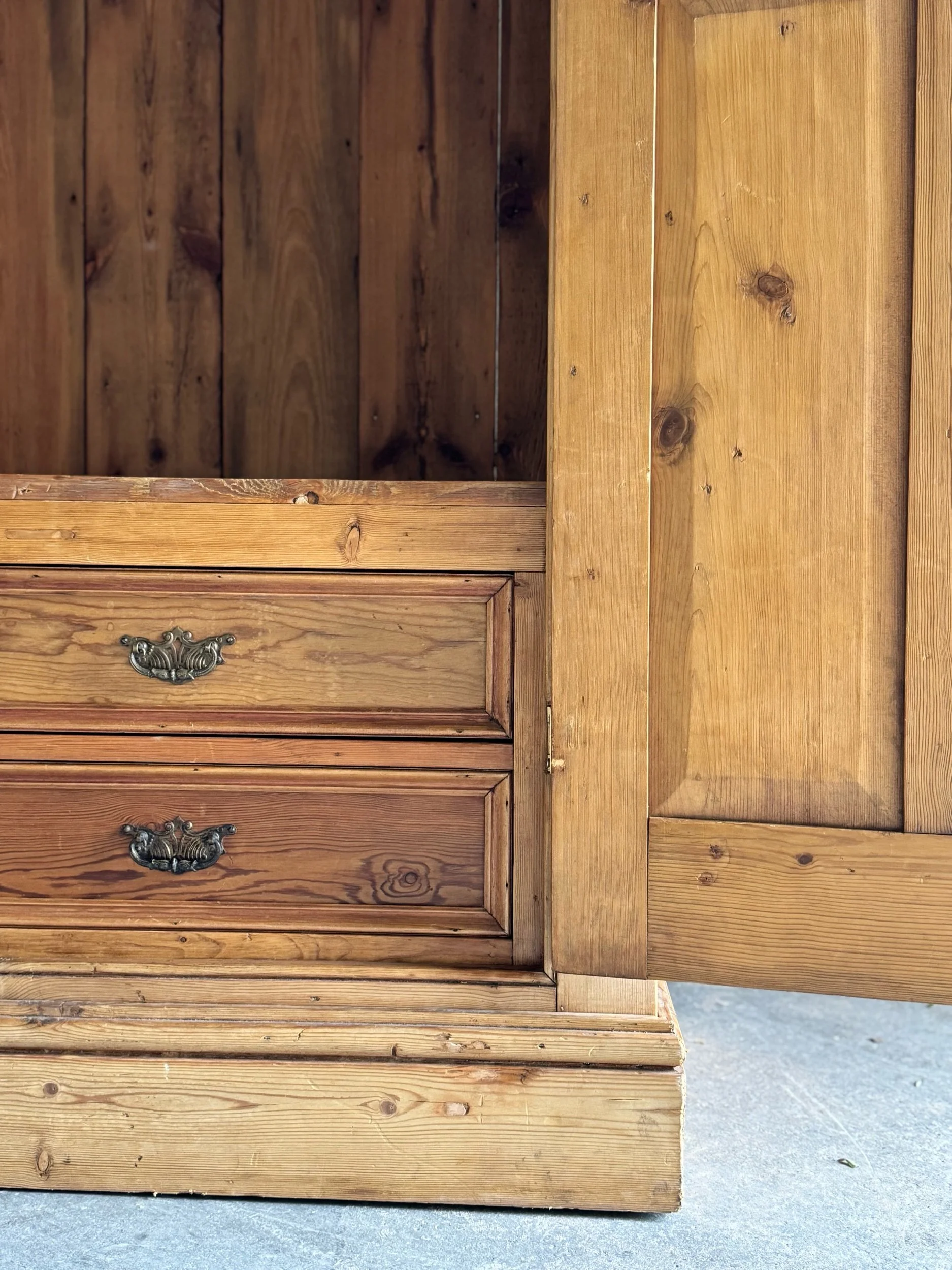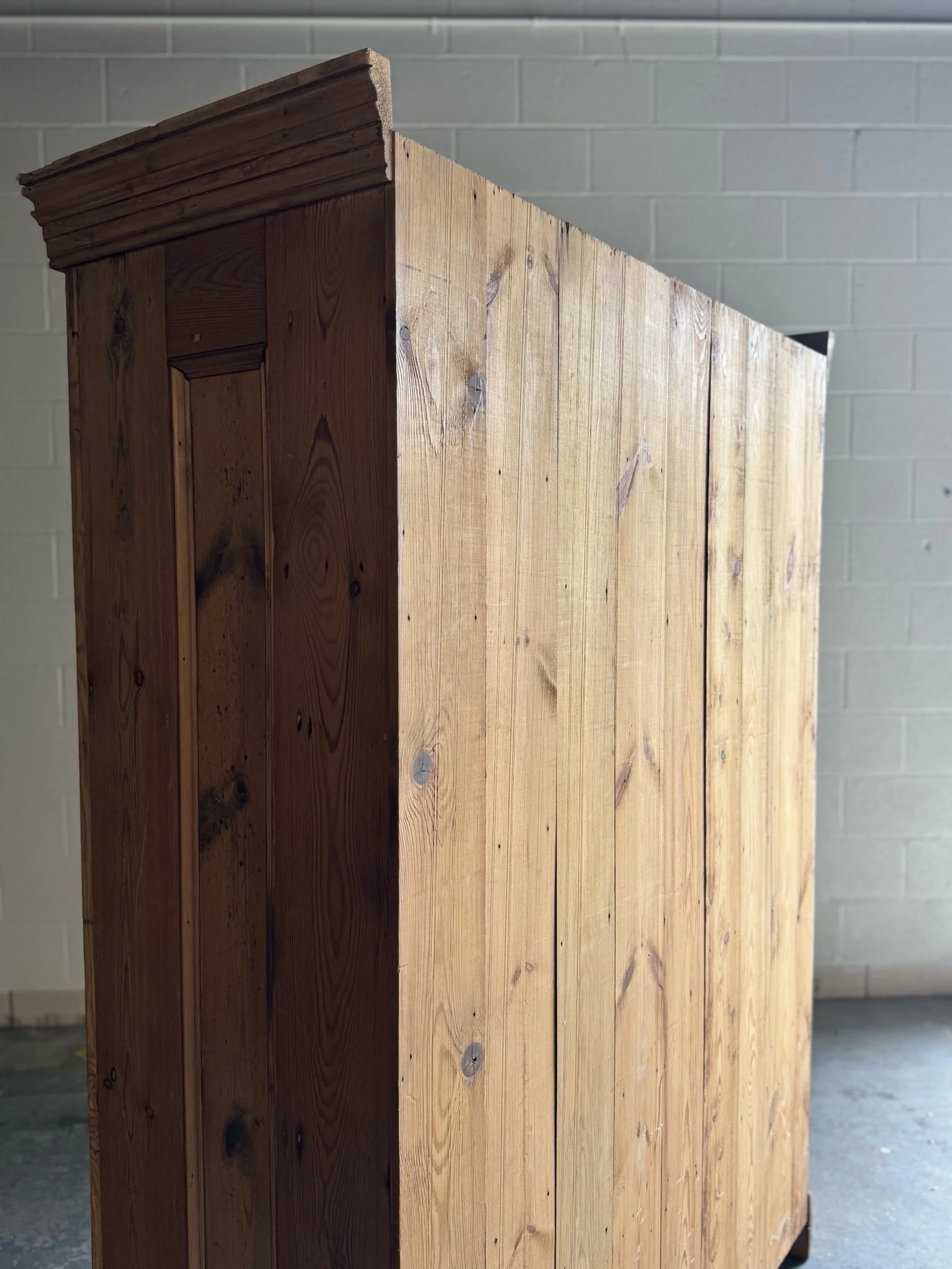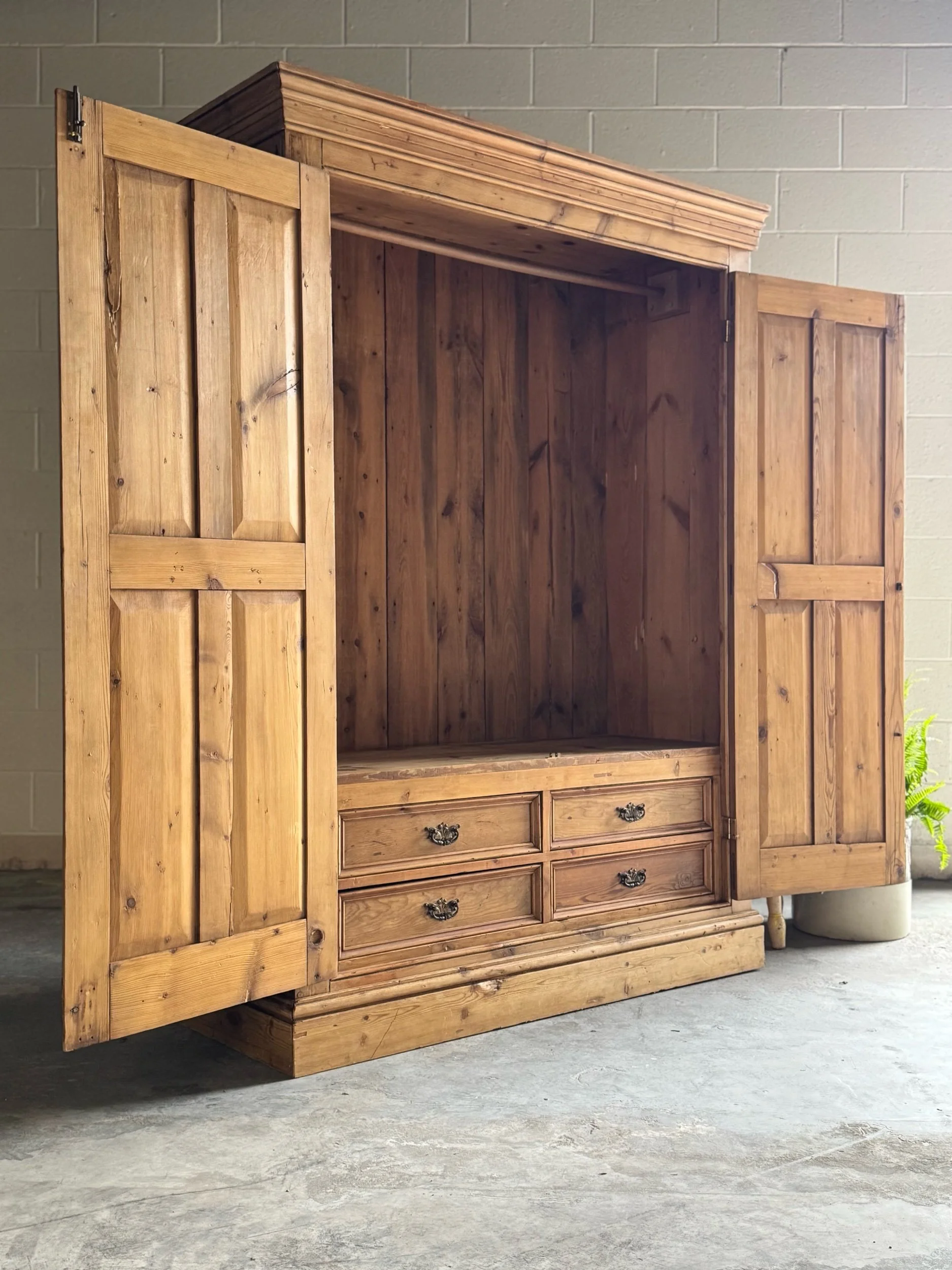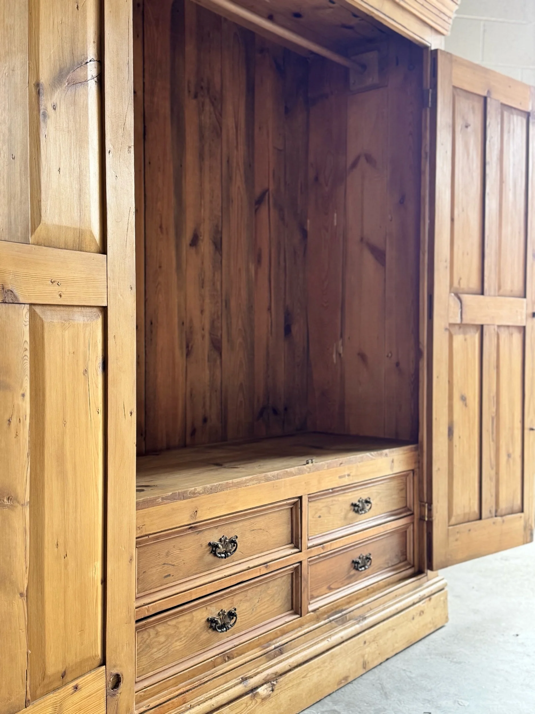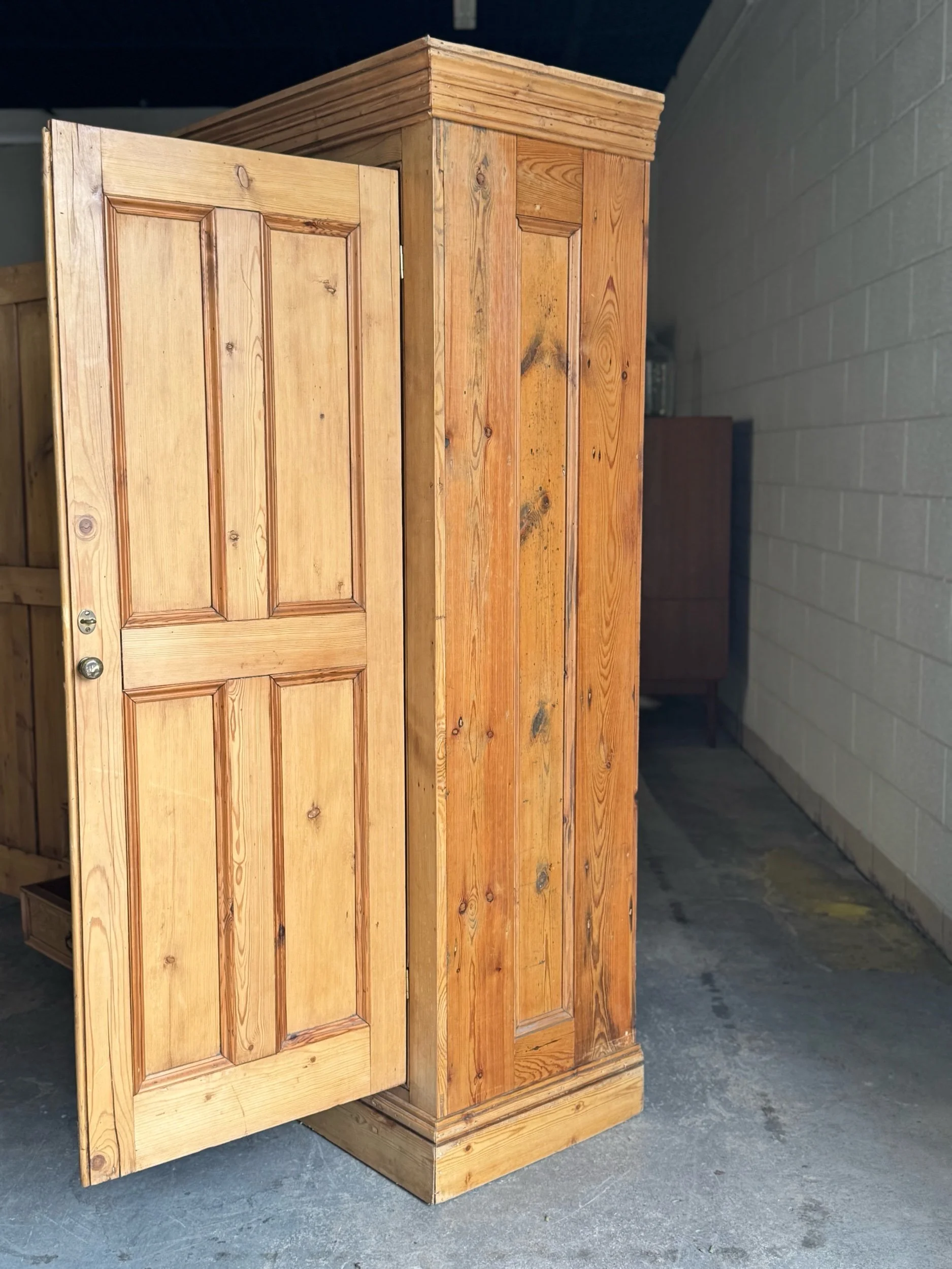A beautifully simple and increasingly sought-after example of late 19th-century English pine. This wardrobe embodies everything collectors love about the material—warm honey tones, visible knots, and a patina that only develops after well over a century of use. English pine has surged in demand for its versatility and authenticity, equally at home in traditional interiors or paired with more modern spaces.