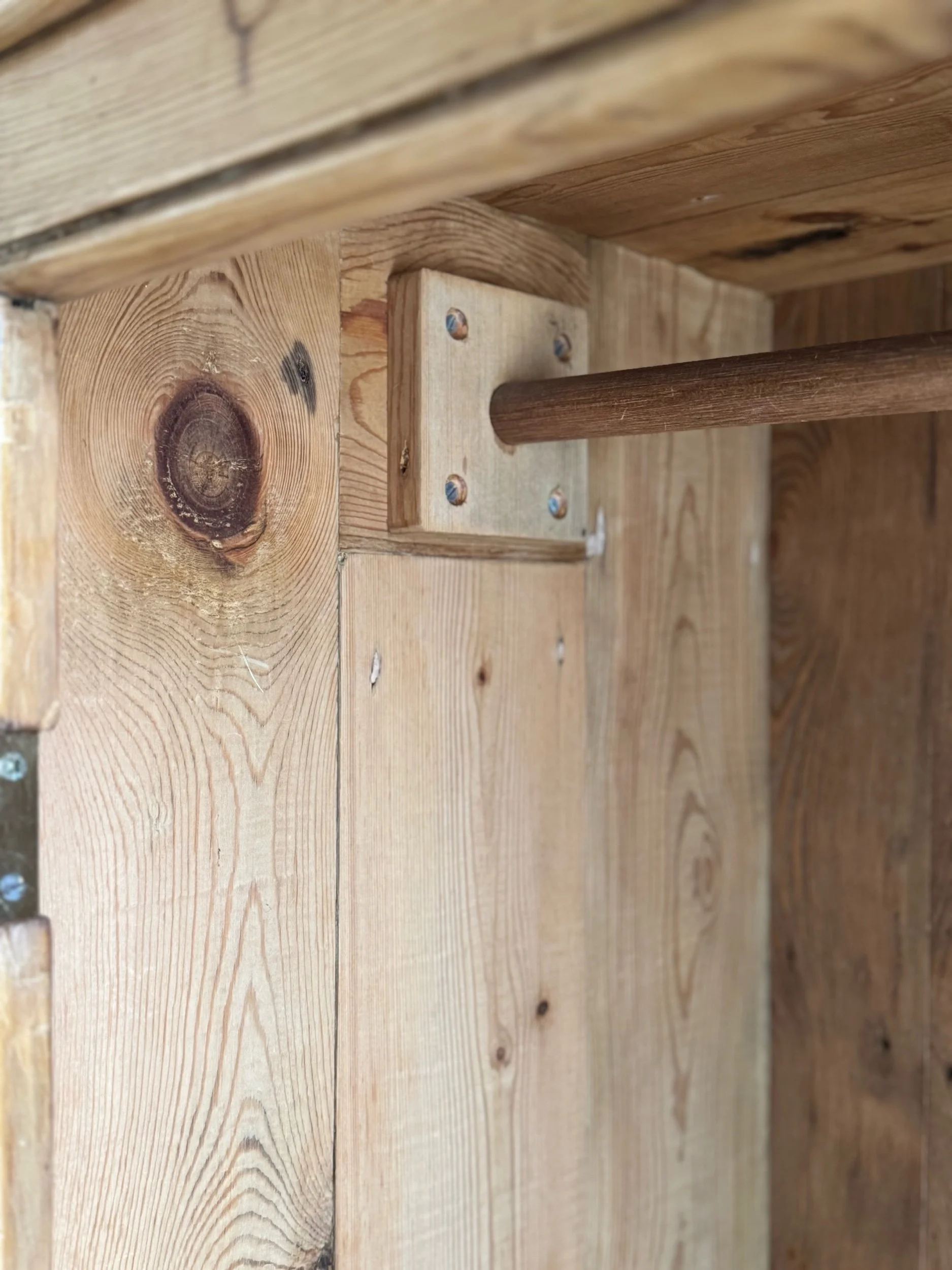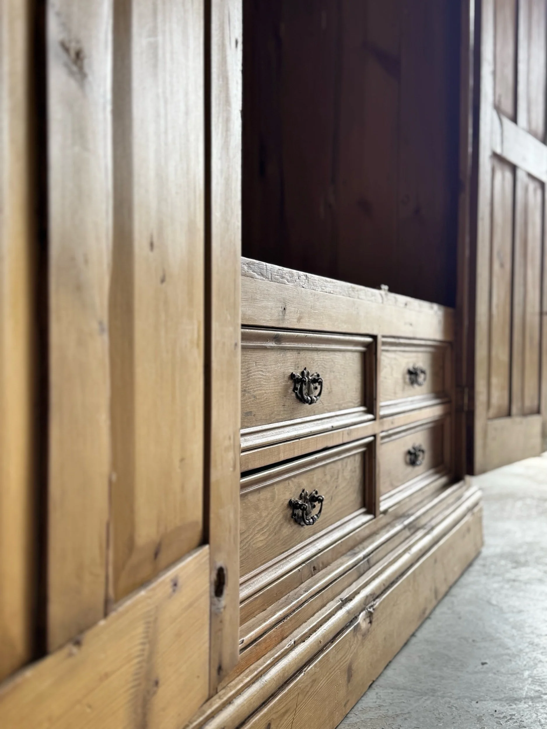 The form is classic and functional, with double paneled doors opening to a generous interior fitted with a hanging rail and a bank of four drawers below. We think it’d work great in an entryway or hallway to store both clothing and linens. The restrained design allows the character of the timber to take center stage, while the molded cornice adds just enough architectural presence.