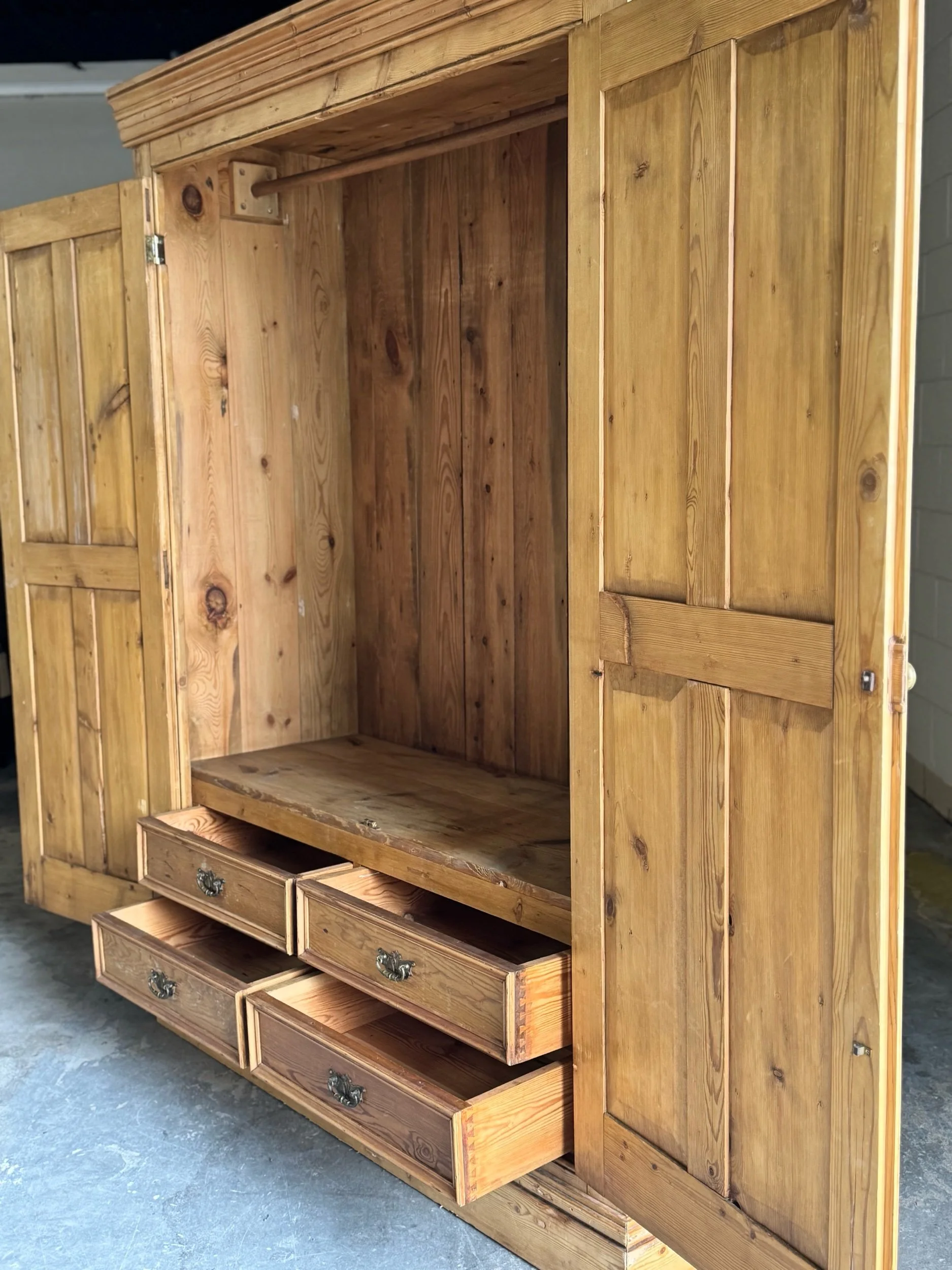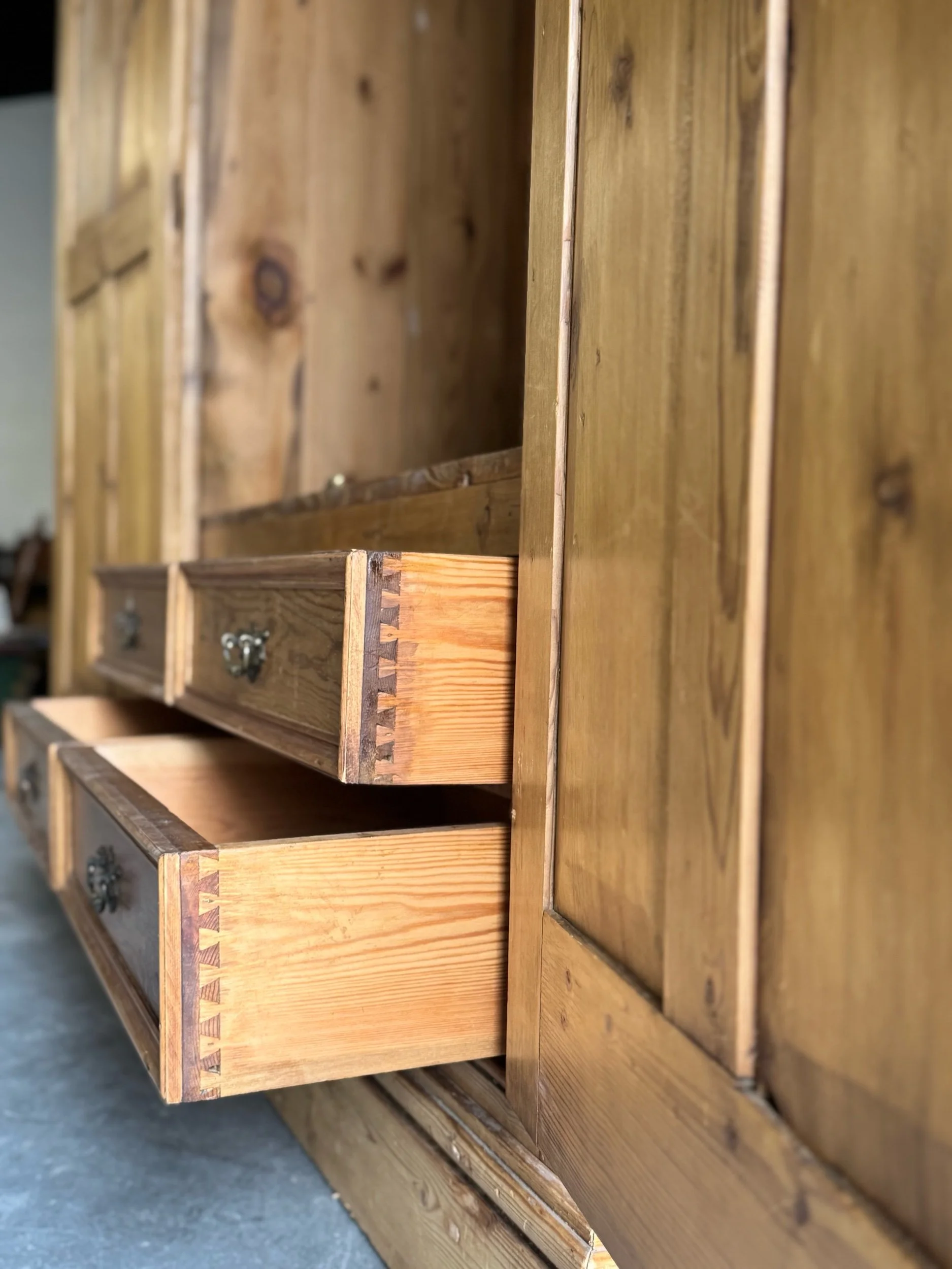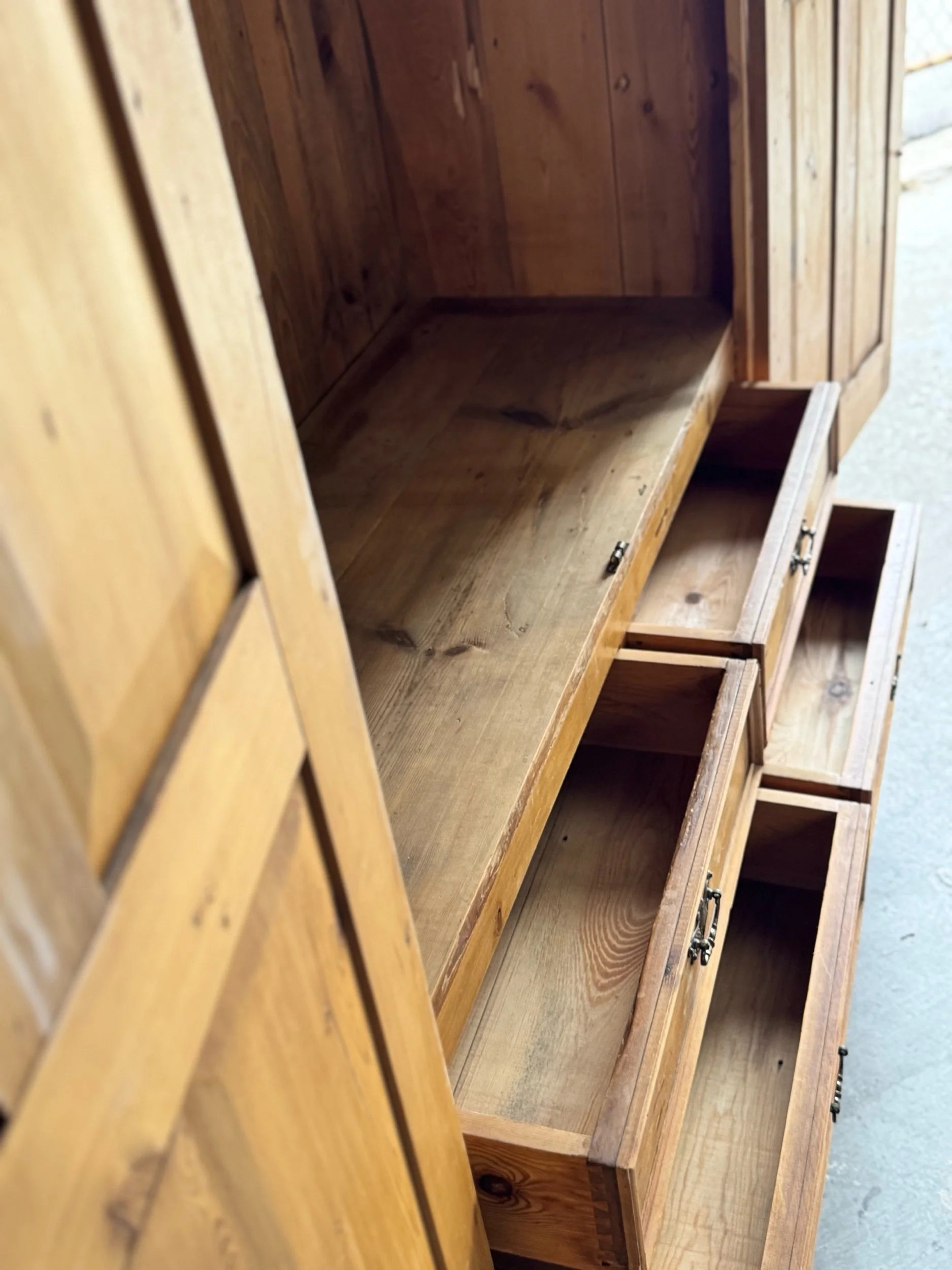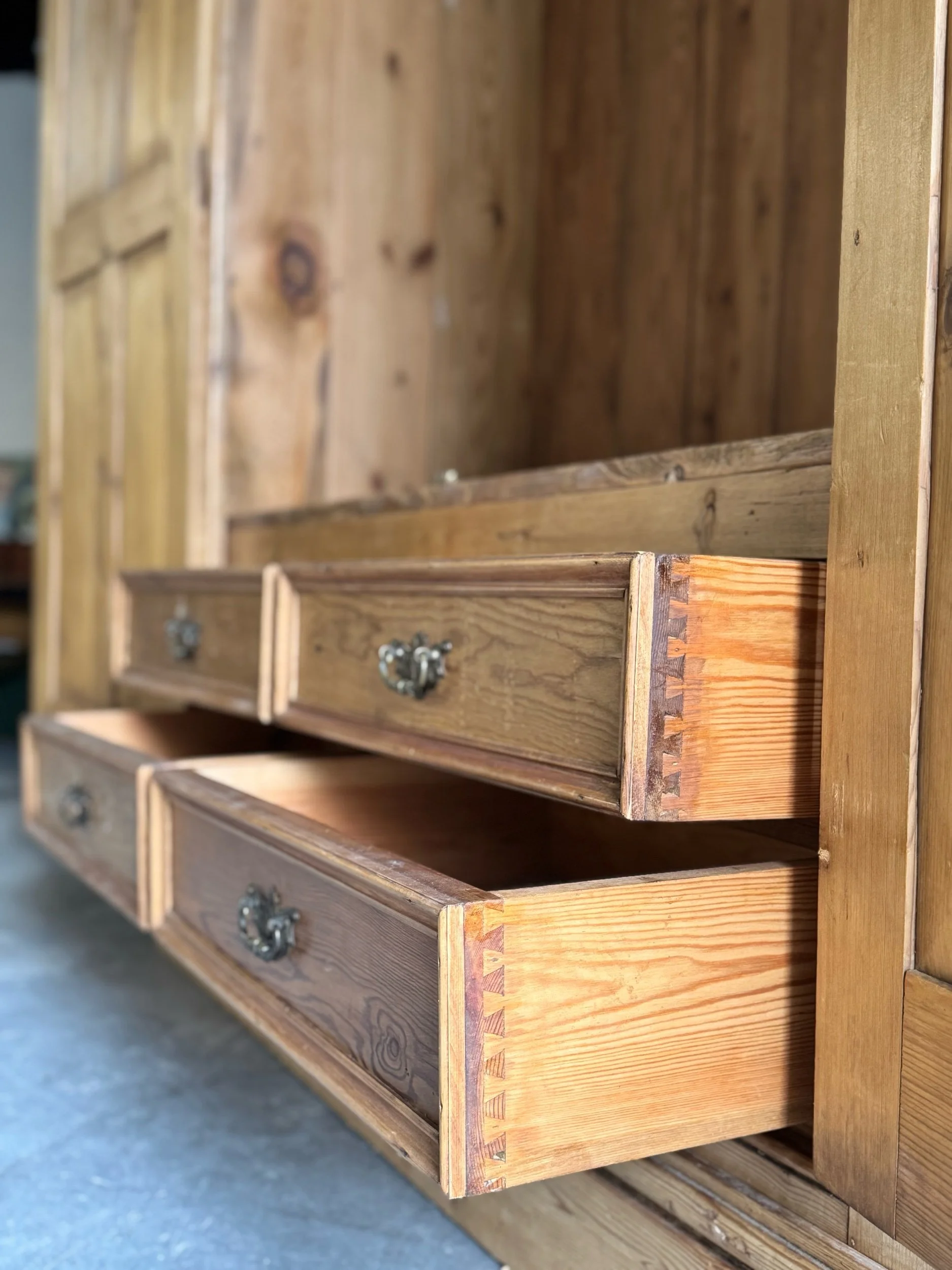Overall very good antique condition consistent with age. Surface wear, minor scuffs, and small marks throughout, all contributing to a rich, authentic patina. Interior shows expected wear from use. Drawers run smoothly. Structurally sound and solid. Later interior hanging rail present. No major restorations noted.