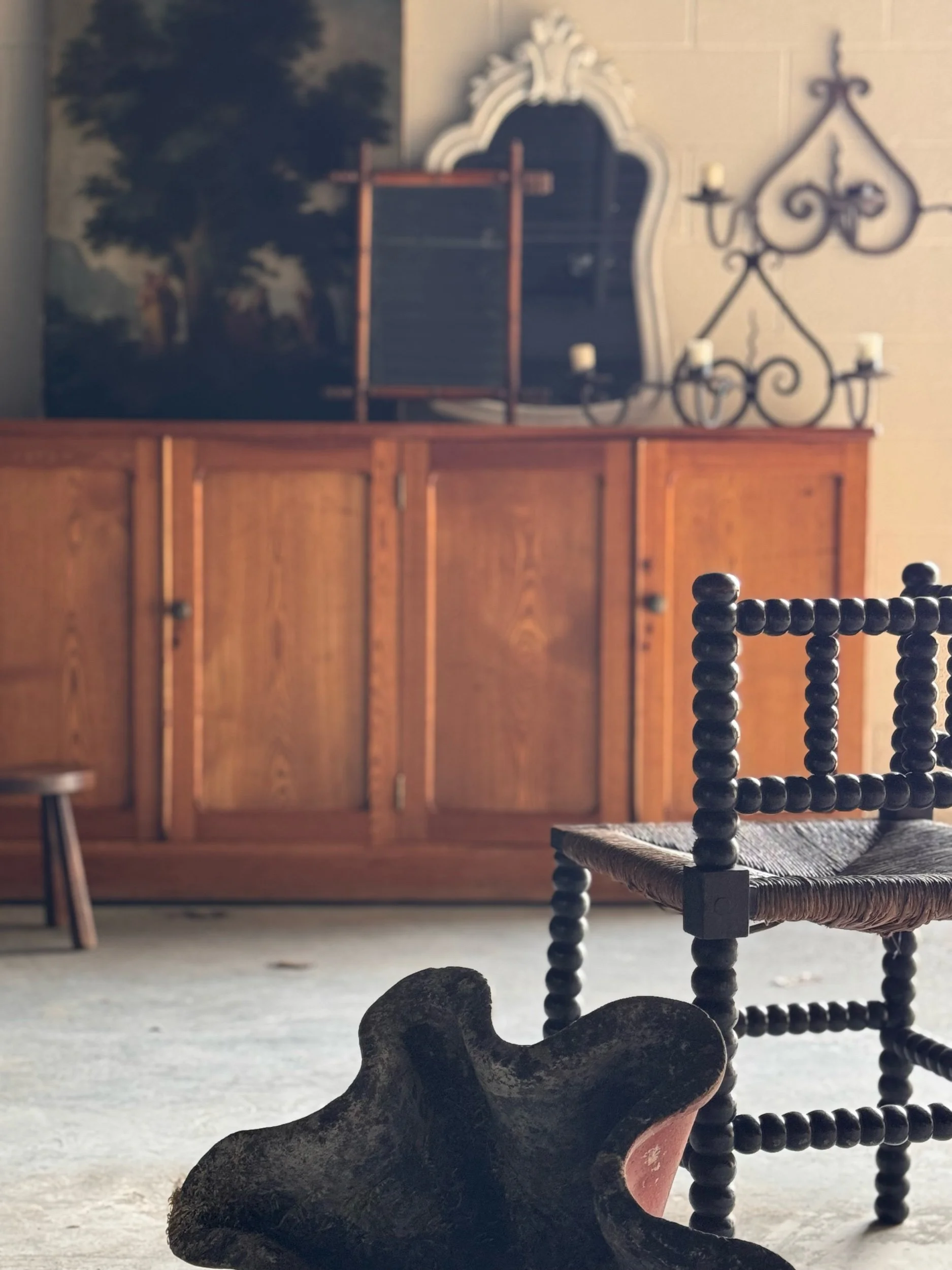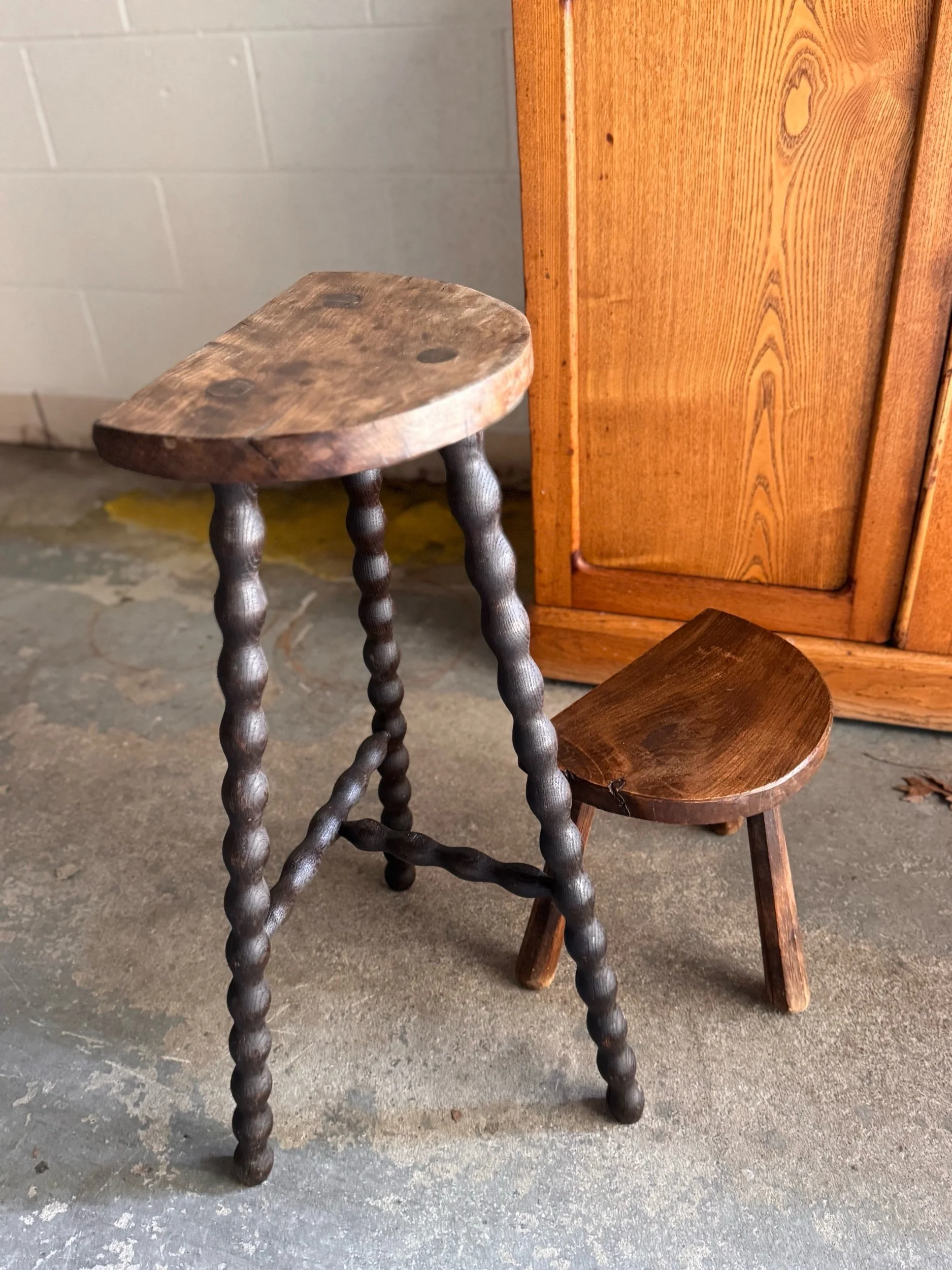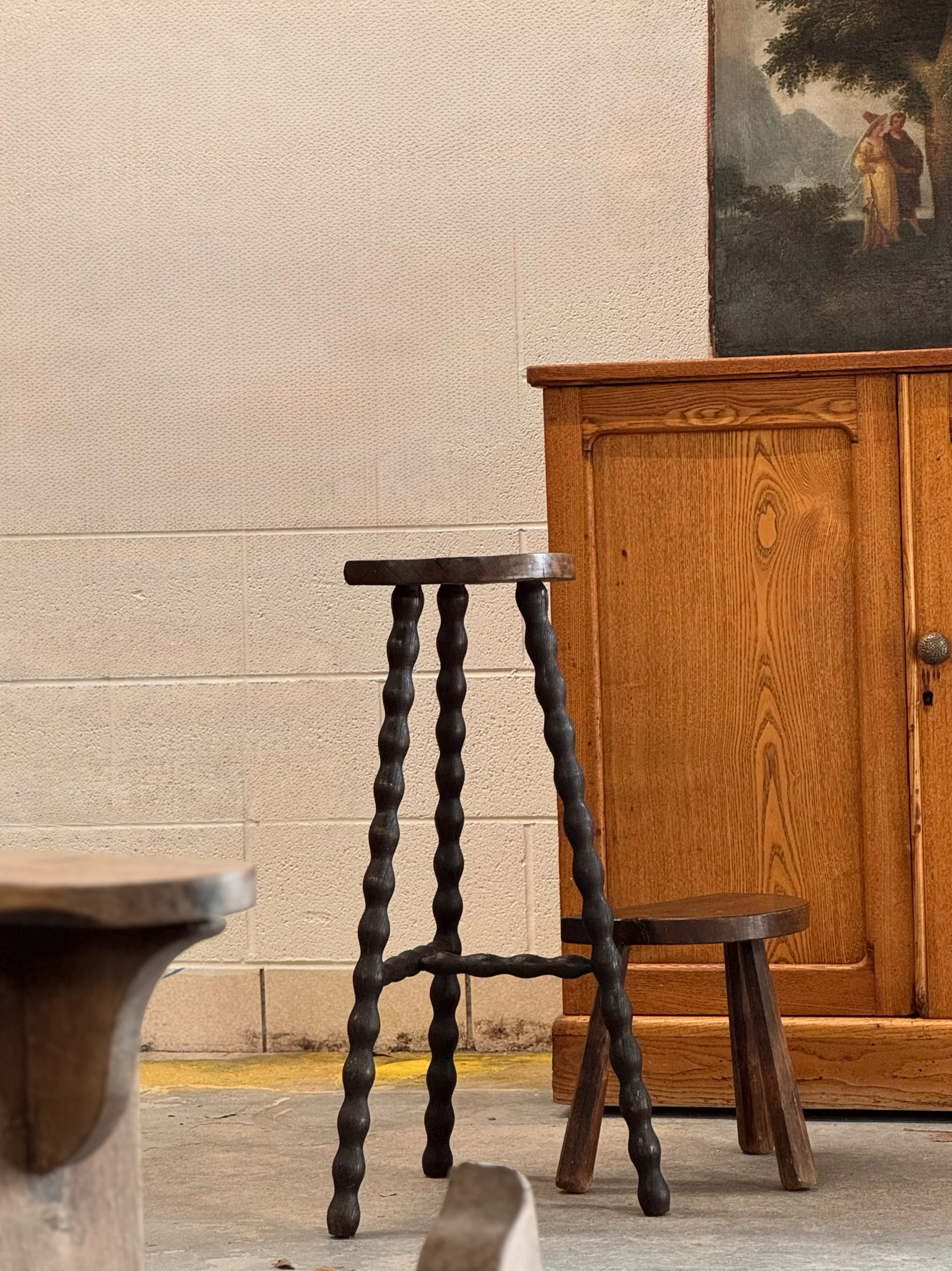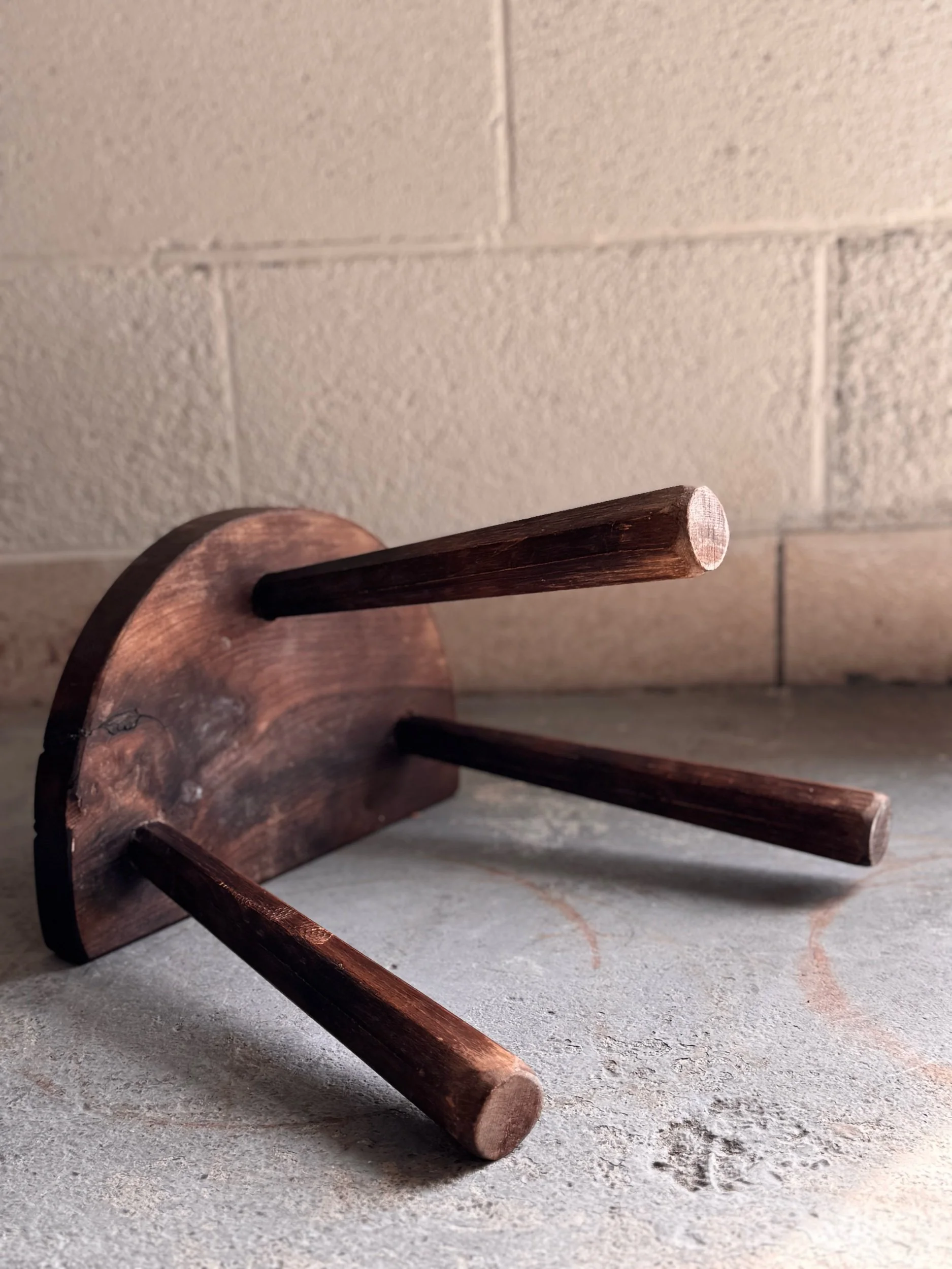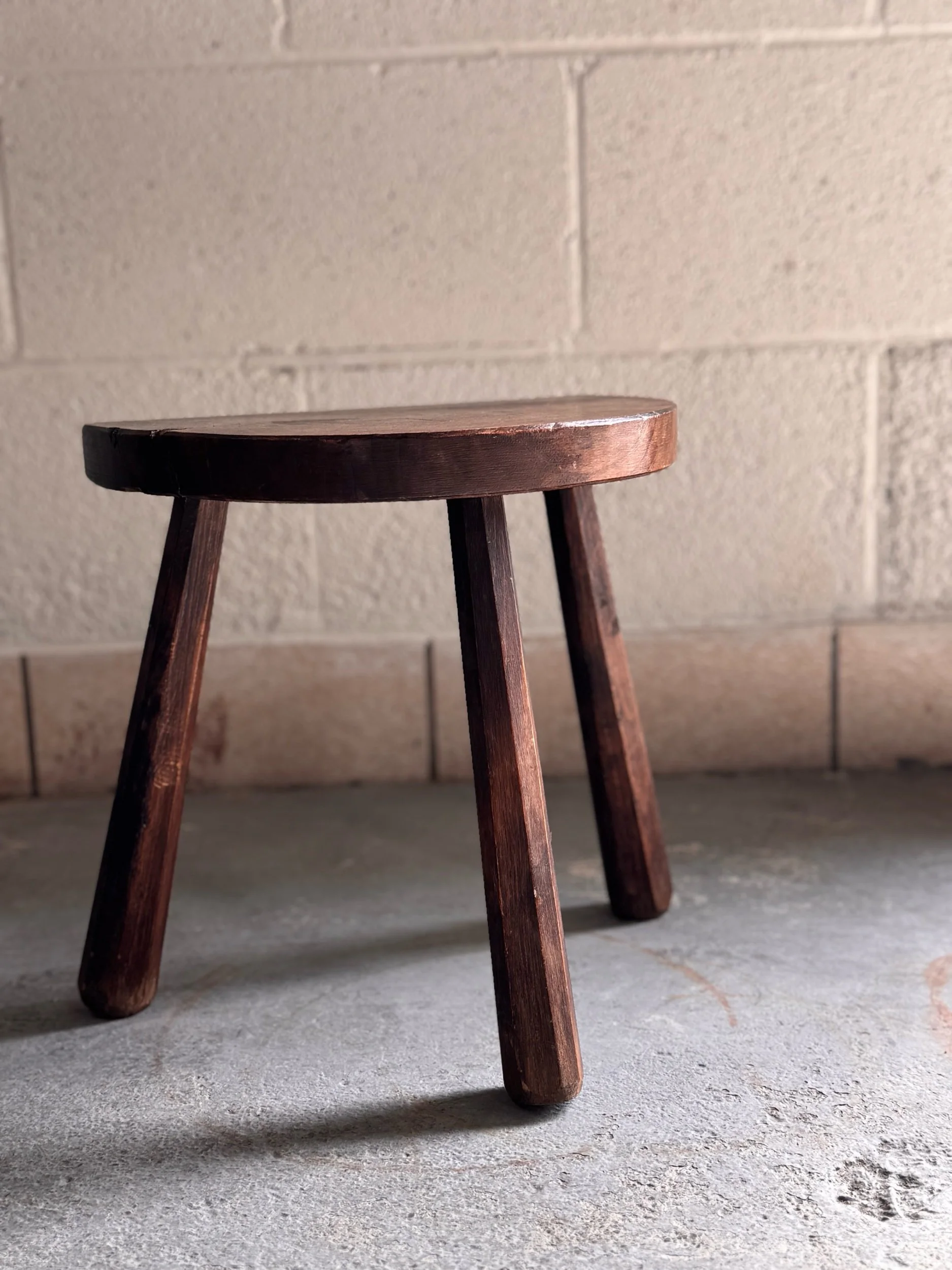 French rustic milking stool featuring a sculptural demi-lune seat and splayed legs, beautifully worn from generations of use. Pieces like this were once a staple of rural French farm life. They are humble, utilitarian objects that have since become icons of early vernacular design. The hand-shaped seat and softened edges speak to years of daily handling, giving it a quiet, honest character that’s hard to replicate. France, circa 1900.