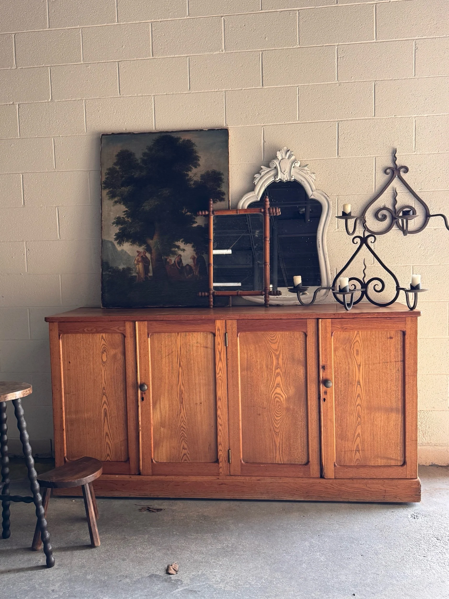 Wear consistent with age and use, including surface wear, patina, and minor irregularities to the wood. Visible old repair to the seat edge. Structurally sound and stable with a strong, usable presence.