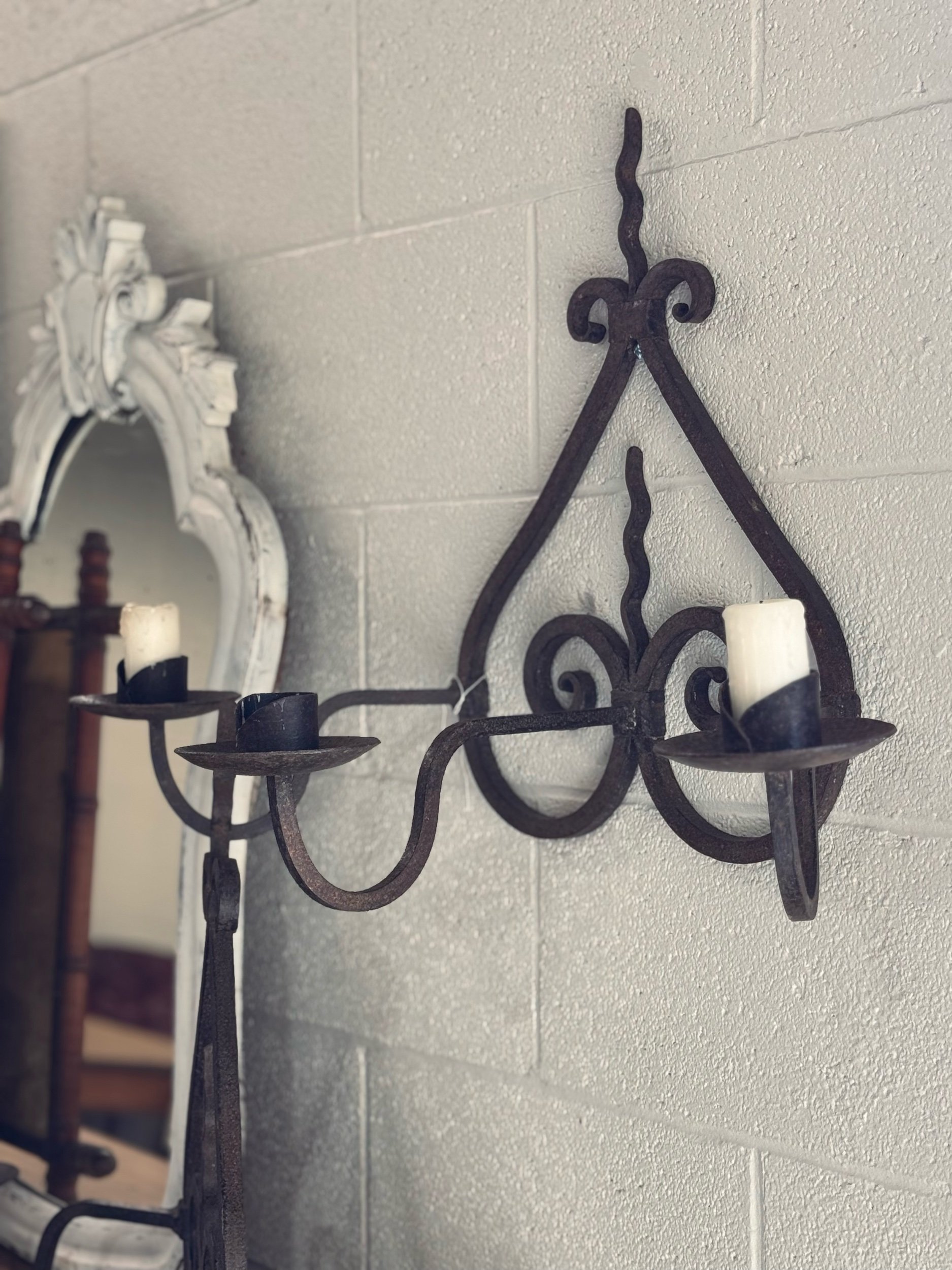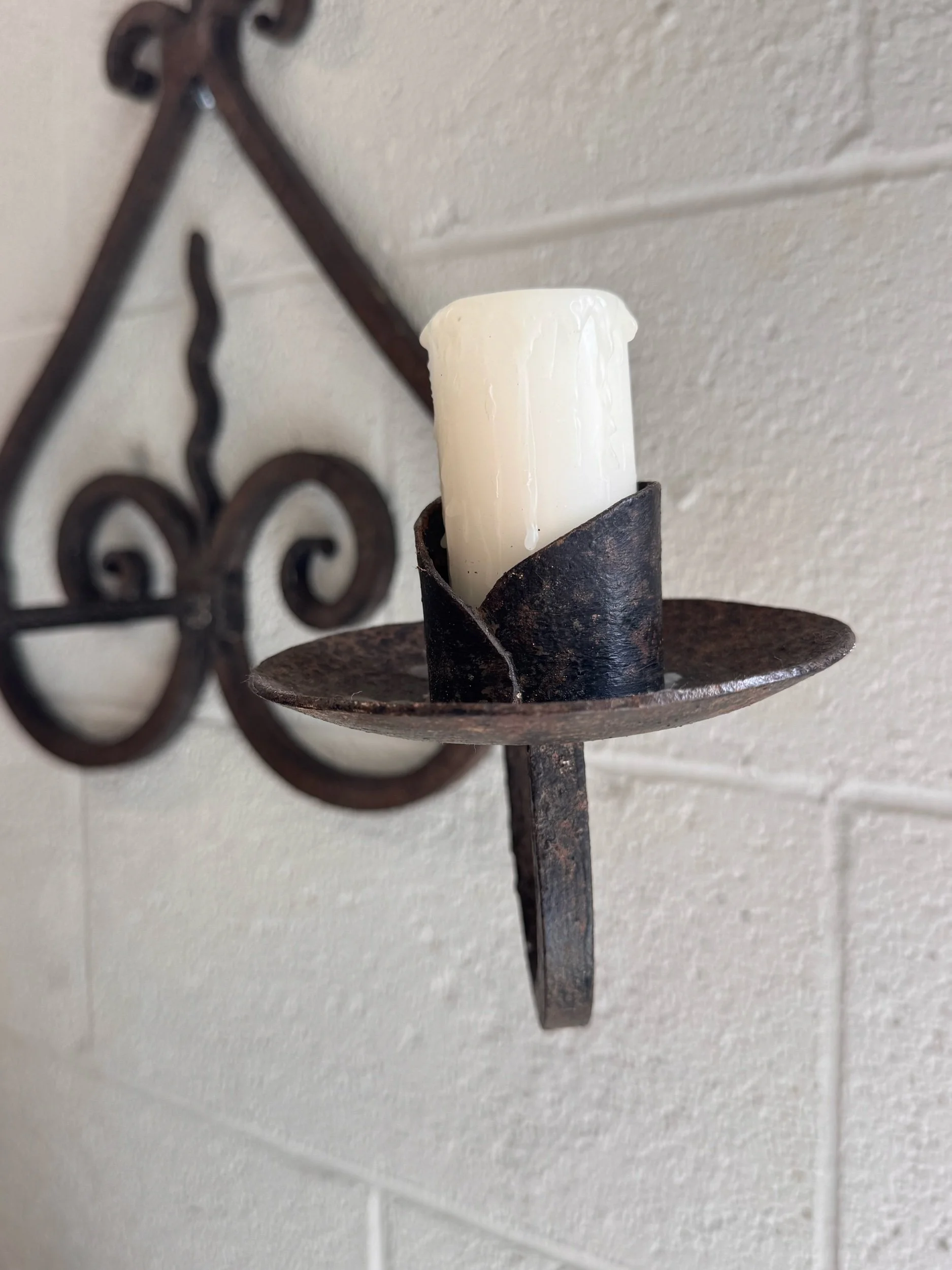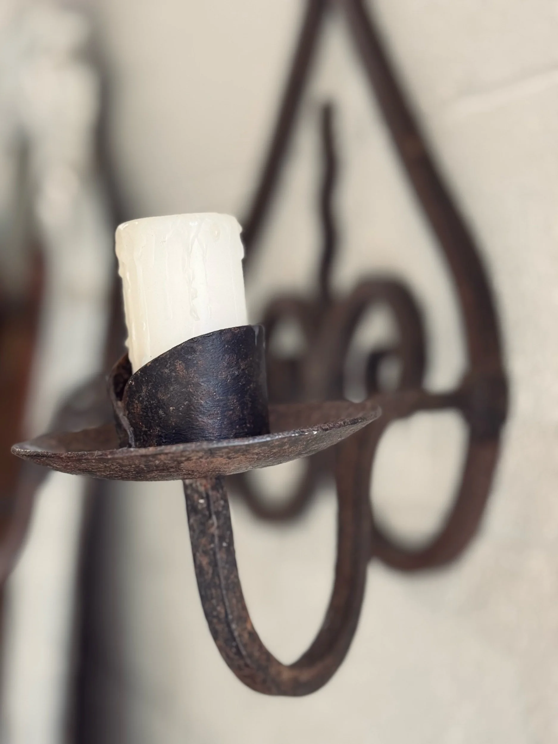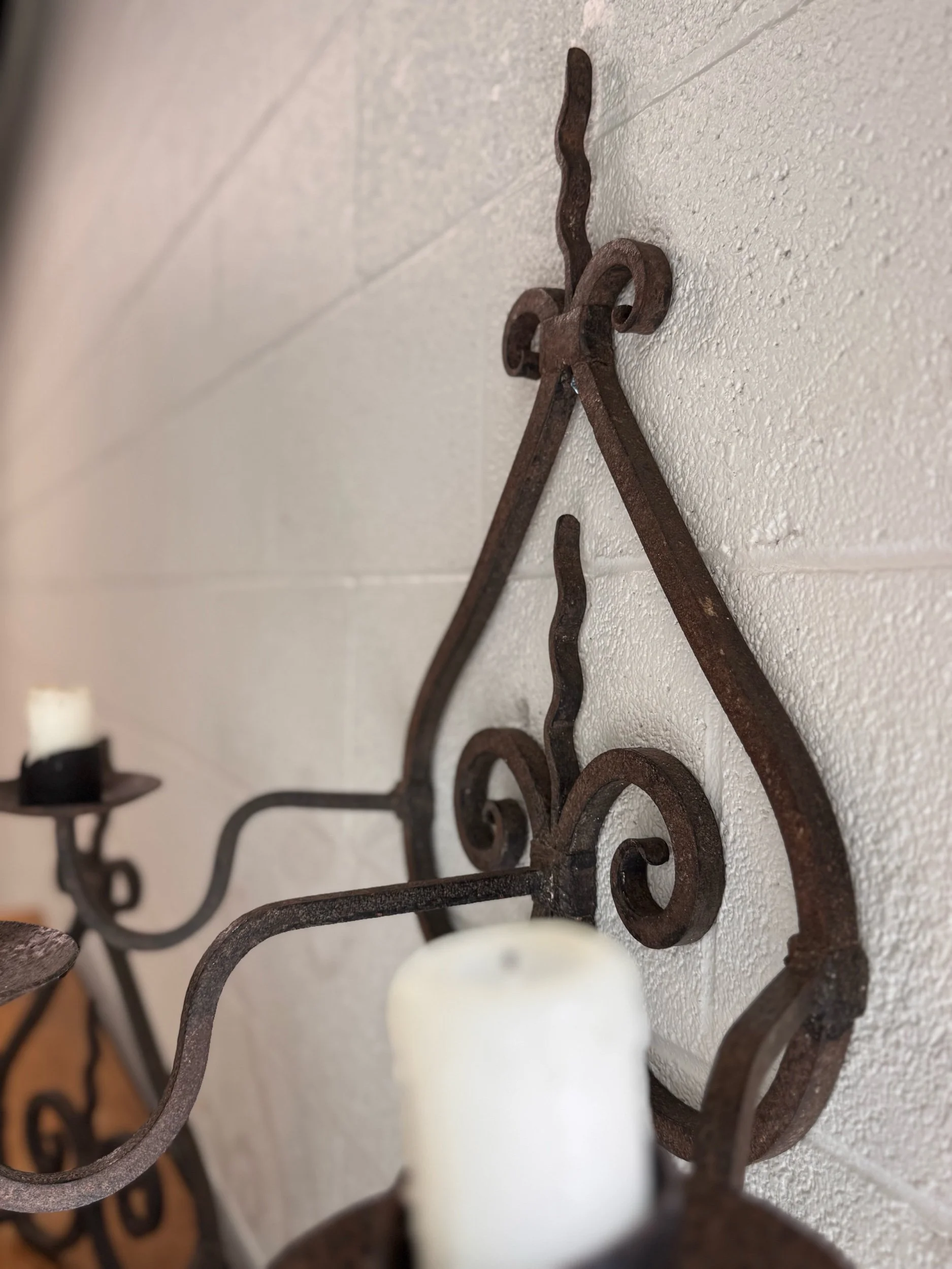 Pair, Blacksmith Made Vintage French Iron Wall Hanging Candelabras | Circa 1950