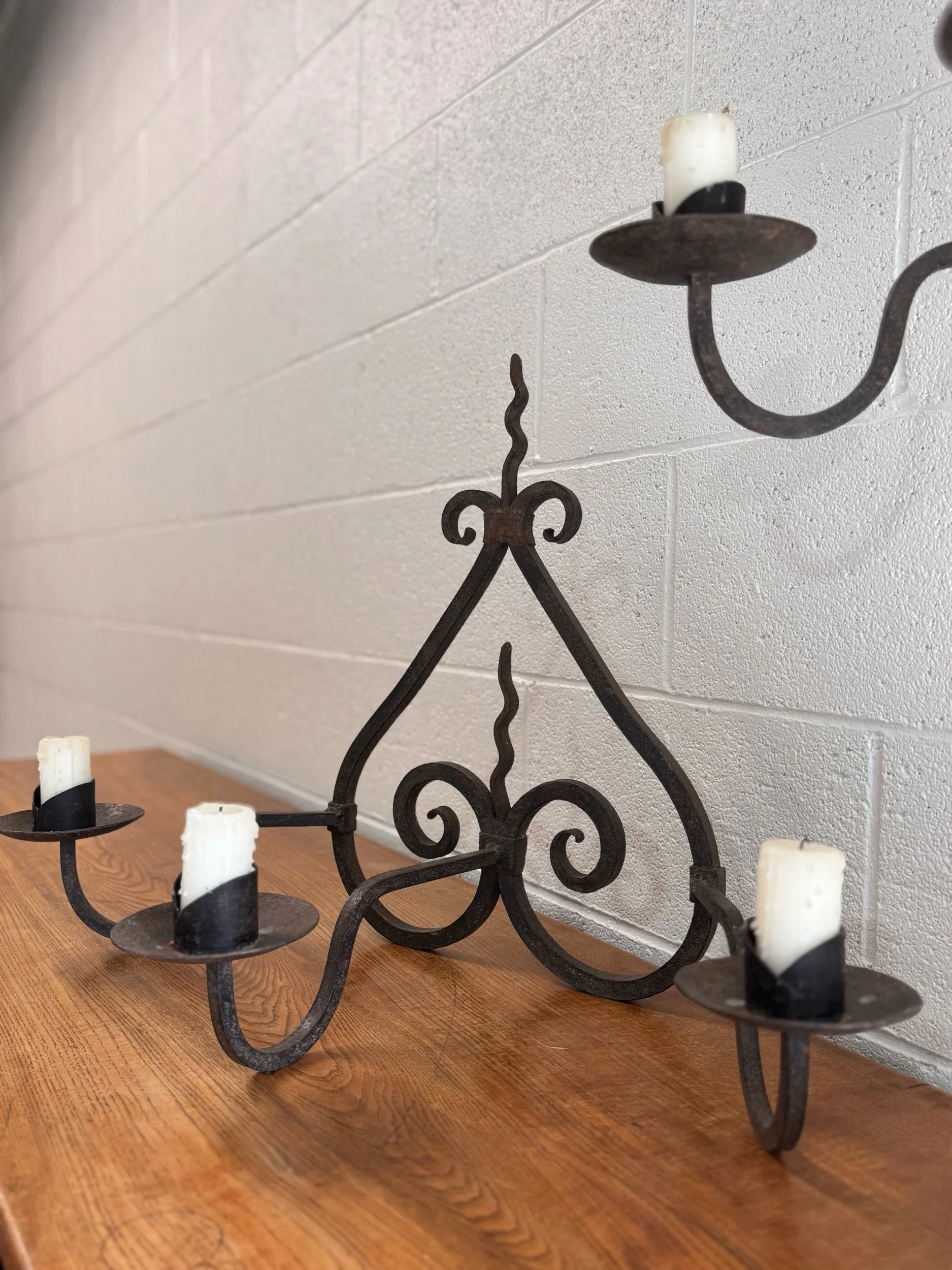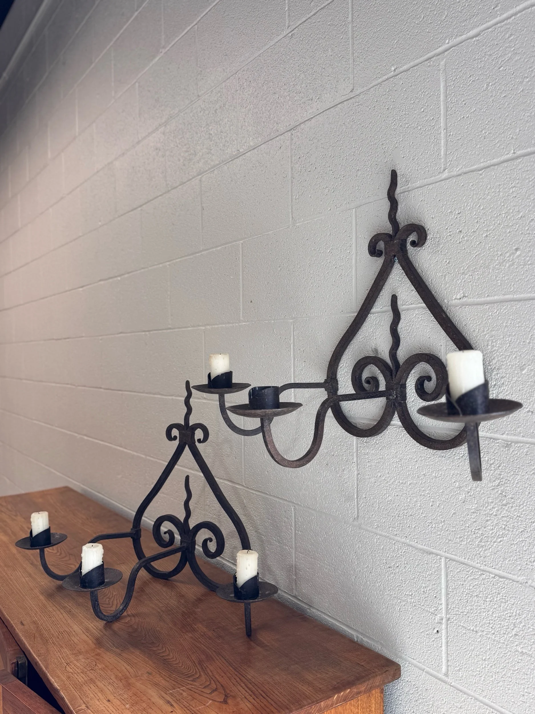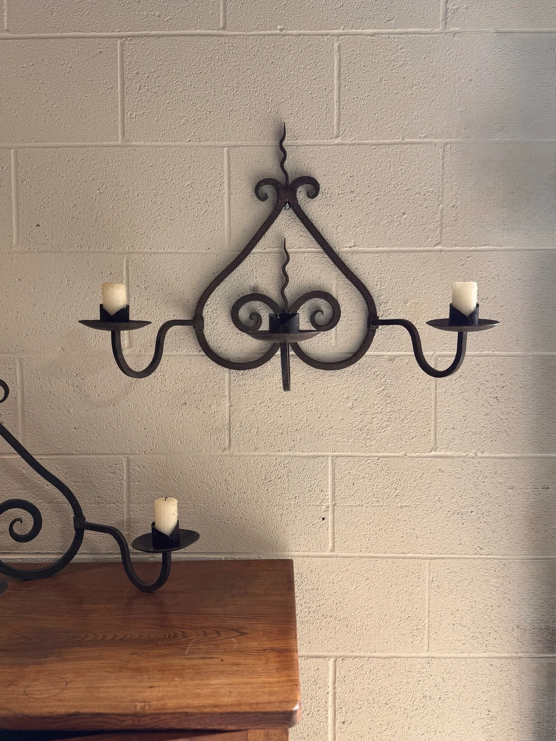 A striking pair of mid-century French wall-mounted candelabras, hand-forged in iron with elegant scrollwork and a sculptural silhouette. Each features three candle arms and a central spike, with a rich, aged patina that highlights their craftsmanship. A bold decorative statement inside, or in the garden.