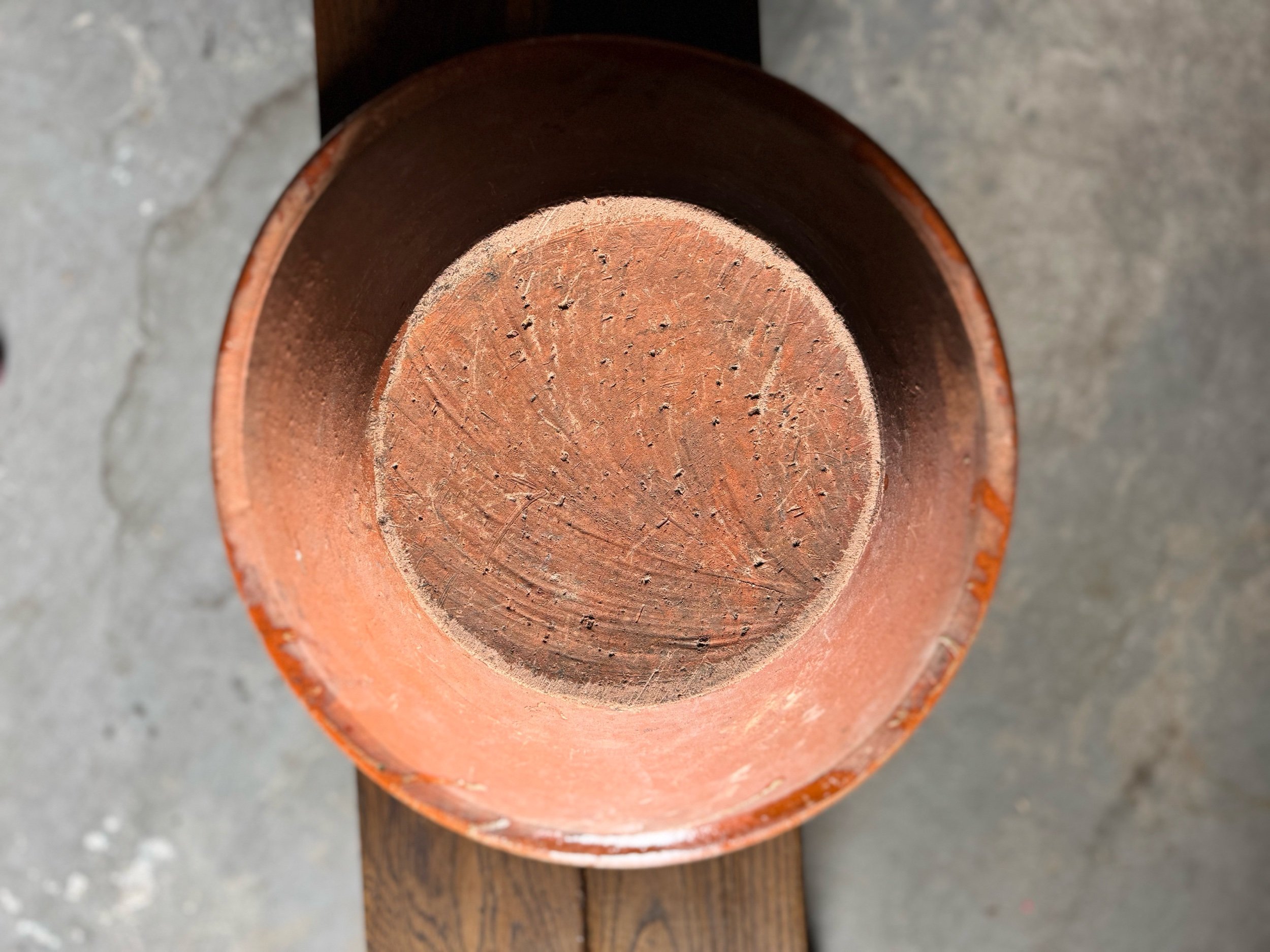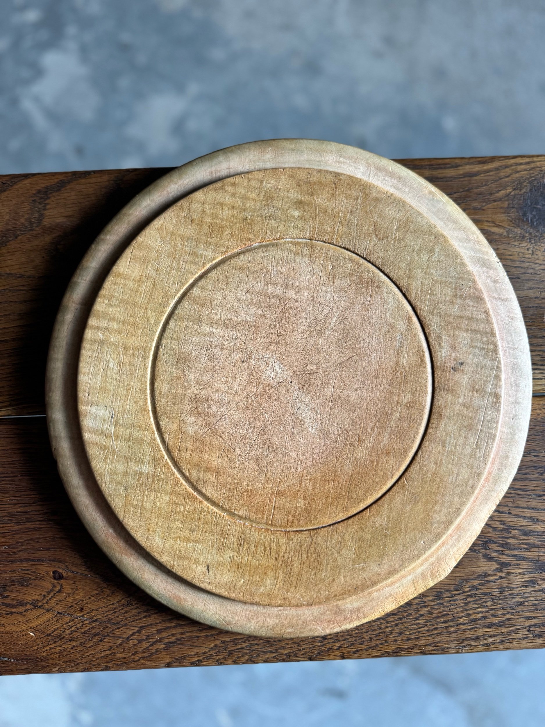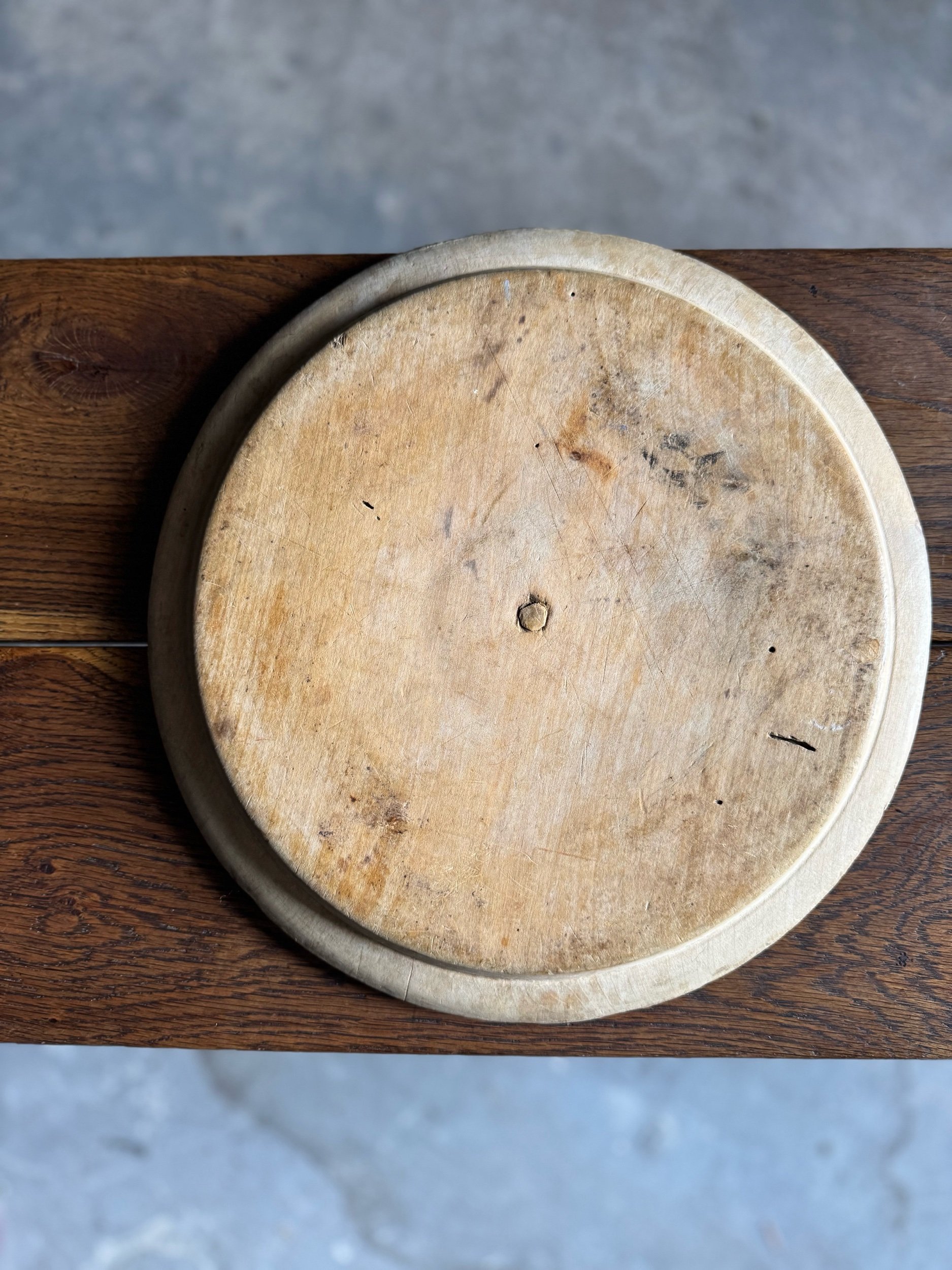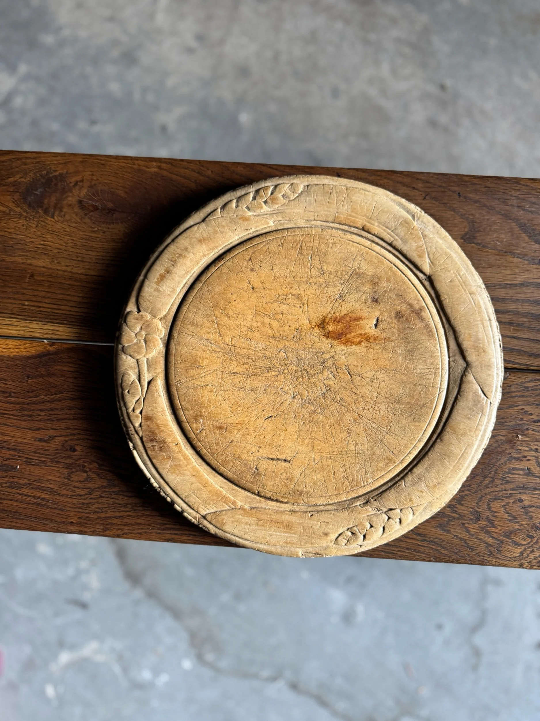 Good antique condition with visible surface wear consistent with age and use. Knife marks, light scratching, and areas of tonal variation throughout. Some minor nicks and softening to the carved edge. No structural issues; sturdy and sound. A beautifully aged surface with rich patina that reflects its working life.