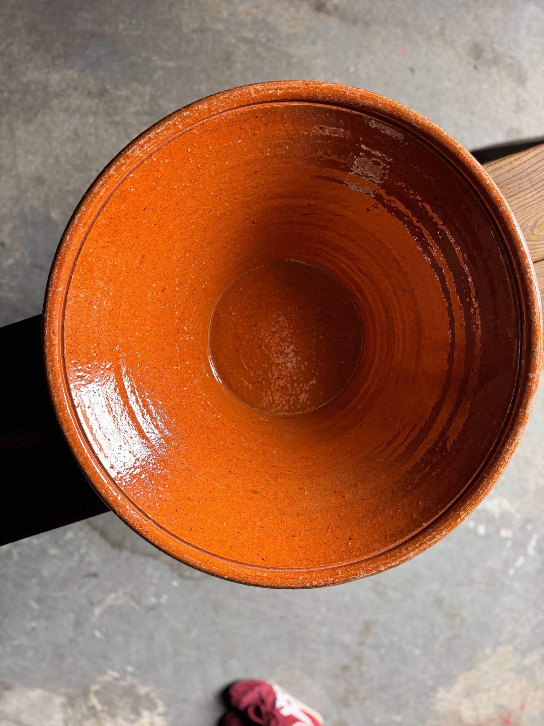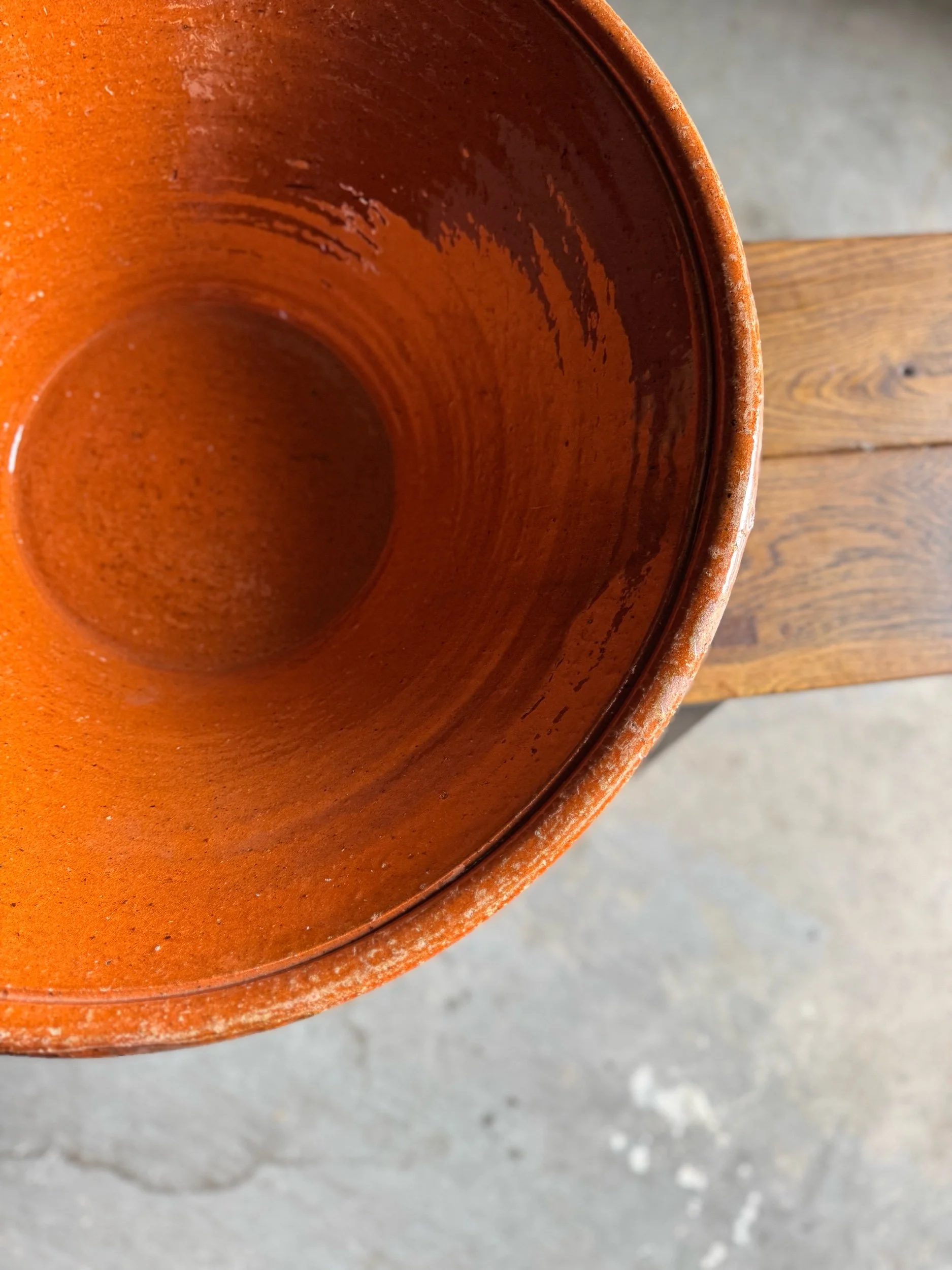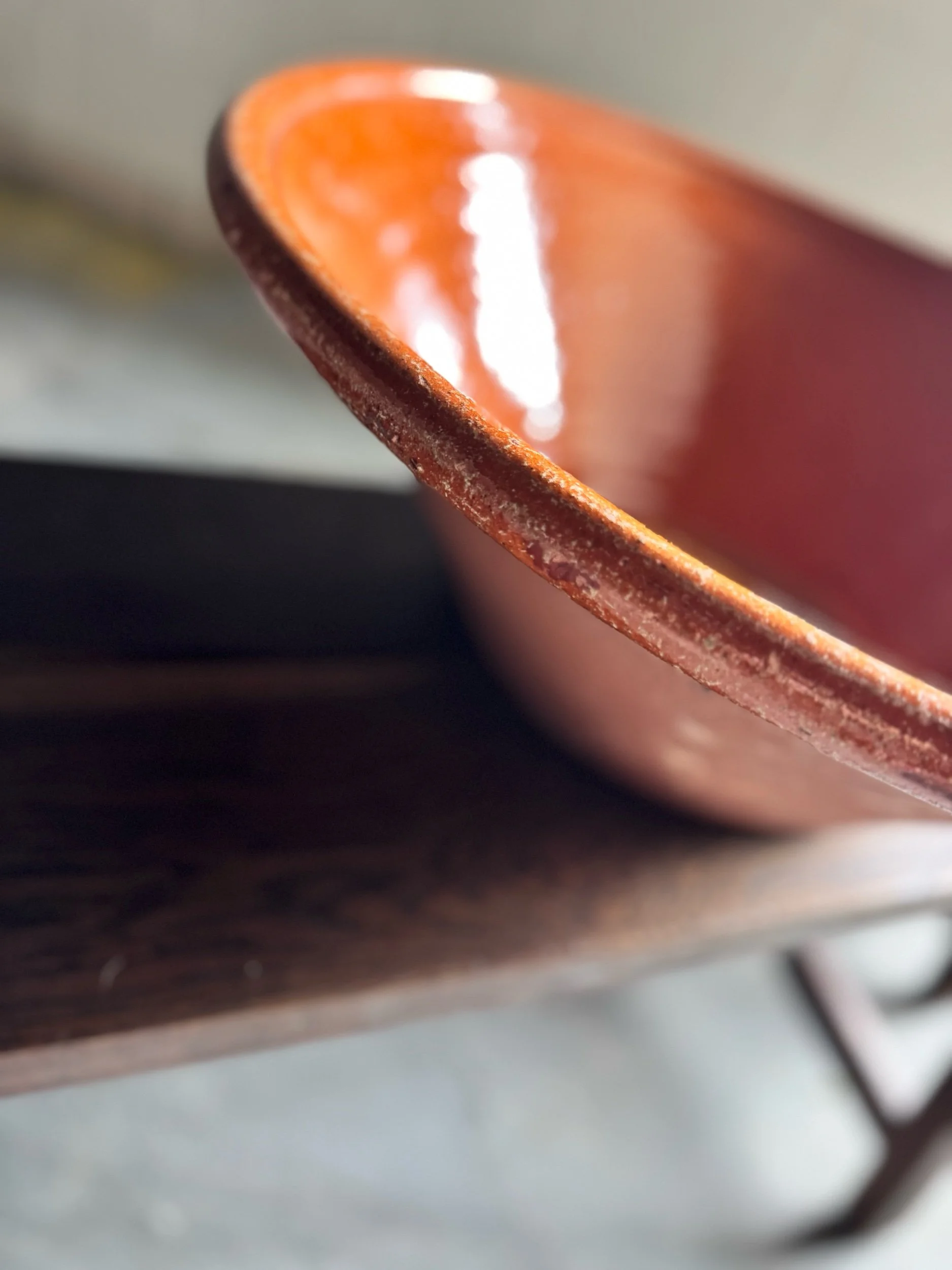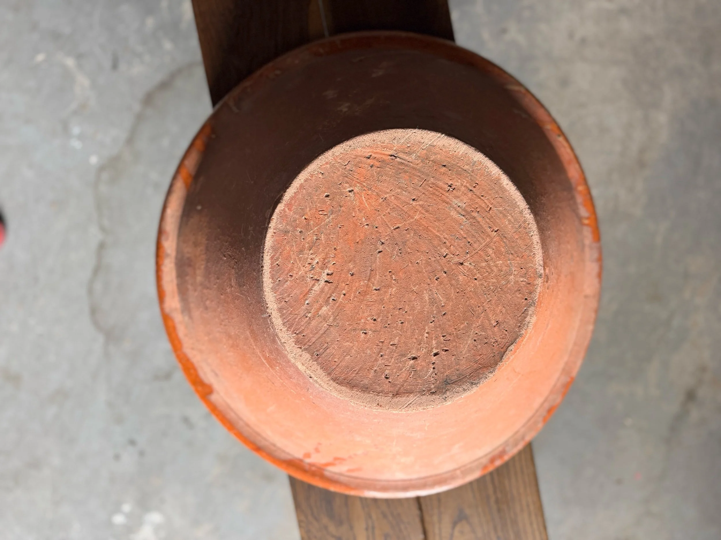Good antique condition with visible surface wear consistent with age and use. Knife marks, light scratching, and areas of tonal variation throughout. Some minor nicks and softening to the carved edge. No structural issues; sturdy and sound. A beautifully aged surface with rich patina that reflects its working life.