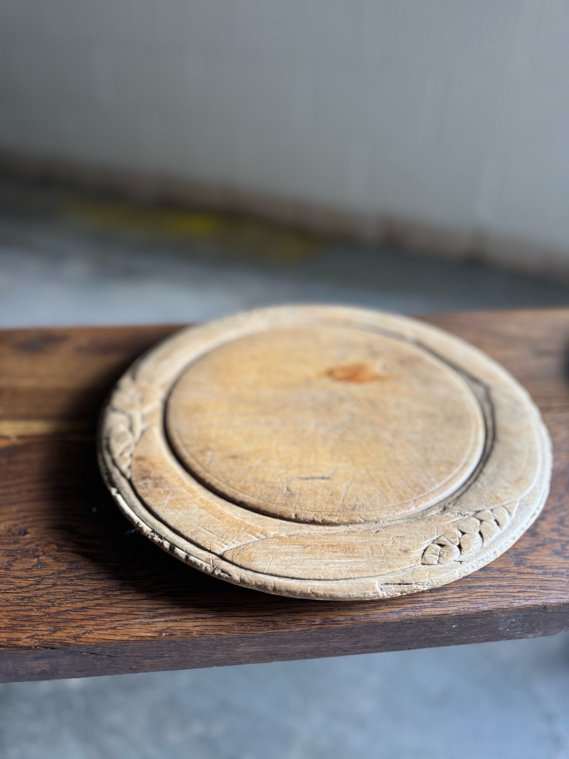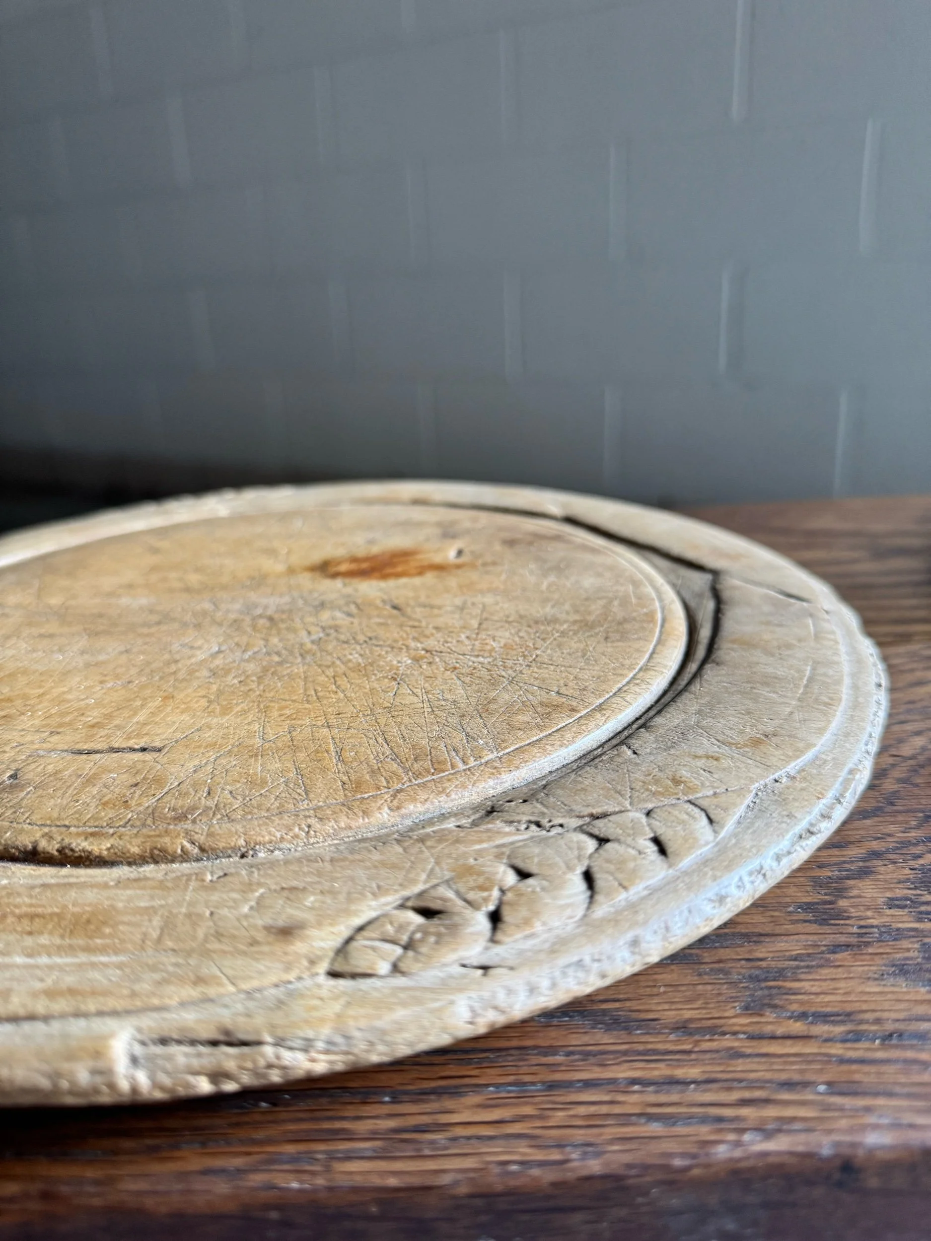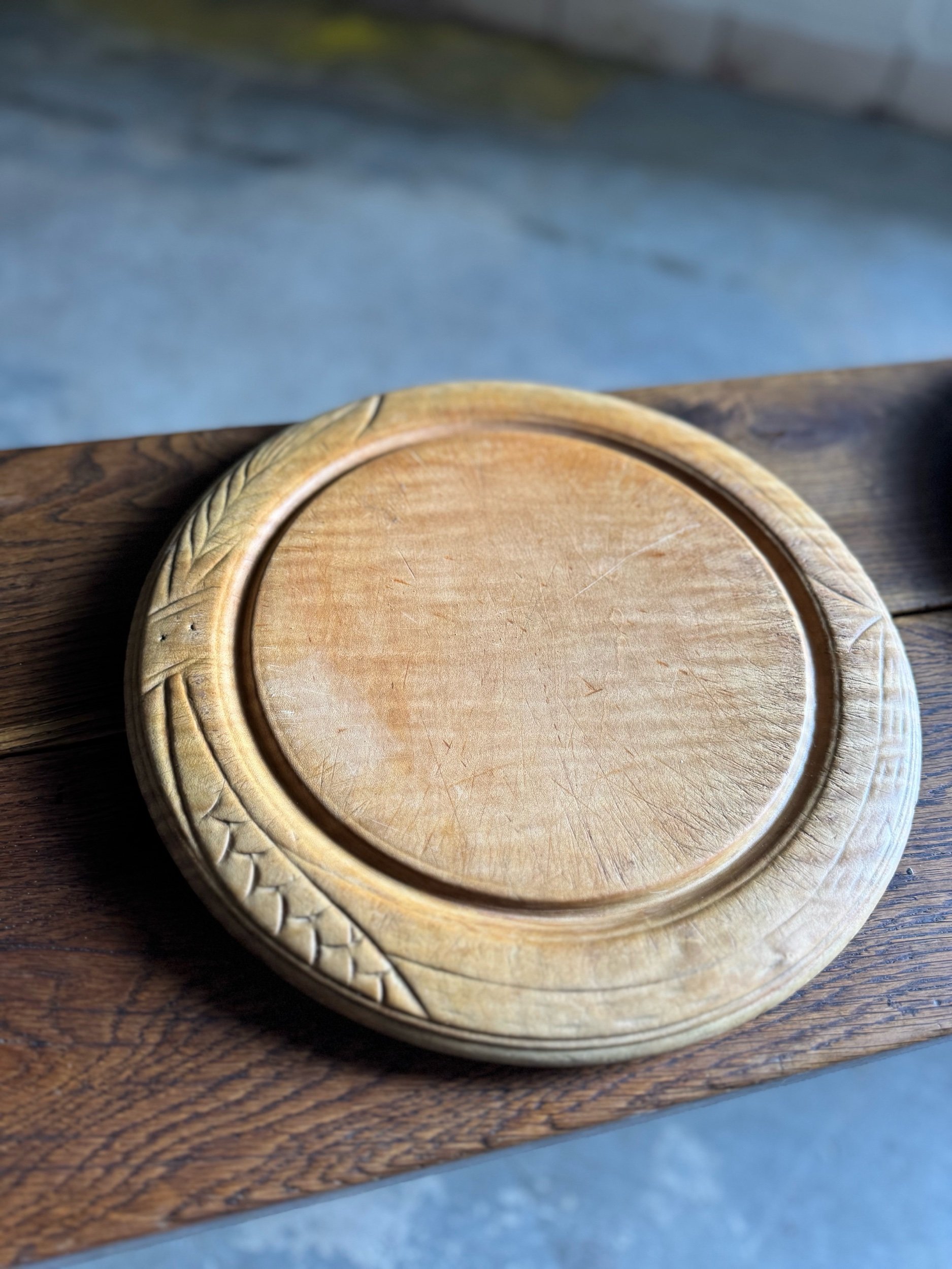 A classic English bread board, carved from pale hardwood and finished with a timeworn surface that speaks to generations of daily use. Traditionally found in British kitchens from the late 19th to early 20th century, these boards were used for slicing and serving bread at the table; often decorated with carved wheat sheaves or the word “BREAD” as a nod to their purpose and to the importance of bread as a household staple.