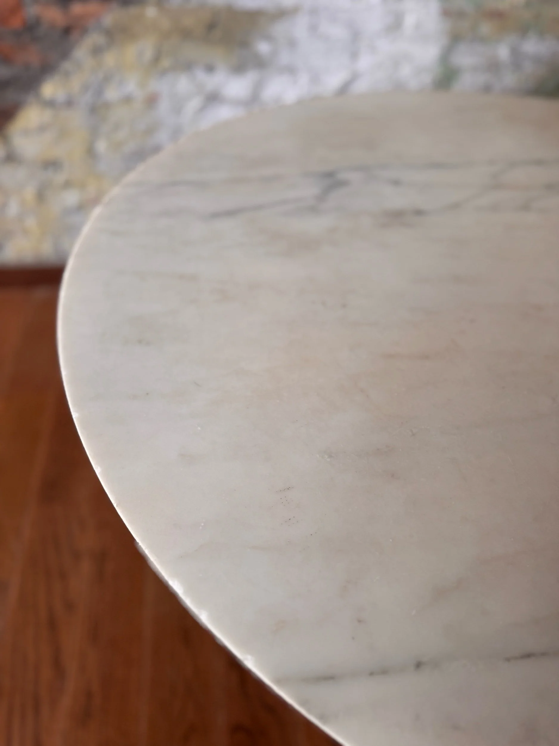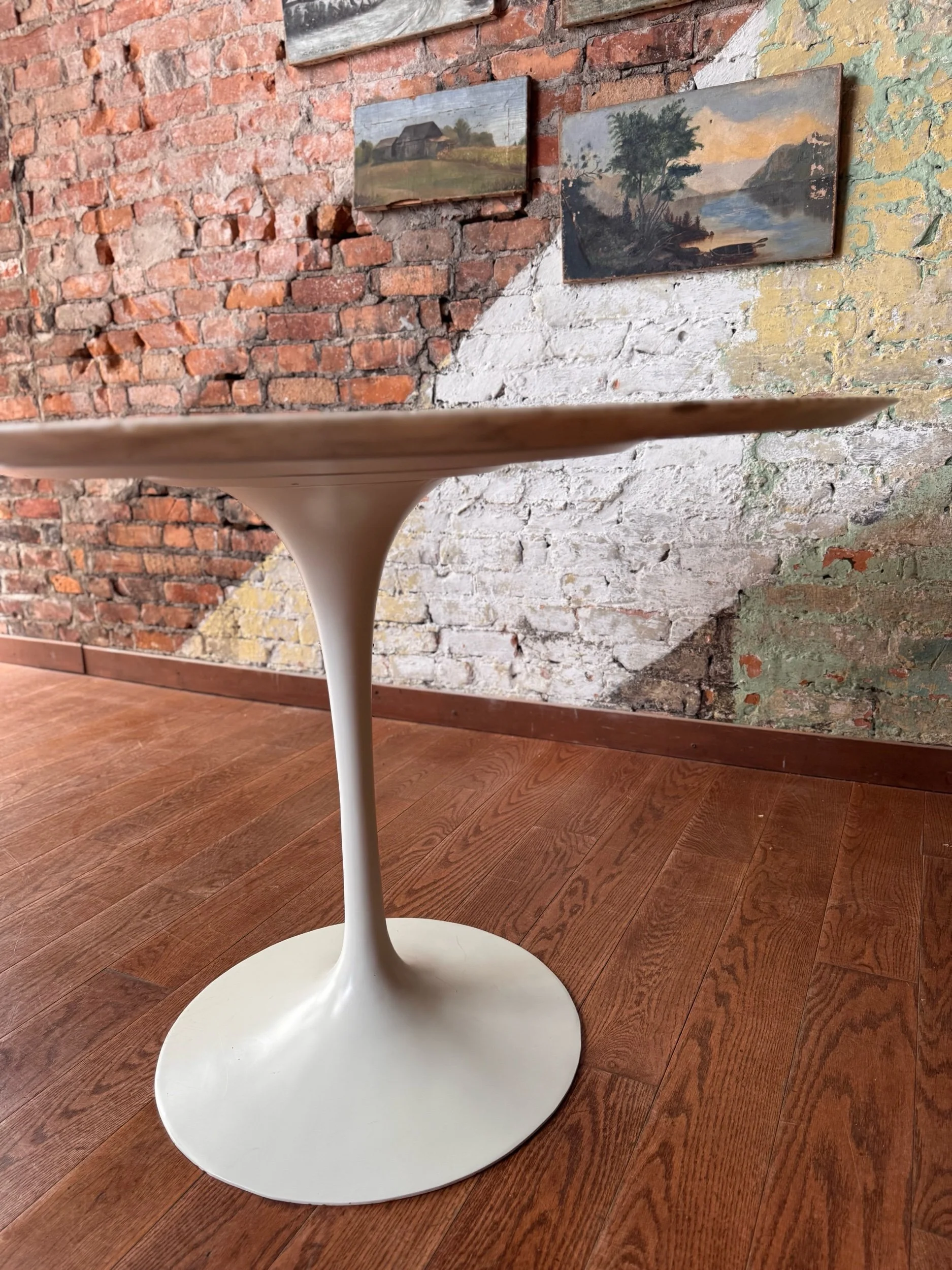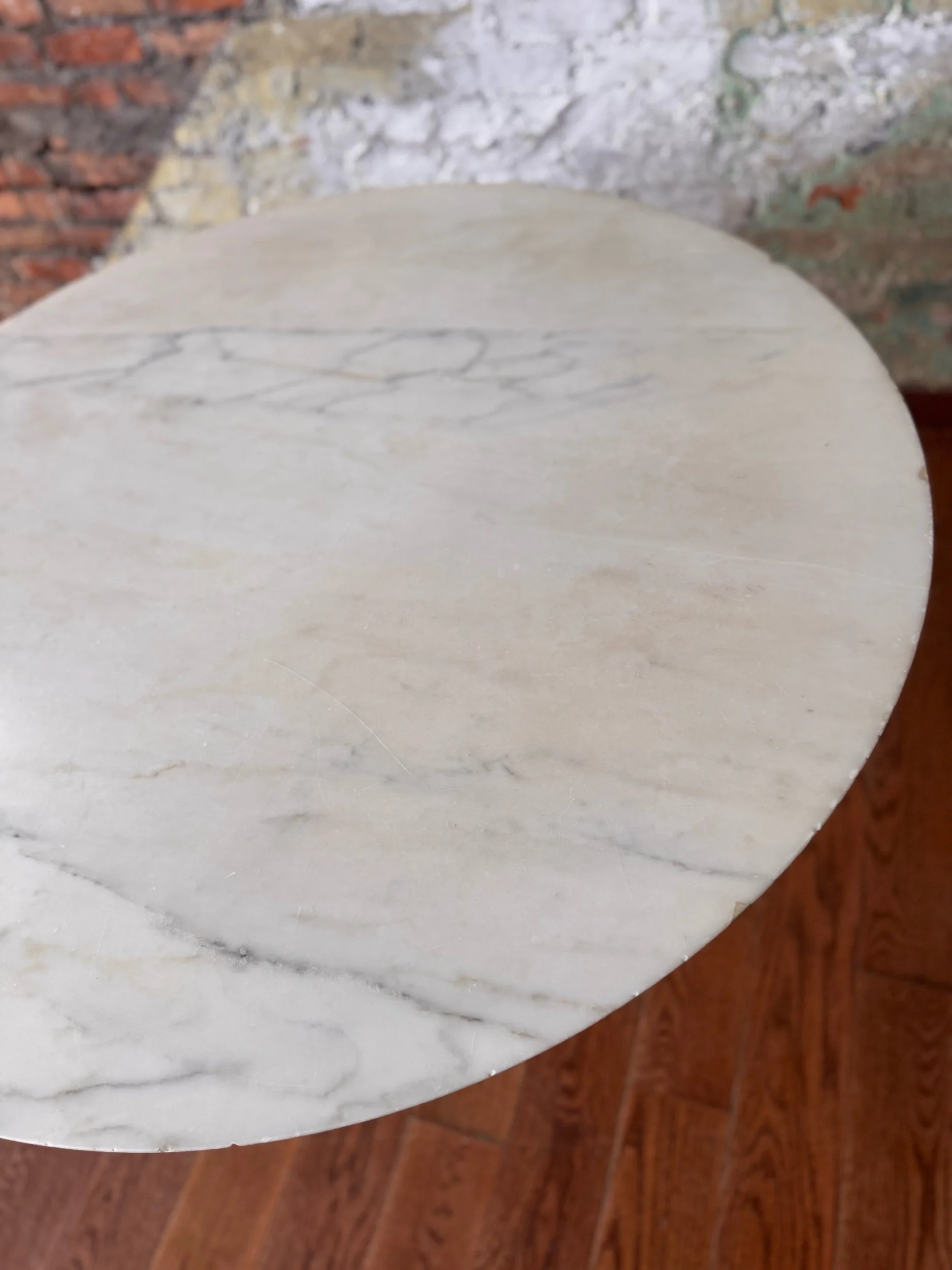Good vintage condition consistent with age and use. The marble top shows several small edge chips and minor surface wear. The pedestal base has scattered scratches and small chips to the finish from normal use over time. These signs of wear are typical for an early example and do not detract from the table’s structural integrity or iconic presence.