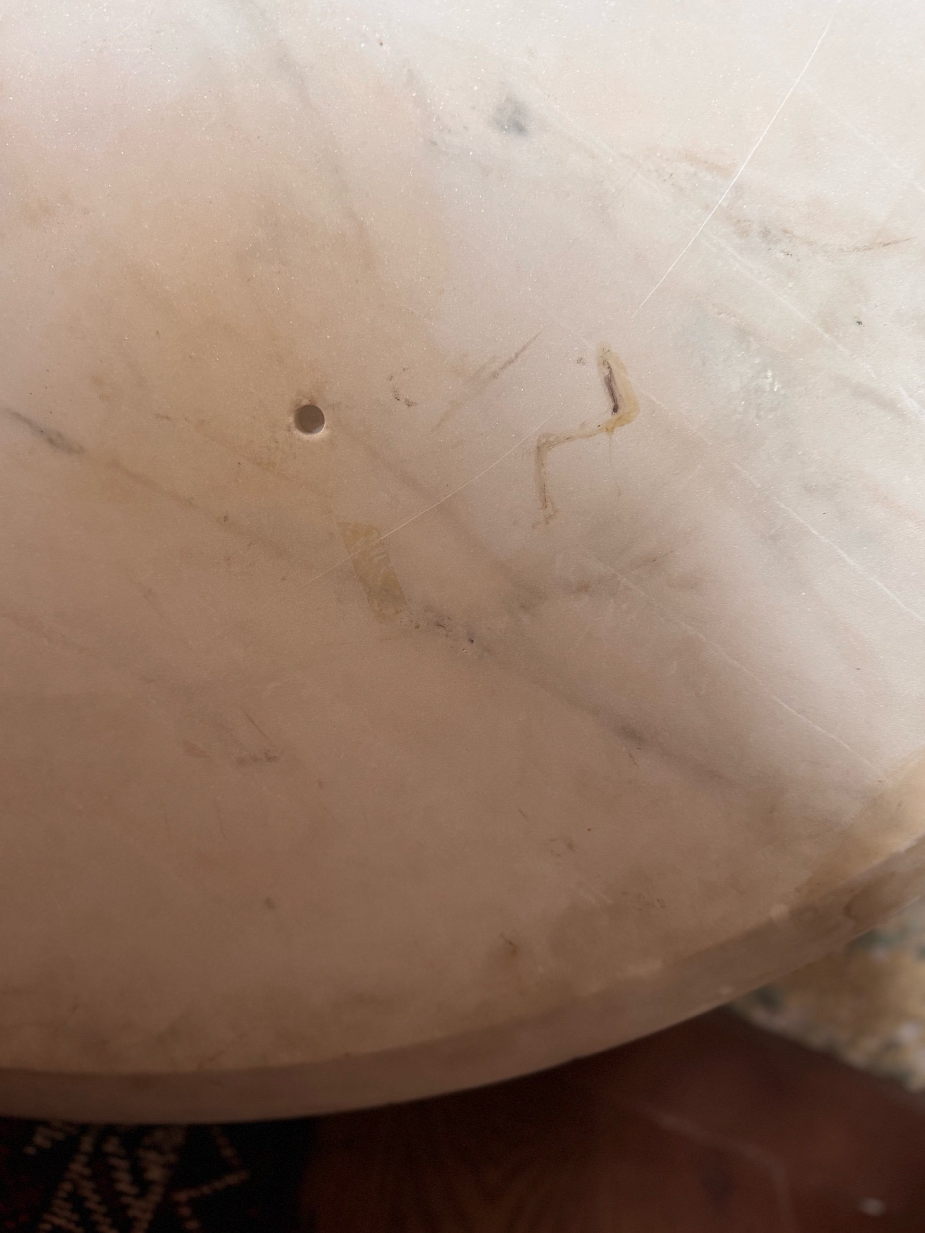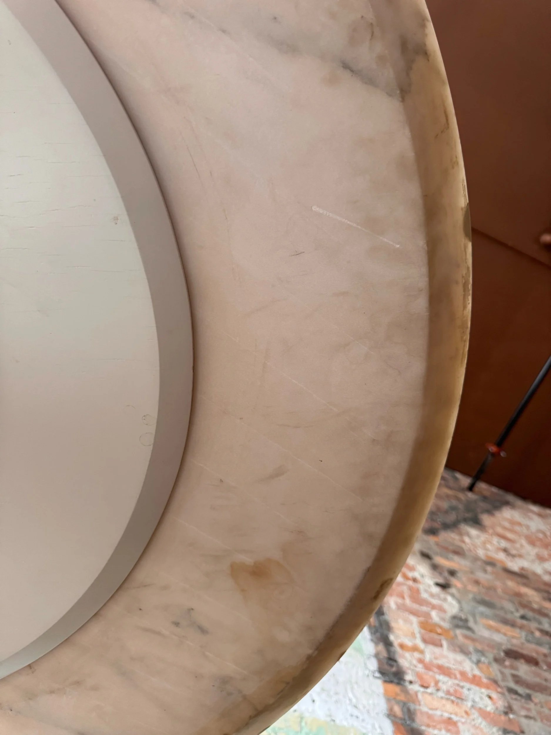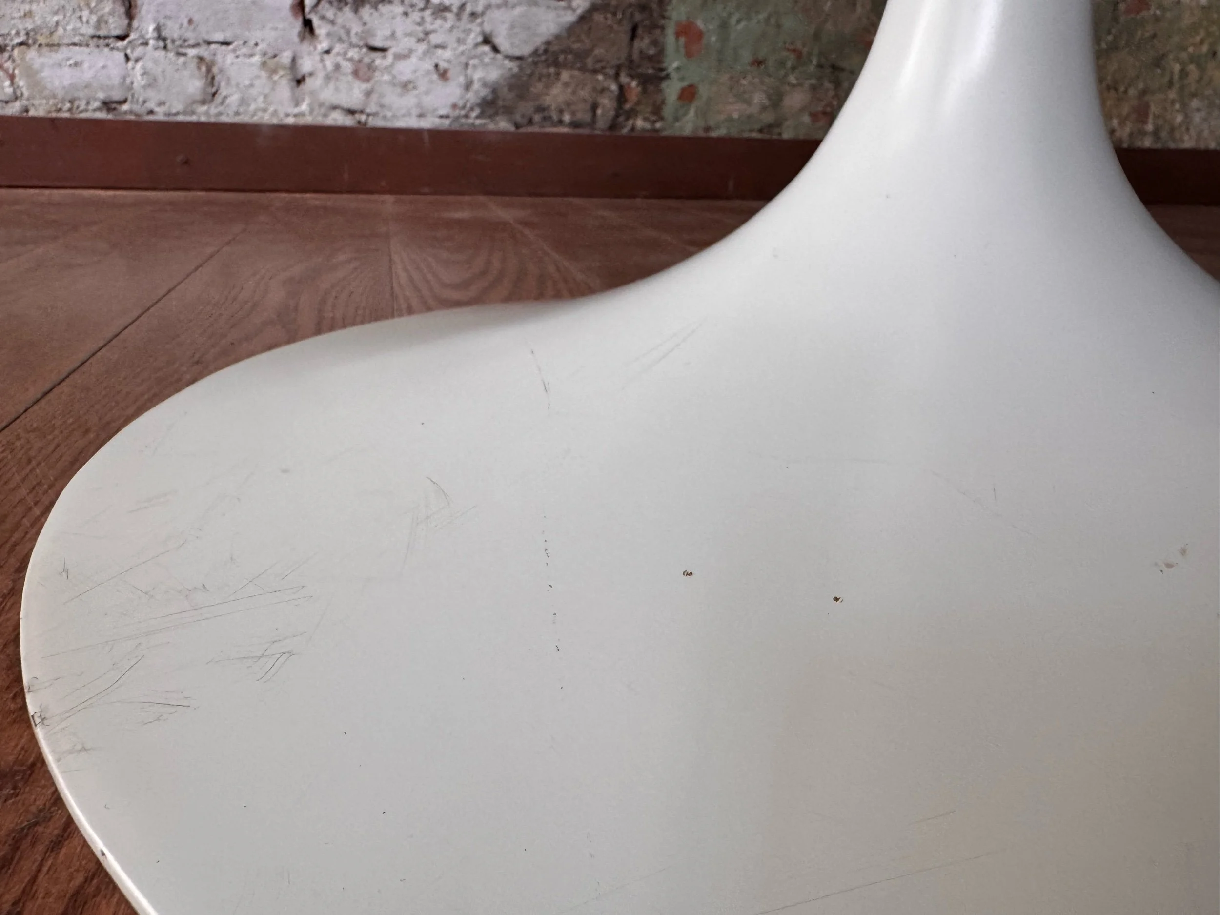 Good vintage condition consistent with age and use. The marble top shows several small edge chips and minor surface wear. The pedestal base has scattered scratches and small chips to the finish from normal use over time. These signs of wear are typical for an early example and do not detract from the table’s structural integrity or iconic presence.