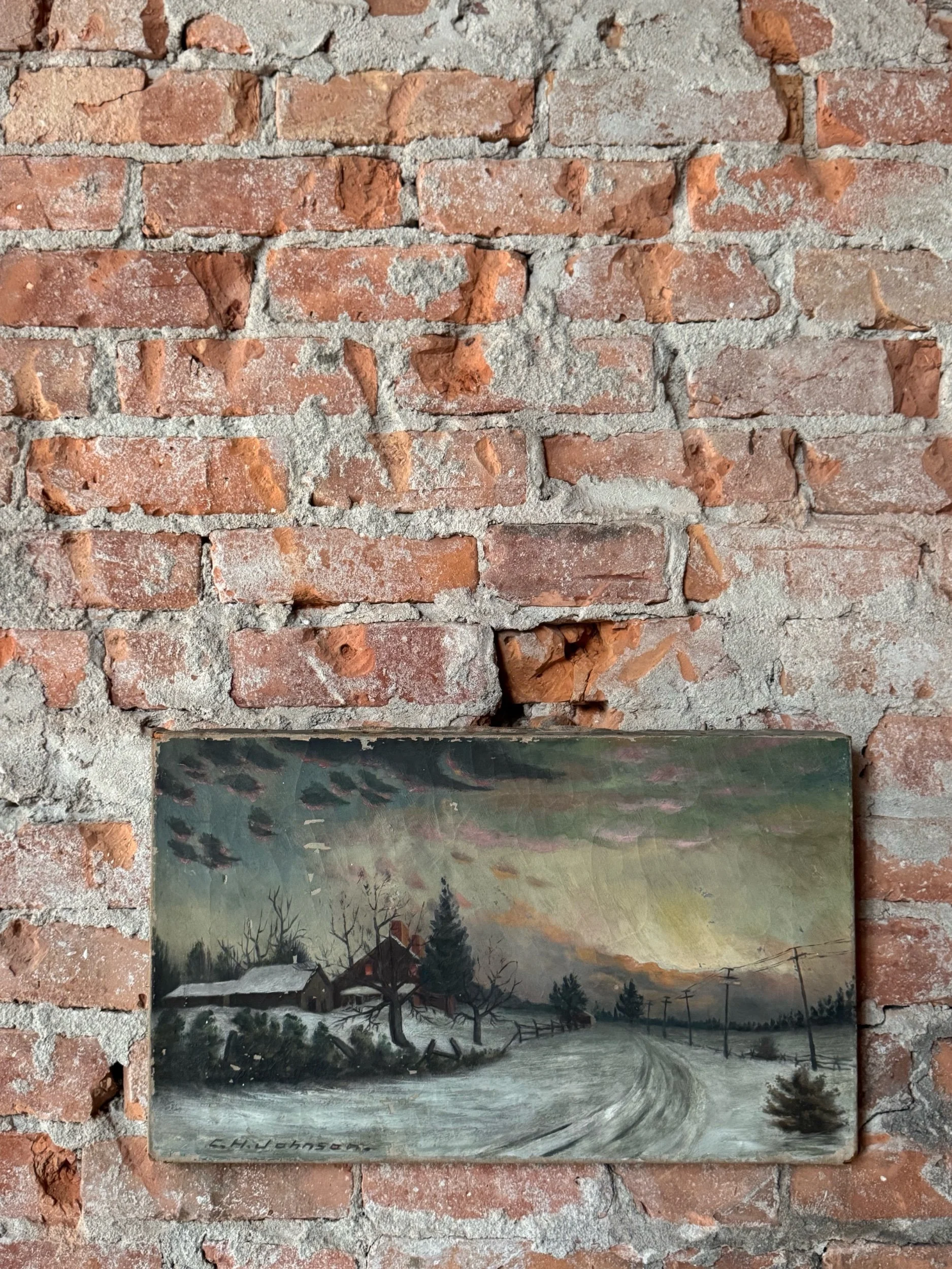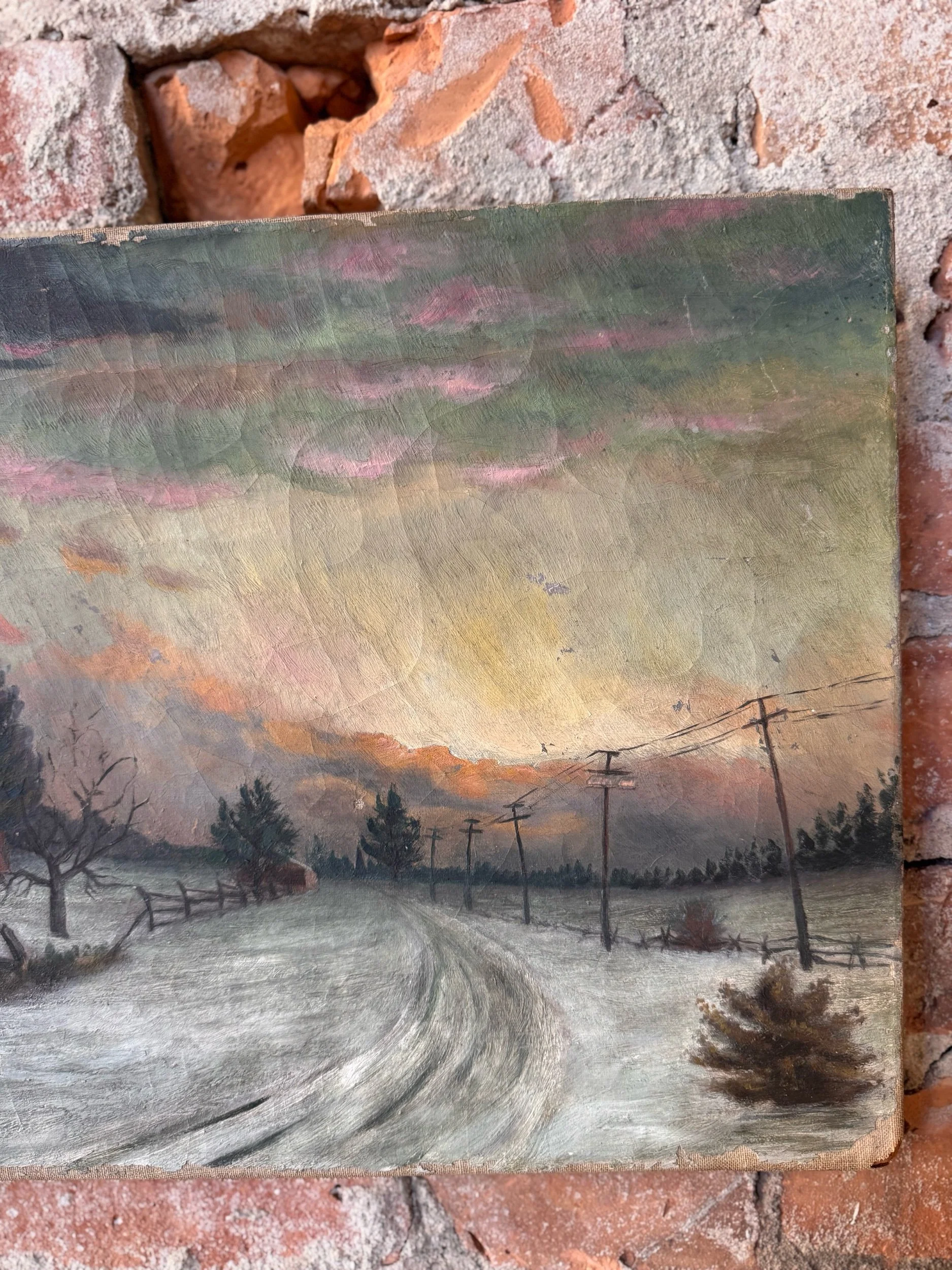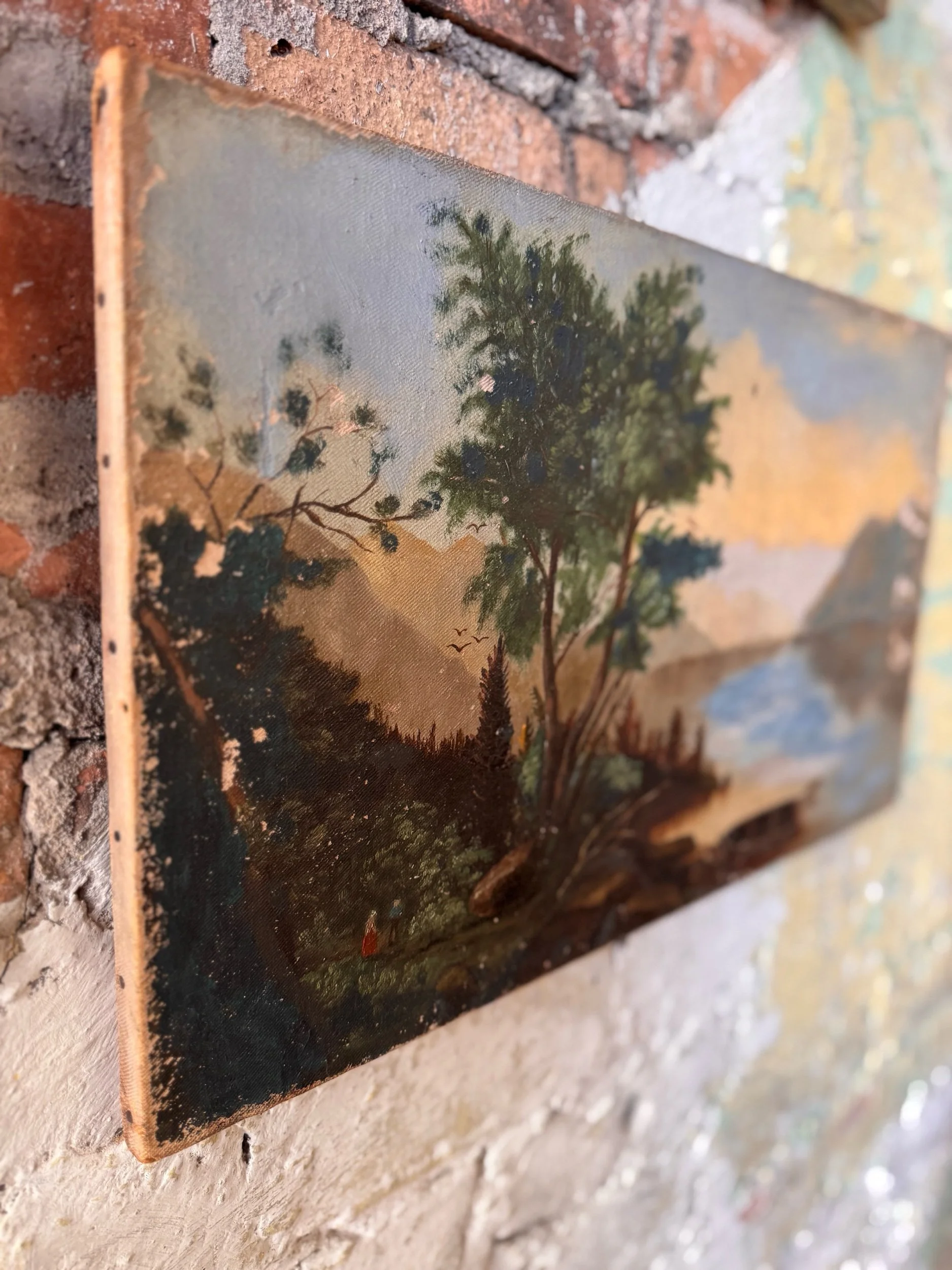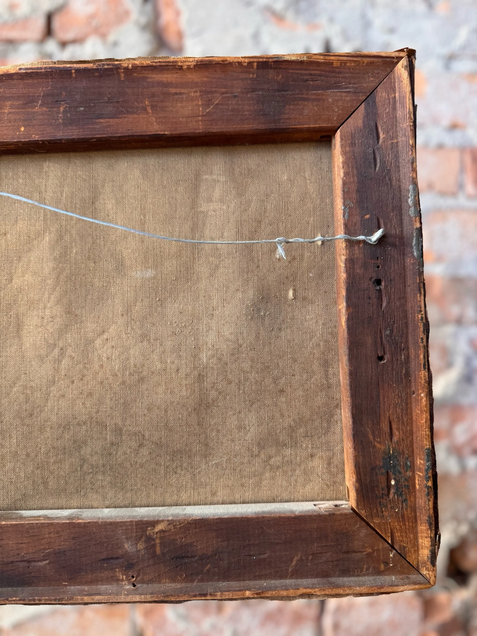 Painted on canvas and presented in a simple wooden frame, the piece shows wear consistent with age, adding to its character and timeworn appeal. A beautiful decorative painting with warmth and history, perfect for layering into a gallery wall or adding depth to a quiet corner.