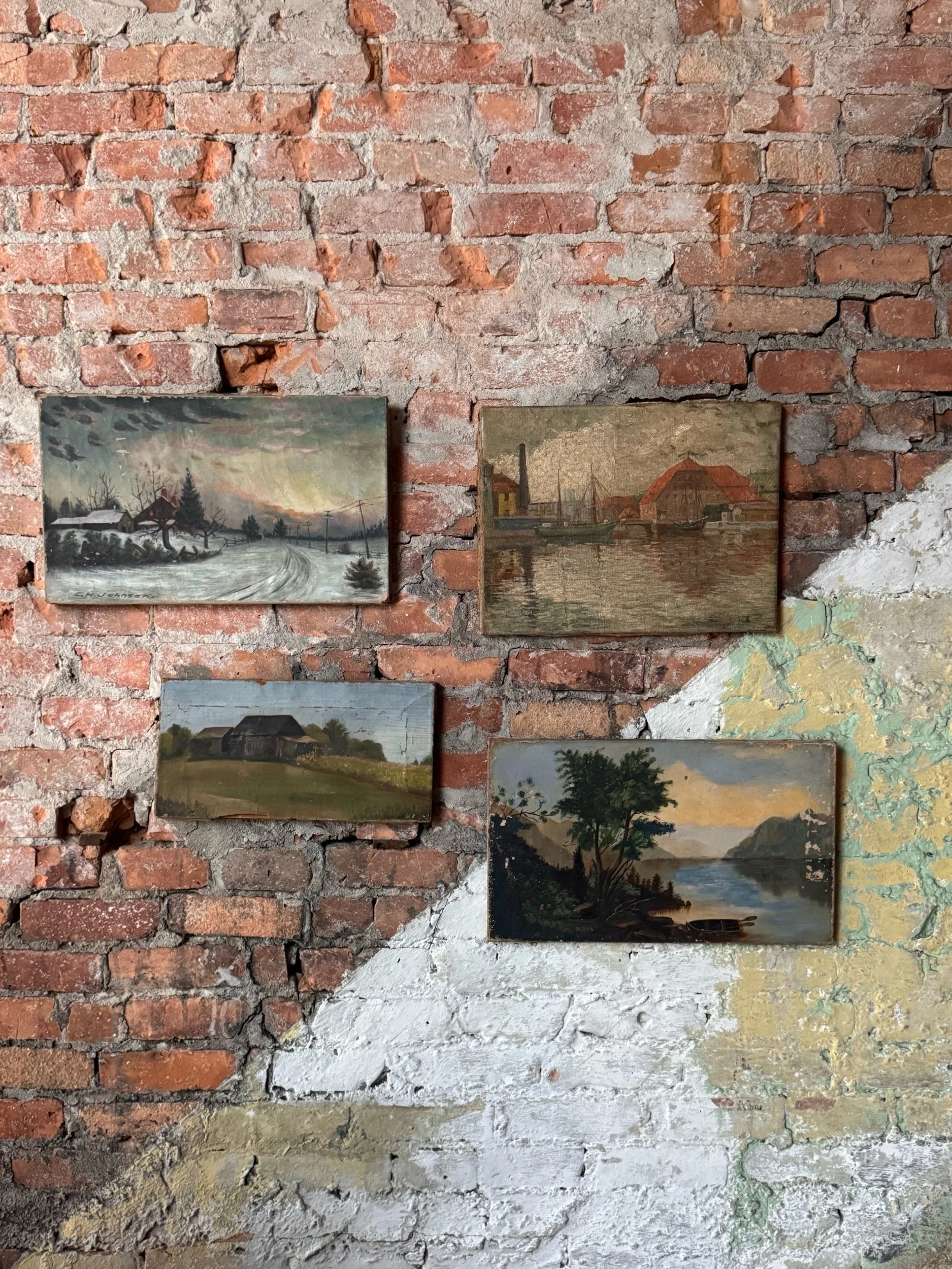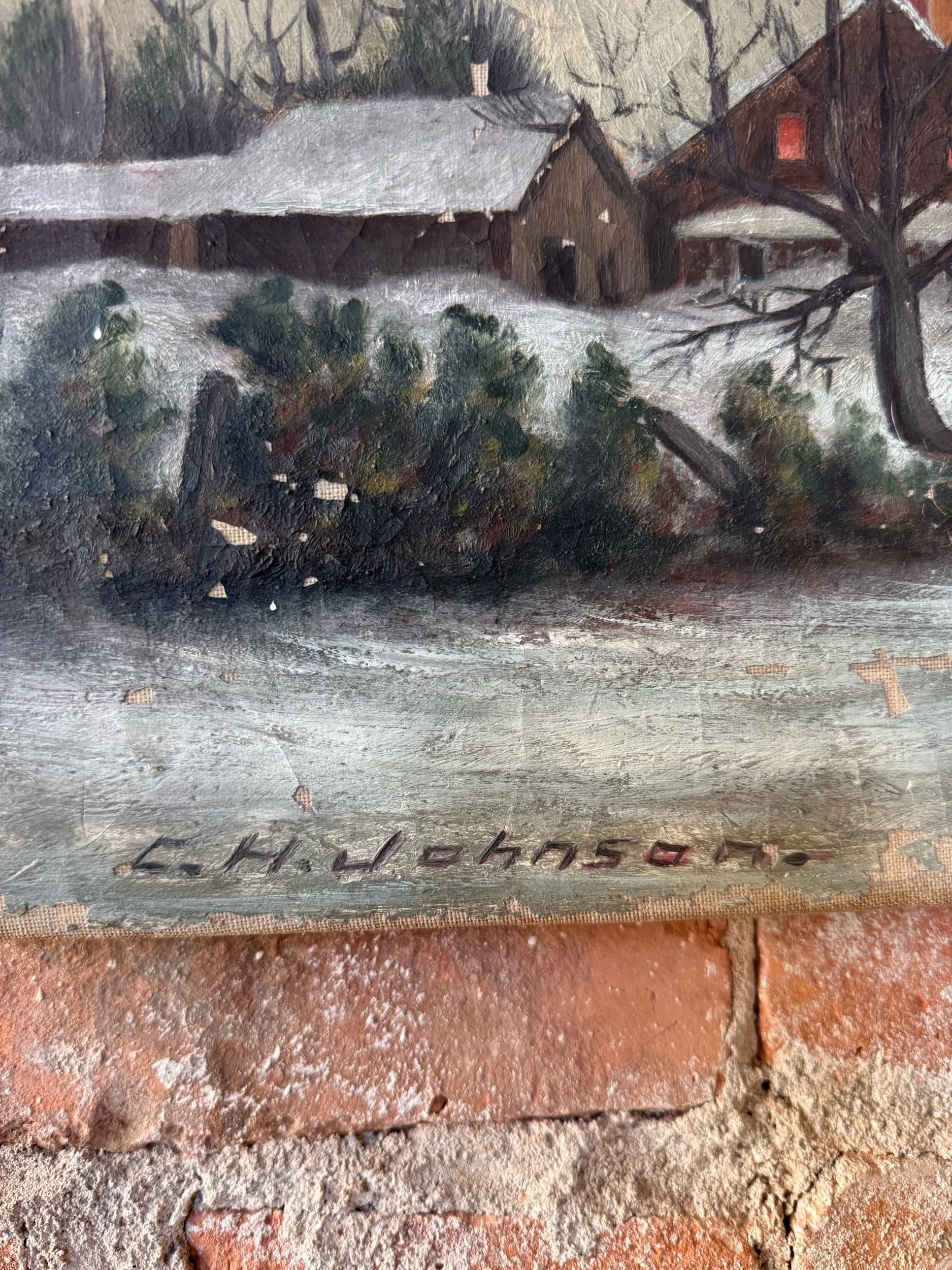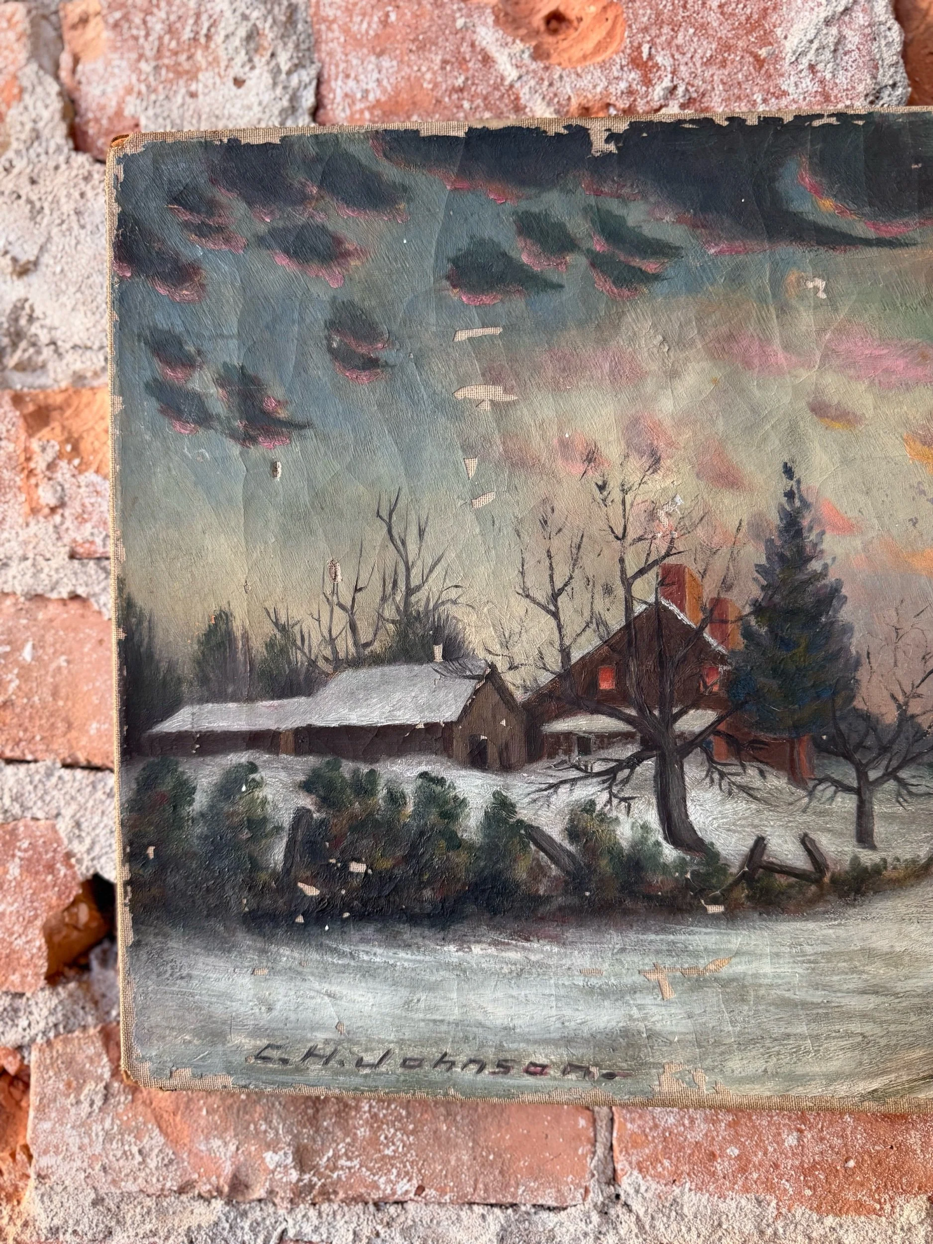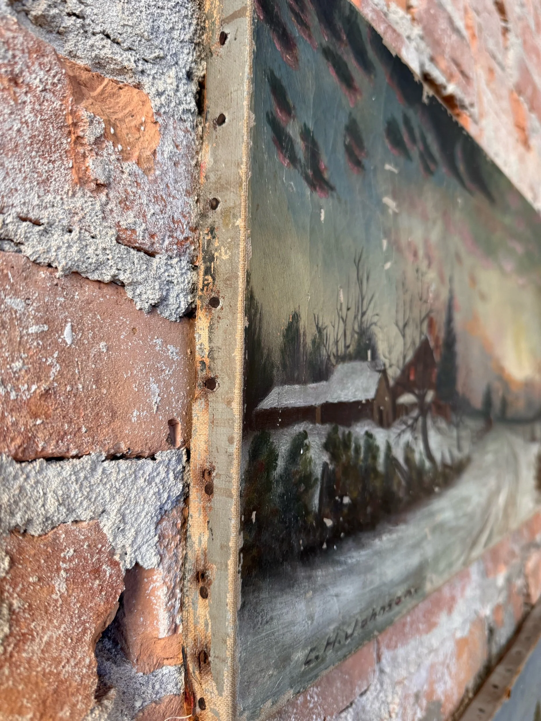 Painted on canvas and presented in a simple wooden frame, the piece shows wear consistent with age, adding to its character and timeworn appeal. A beautiful decorative painting with warmth and history, perfect for layering into a gallery wall or adding depth to a quiet corner.