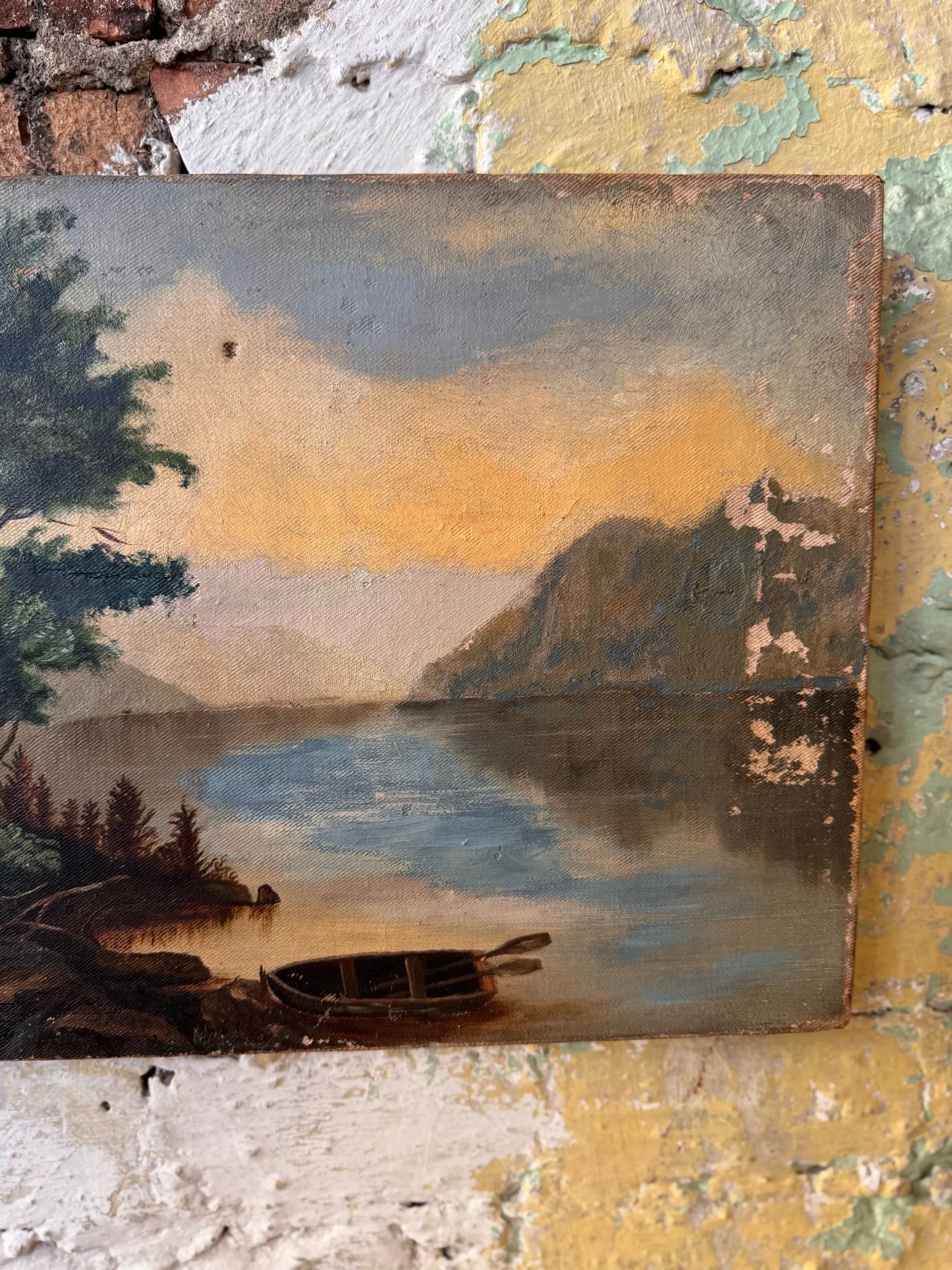 A charming early 20th century European landscape oil painting on canvas, featuring a quiet lakeside scene framed by tall trees, distant mountains, and a small rowboat resting along the shore. The soft palette and atmospheric light capture the calm beauty of the countryside, evoking the romantic landscape traditions popular throughout Europe in the late 19th and early 20th centuries.