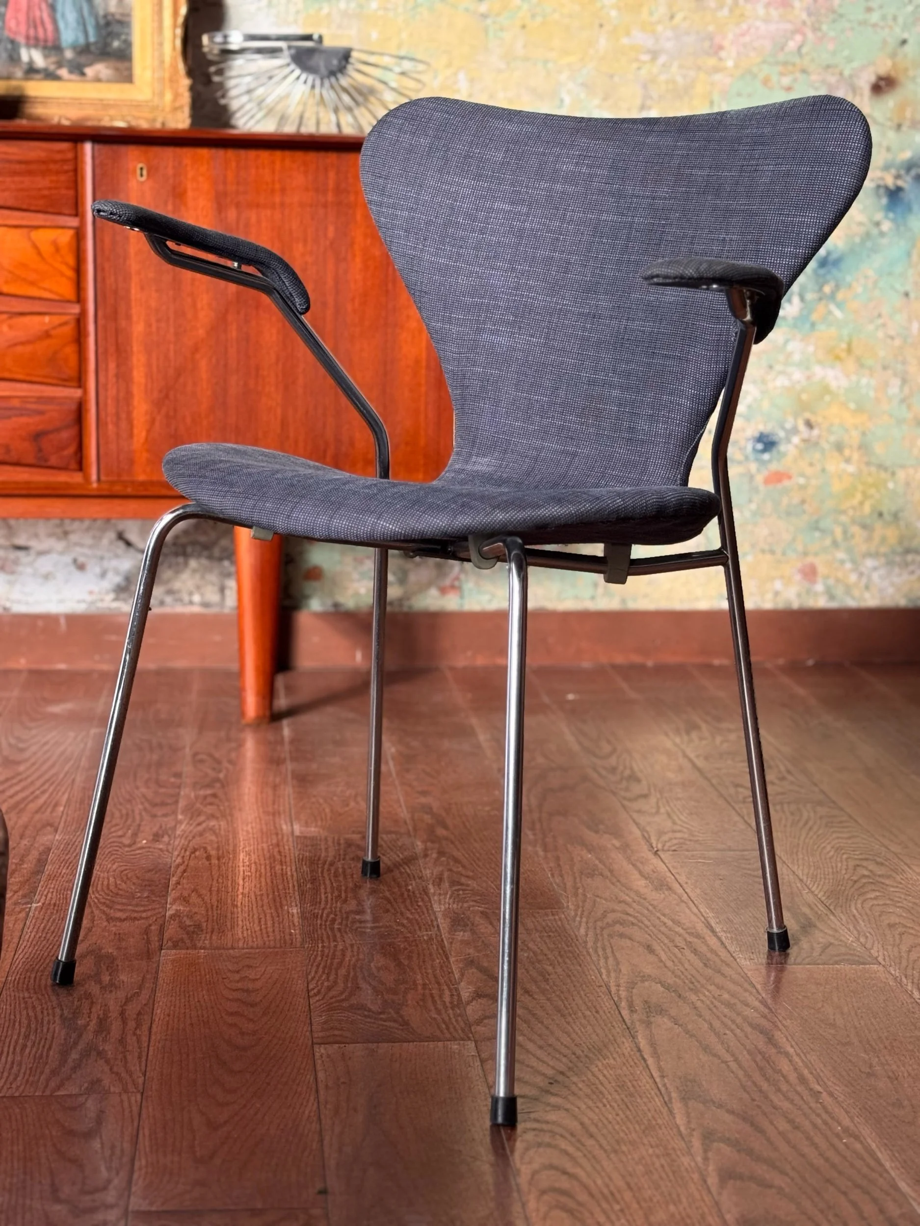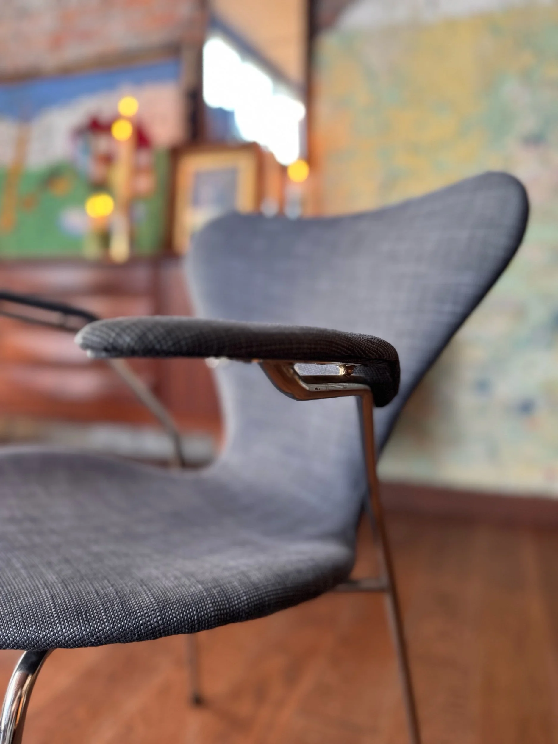 This chair is believed to be an authentic Fritz Hansen production based on construction, proportions, and hardware. No maker’s label or stamp is present, which is not uncommon as original labels can detach over time. The chair has been reupholstered, obscuring any potential original markings on the shell.