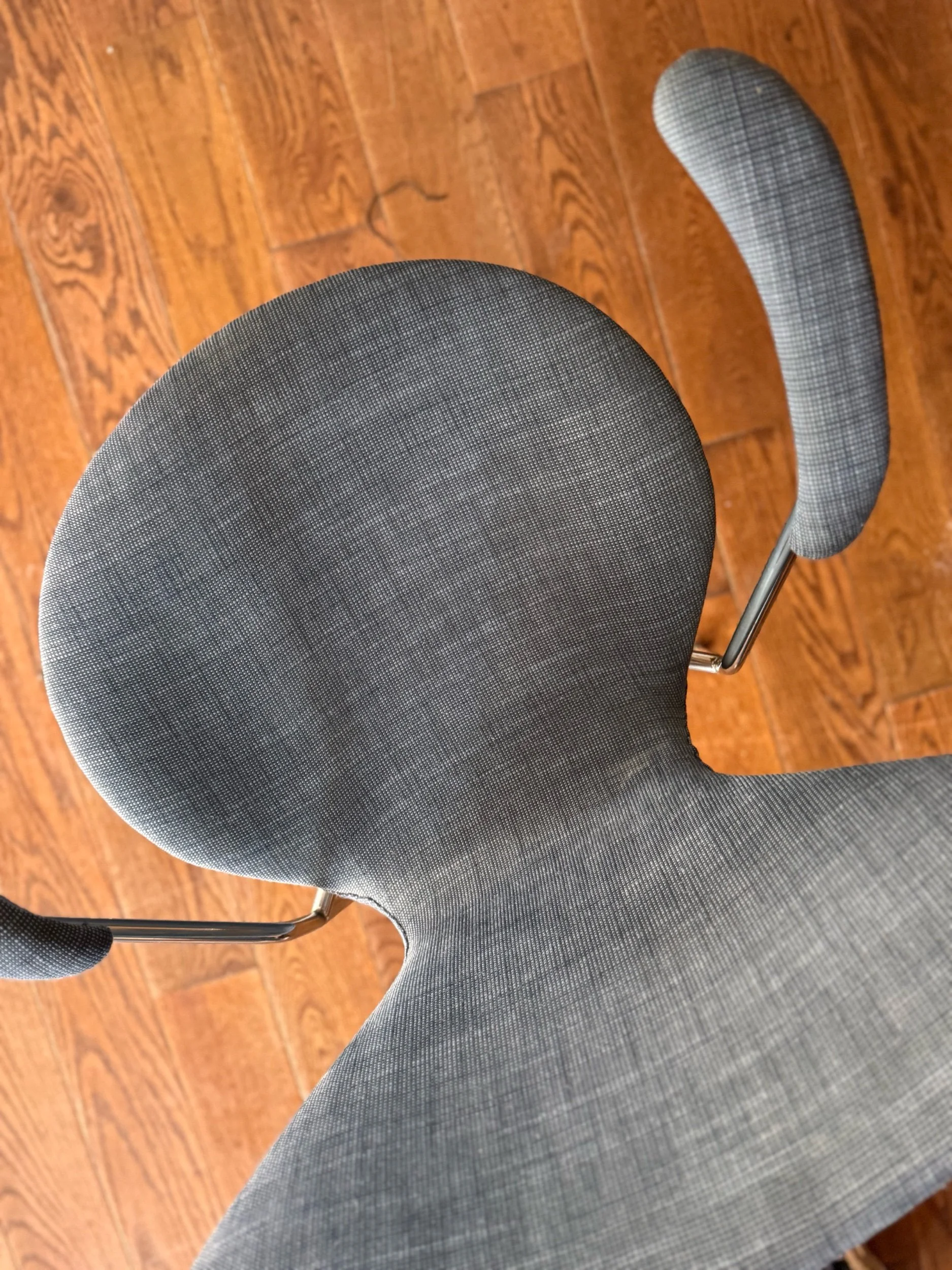 This example is the desirable armchair version (Model 3207), featuring a chrome tubular steel base with integrated arm supports and a fully upholstered shell. The chair has been professionally reupholstered in a charcoal-gray woven textile that complements both modern and traditional interiors while highlighting the chair’s elegant silhouette.